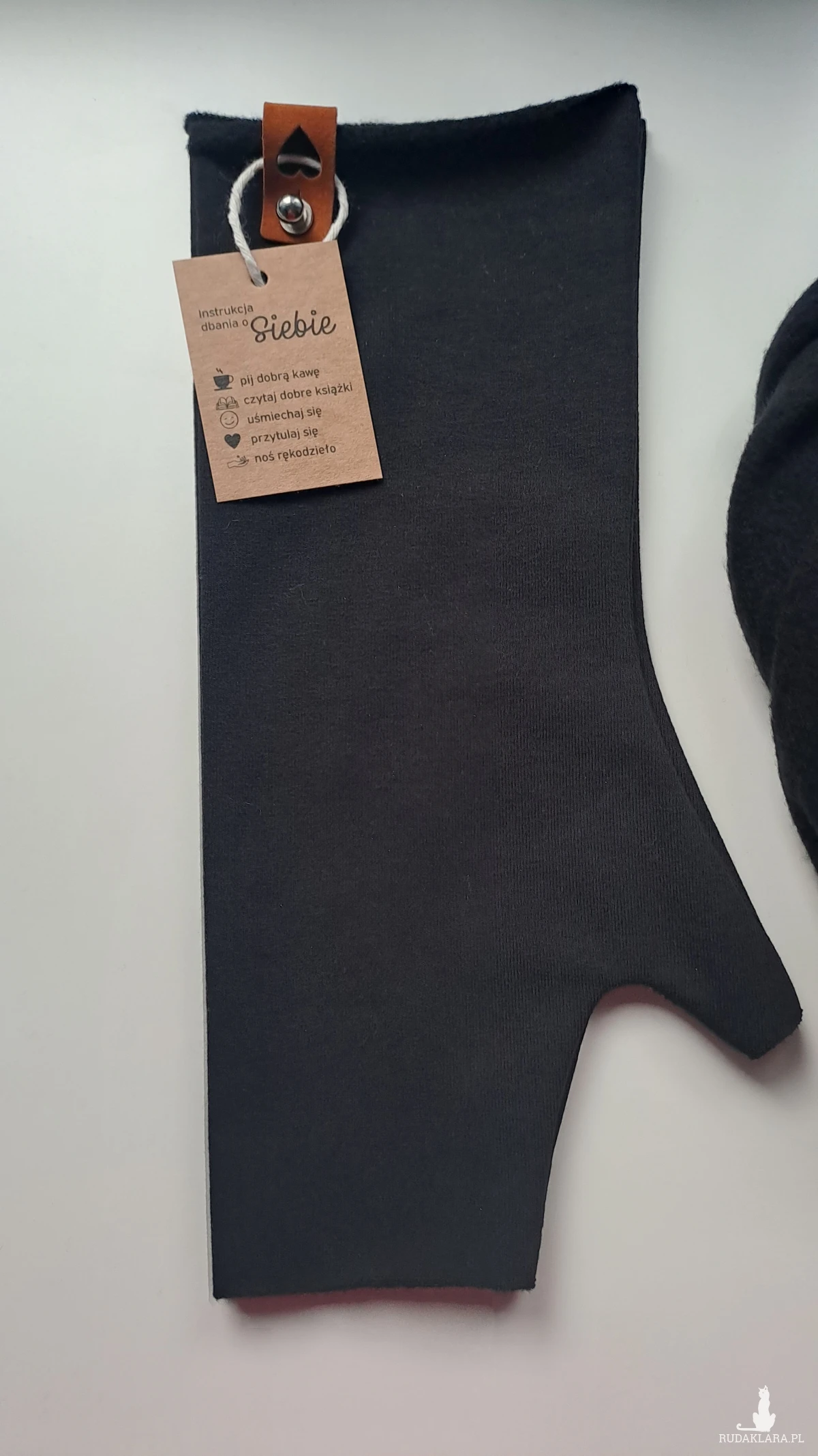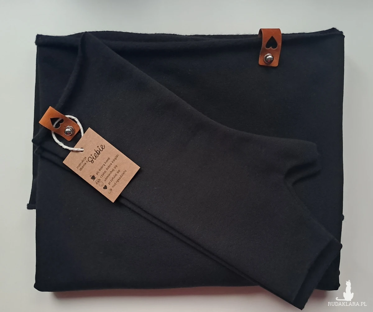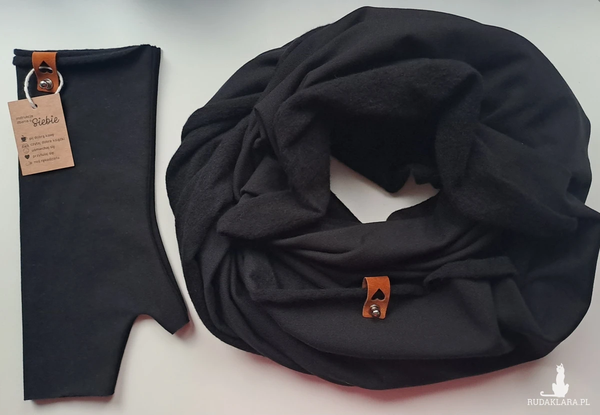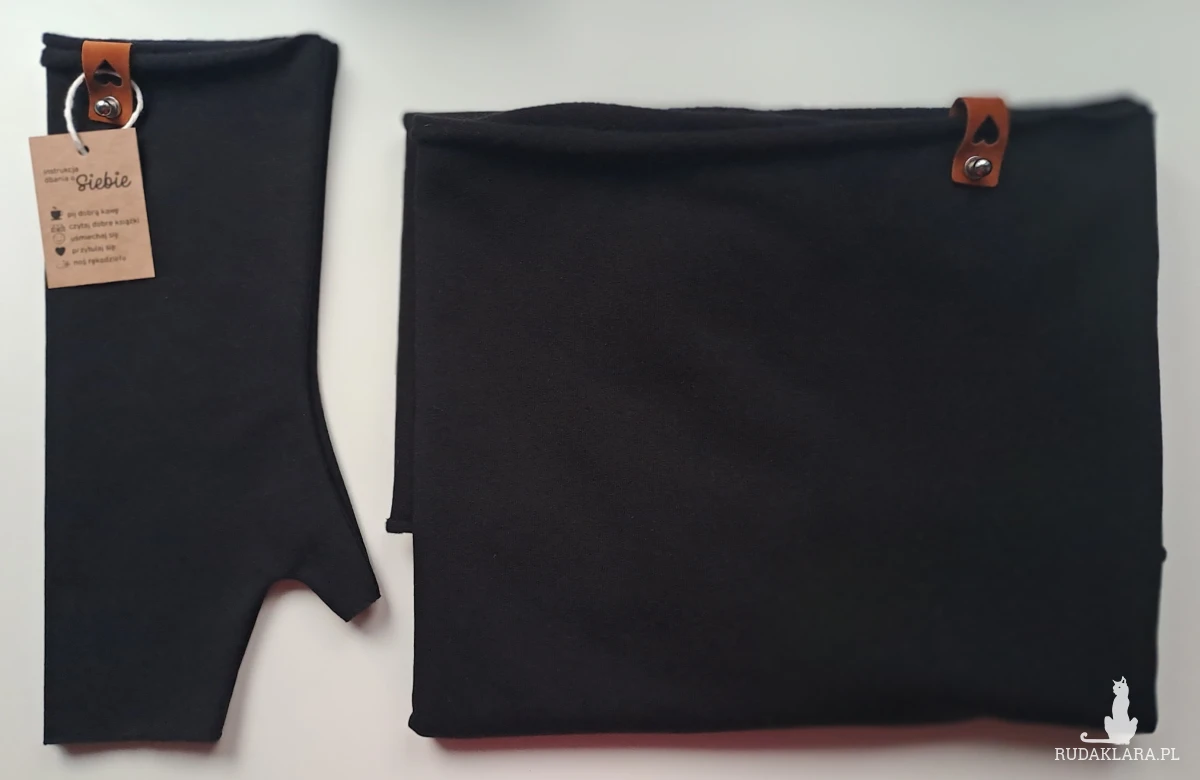 Komplet jest uszyty z dresówki drapanej o gramaturze 270. Ta miękka I przyjemna dzianina z delikatnym meszkiem od wewnątrz ogrzeje Cię w chłodne jesienne dni. Mitenki mają długość 29cm, obwód dłoni 18cm. Komin ma wysokość 60cm i obwód 140 cm.