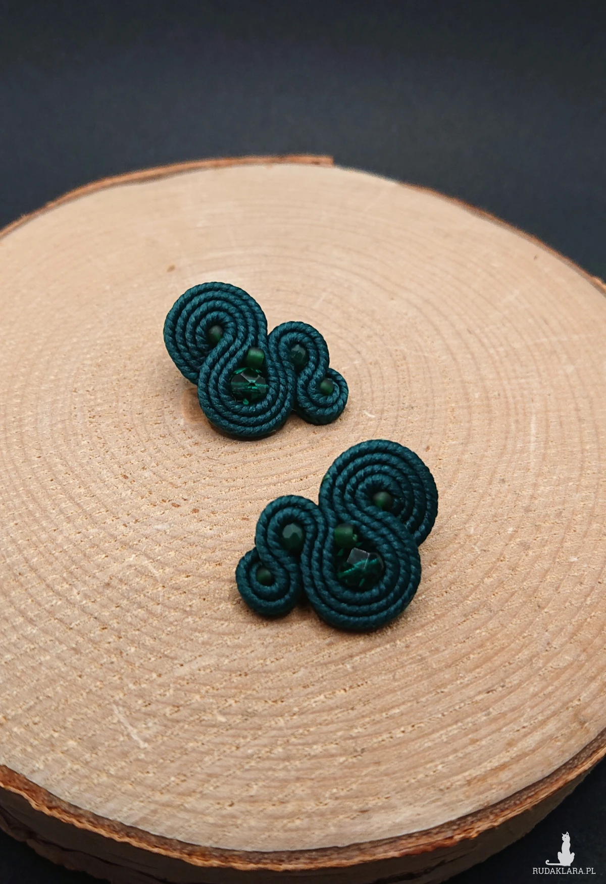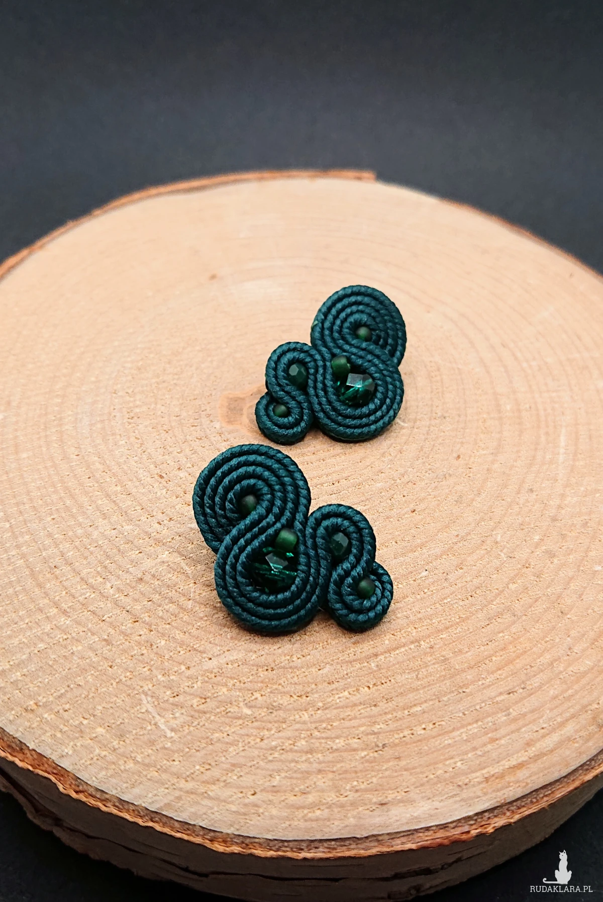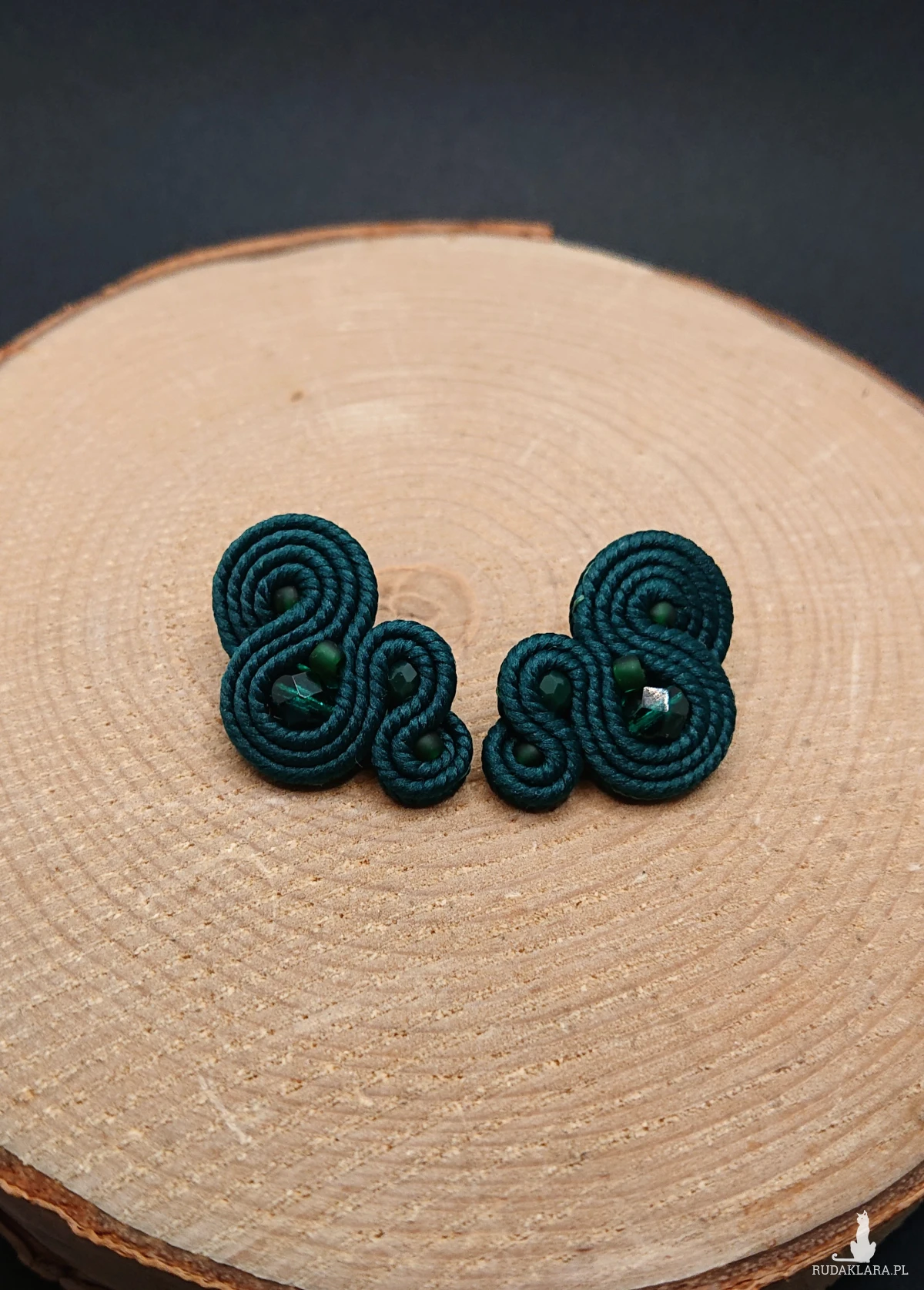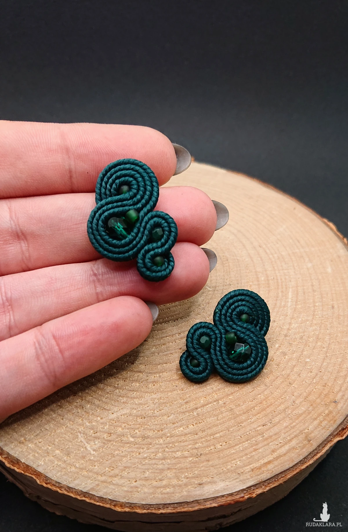 Niewielkie kolczyki sutasz wykonane z szklanych koralików oraz polskich sznurków sutasz. Kolory w kolczykach: ciemny zielony. Kolczyki zamocowane na sztyftach ze stali chirurgicznej.