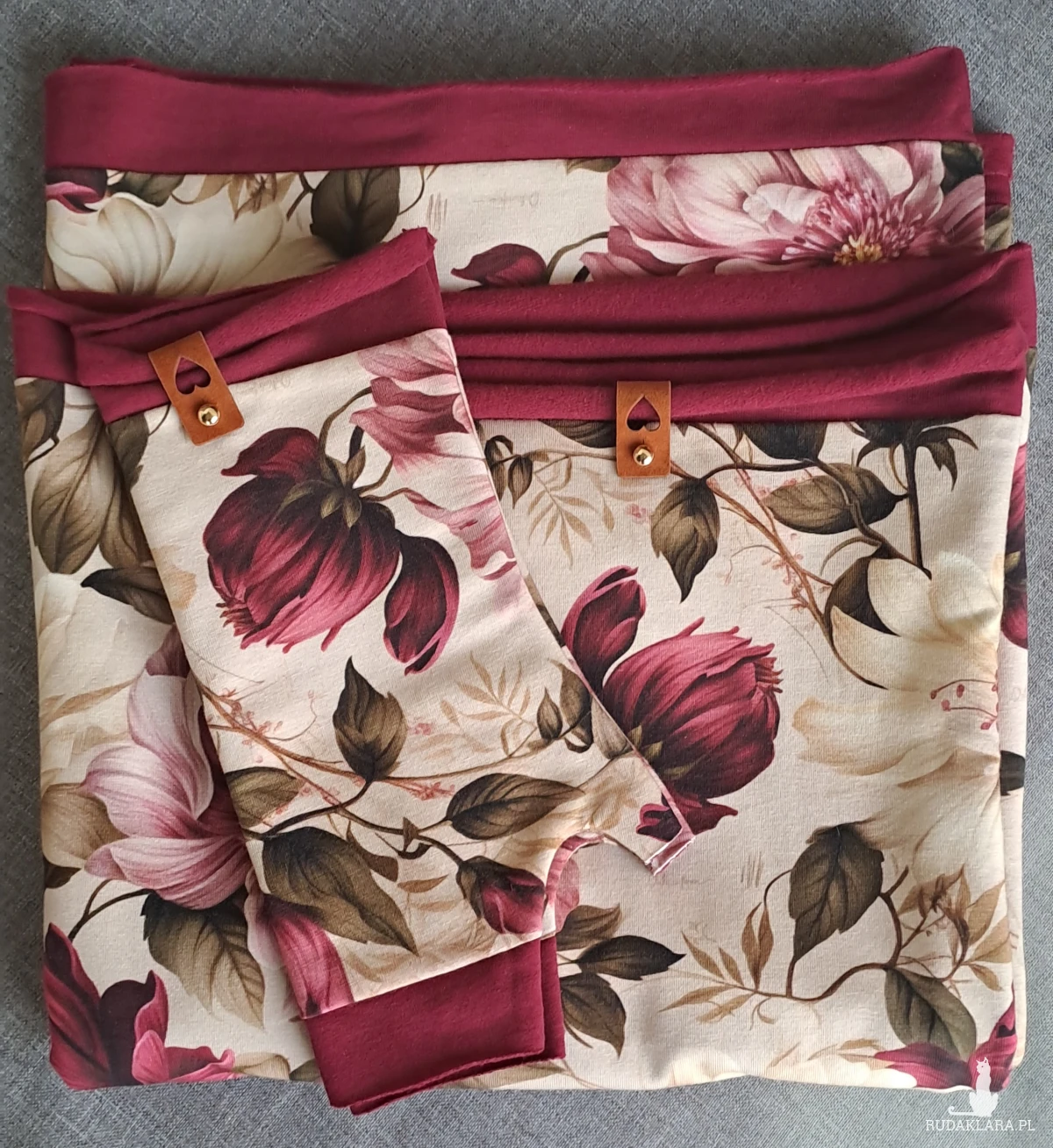 Komplet jest uszyty z dresówki drapanej o gramaturze 270. Ta miękka i przyjemna dzianina z delikatnym meszkiem od wewnątrz ogrzeje Cię w chłodne jesienne dni. Wymiary komina wysokość 64cm, obwód 150cm. Mitenki mają długość 30cm, obwód dłoni 18-19cm.