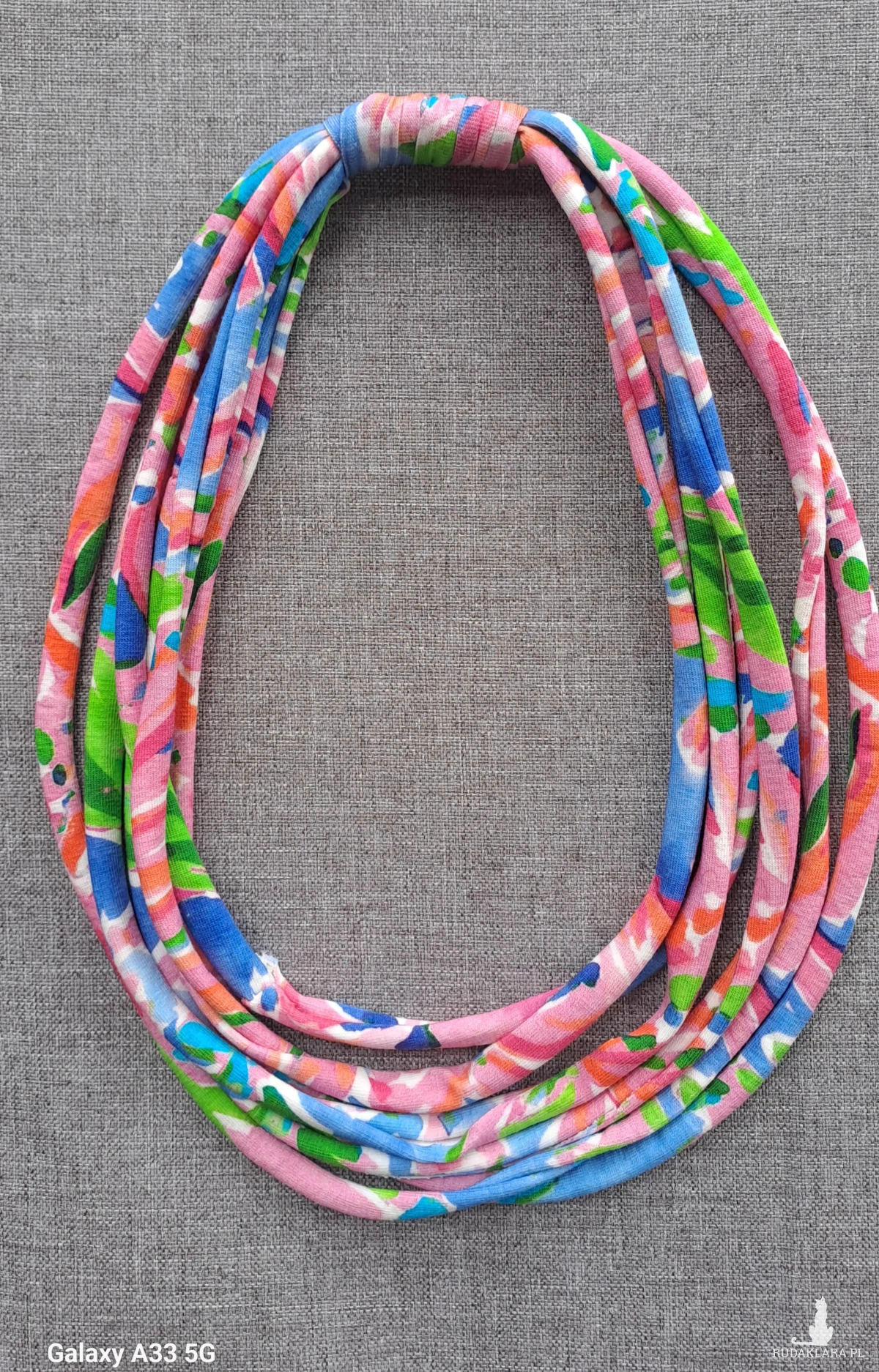Taki naszyjnik z jerseyu wyróżni Cię w tłumie. Świetnie pasuje czy to do romantycznych długich i zwiewnych sukienek czy do zwykłych bluzek i dżinsów. Wykonany został z bawełny dlatego jest przyjemny dla ciała.
