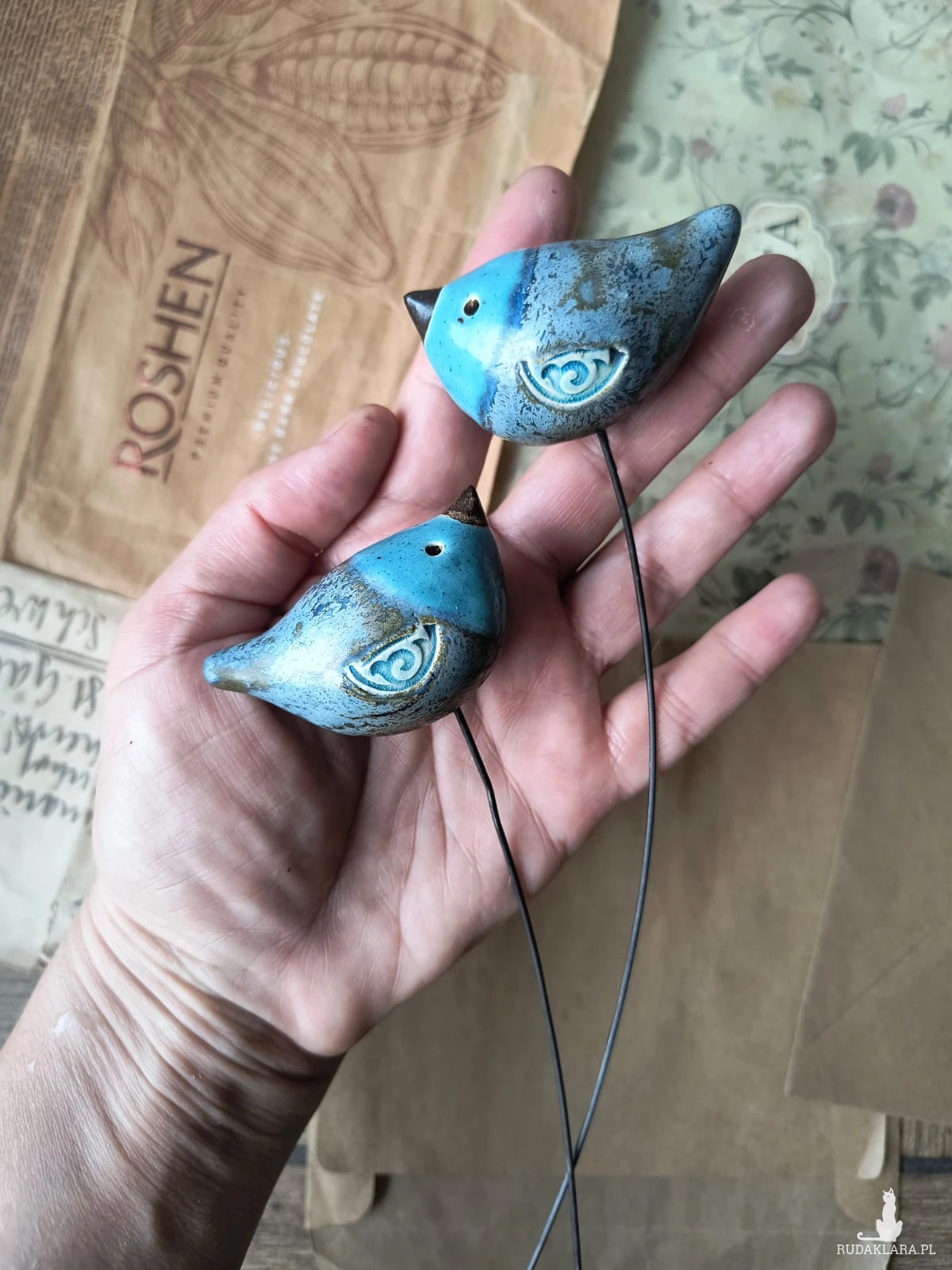 Komplet ptaszków ceramicznych na piku, wykonanych z gliny szamotowe, wypalonych na biskwit, a następnie szkliwionych w temp. ok 1260 stopni C. Wymiary 6 cm x 5,5 cm. Do postawienia na półeczce, lustrze lub jako przycisk do papieru czy serwetek. Dostępne również osobno. Serdecznie polecam!!!