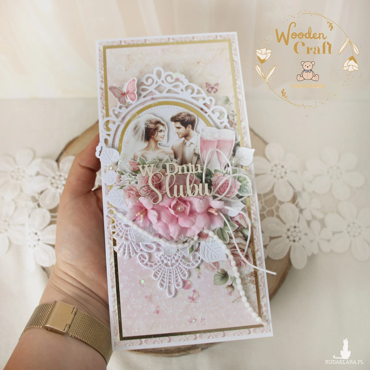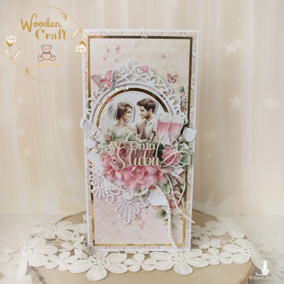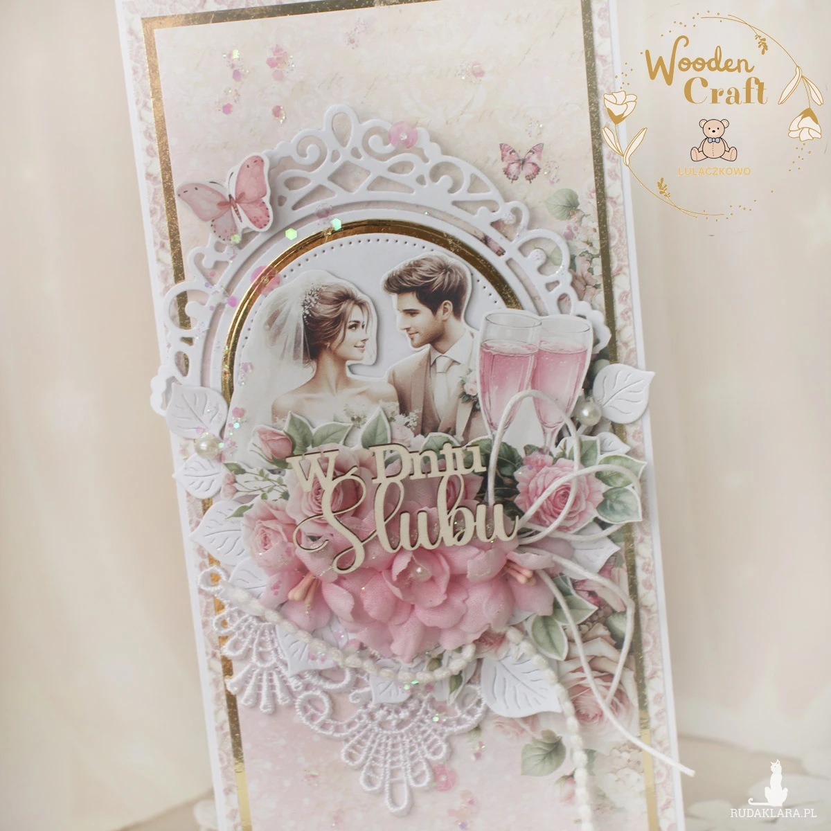 Romantyczna i elegancka kartka ślubna, utrzymana w odcieniach różu, beżu i bieli z dodatkiem błyszczących złotych akcentów. Bogato zdobiona, wykonana ręcznie z dbałością o każdy szczegół z cudownej kolekcji papierów "Today". Kartka ozdobiona grafiką Pary Młodej, otoczona ażurową rameczką, kompozycją kwiatową z ręcznie robionymi materiałowymi kwiatami, zdobiona perełkami, cekinami, a także tekturkowym napisem "W Dniu Ślubu".