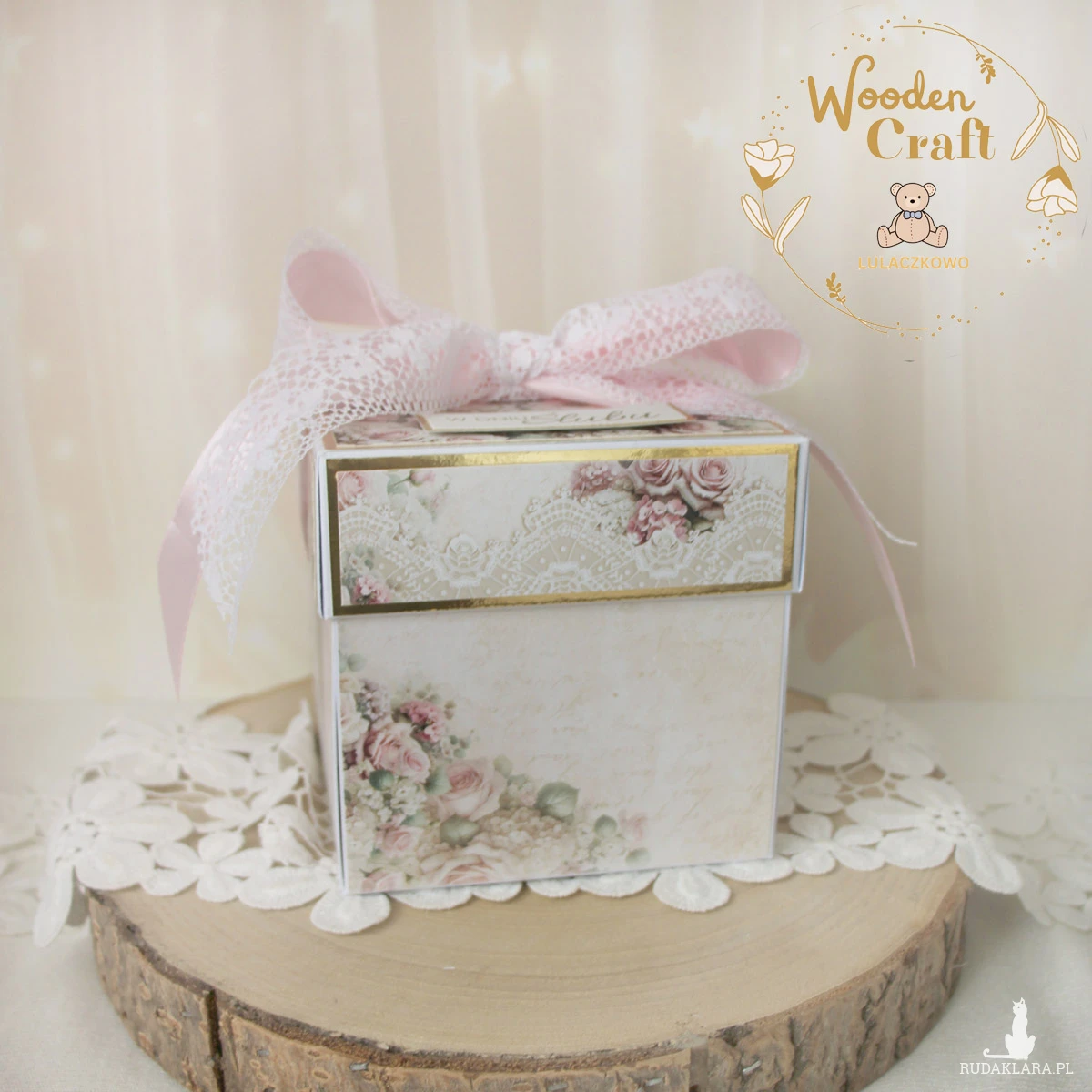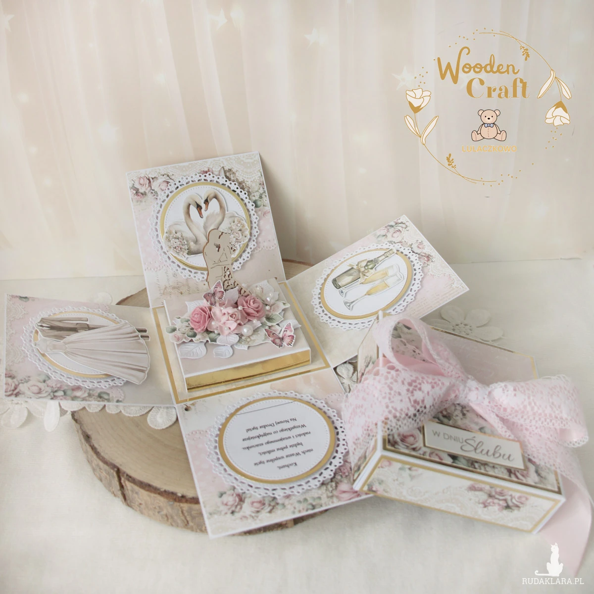 Przepiękny, romantyczny exploding box ślubny, utrzymany w odcieniach beżu, delikatnego różu i bieli z dodatkiem złotych błyszczących akcentów. Box wykonany z dbałością o każdy detal, z przepięknej kolekcji papierów "Today". Wieczko ozdobione koronkową kokardą oraz napisem "W Dniu Ślubu". W środku znajduje się prześliczna tekturka 3D Para Młoda ozdobiona kompozycją z papierowych kwiatów, a pod nią umieszczone zostało mini pudełeczko do którego można włożyć prezent pieniężny. Na ściankach boxa znalazły się grafiki pary łabędzi, sukni ślubnej i garnituru, a także kieliszków i szampana oraz życzenia.