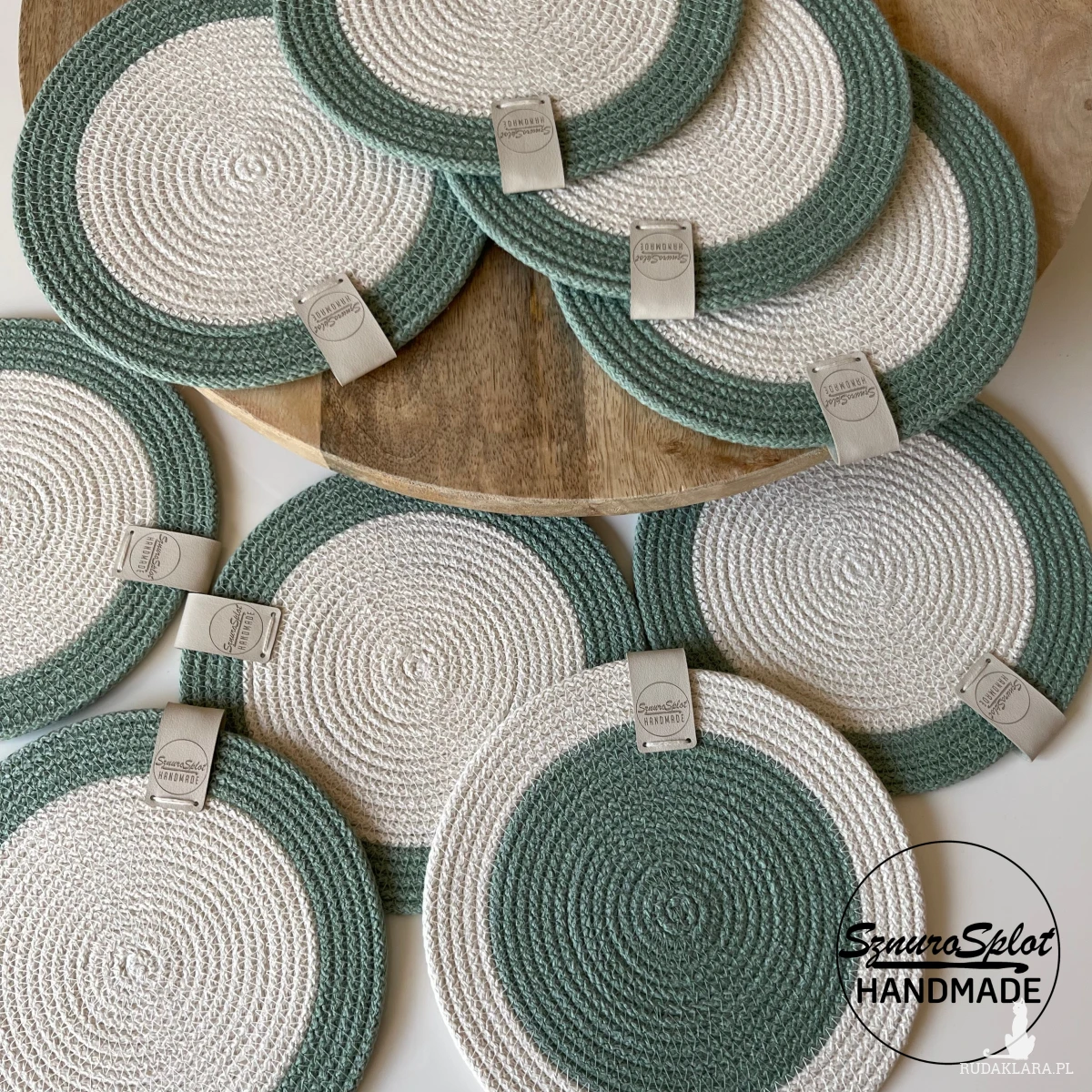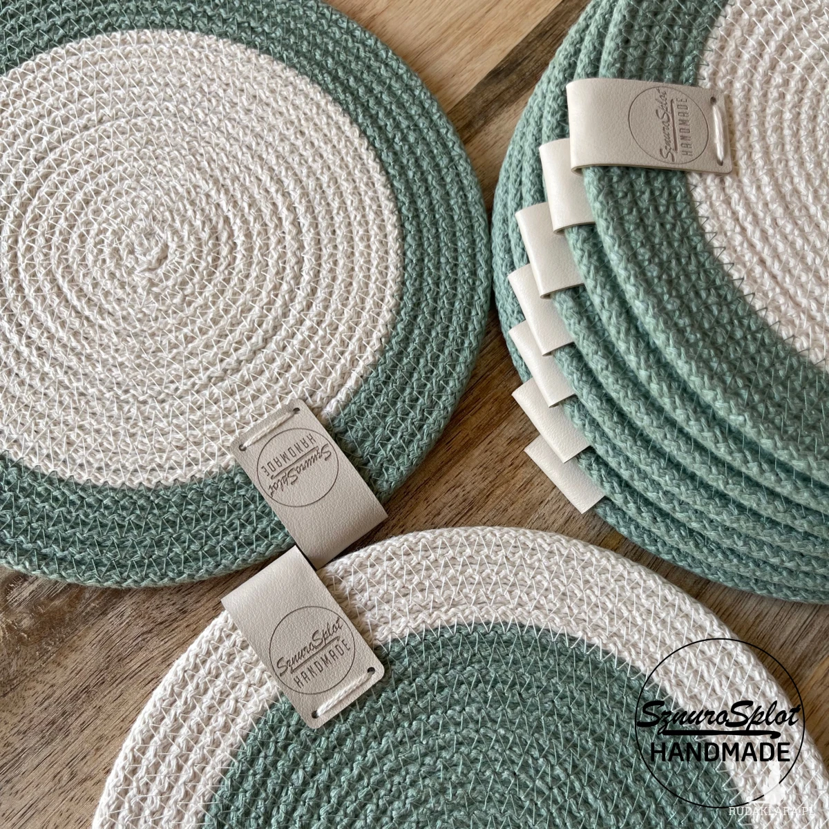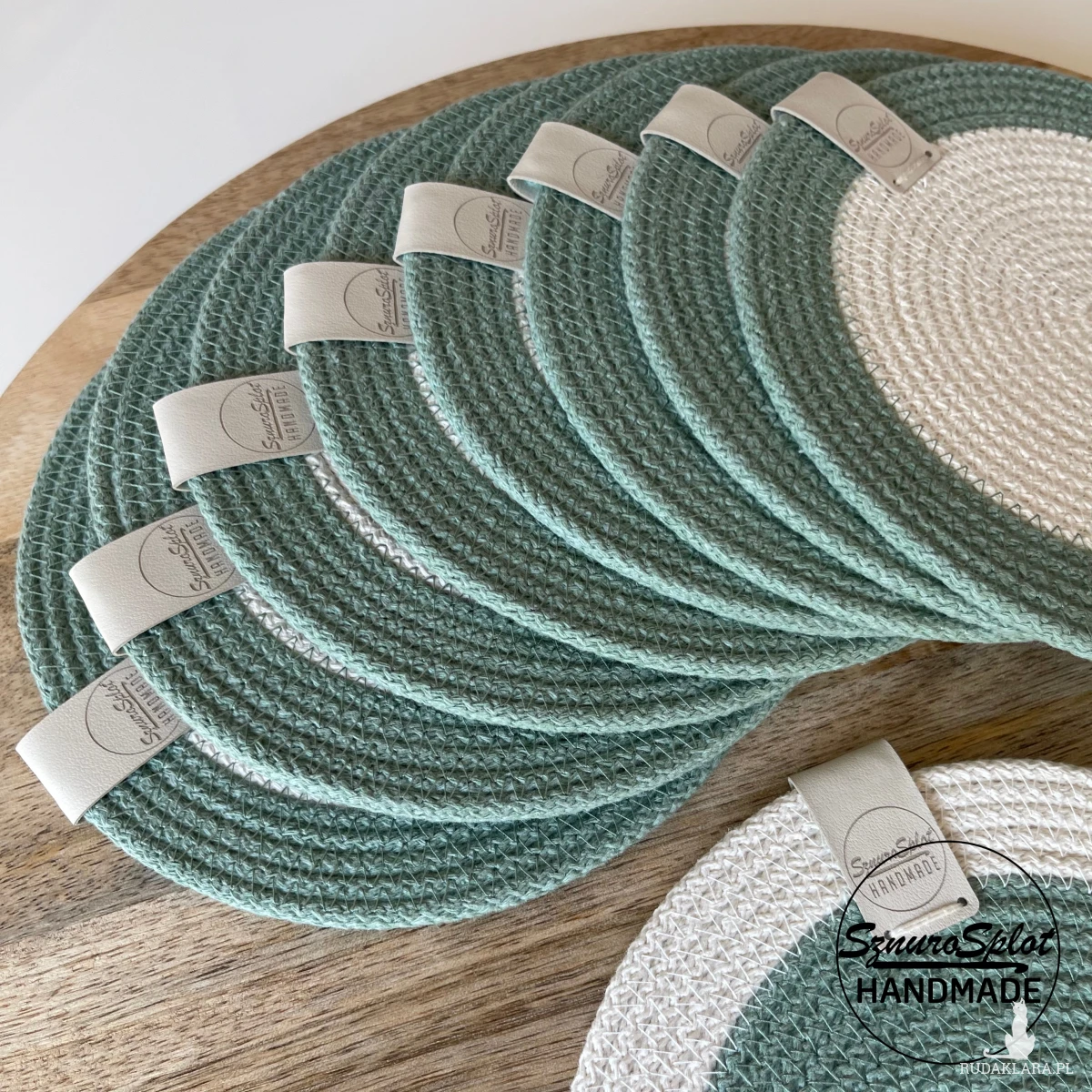 Komplet dwukolorowych podkładek uszytych ze sznurka bawełnianego. Wymiar średnicy 17 cm jest odpowiedni pod talerzyk deserowy.
