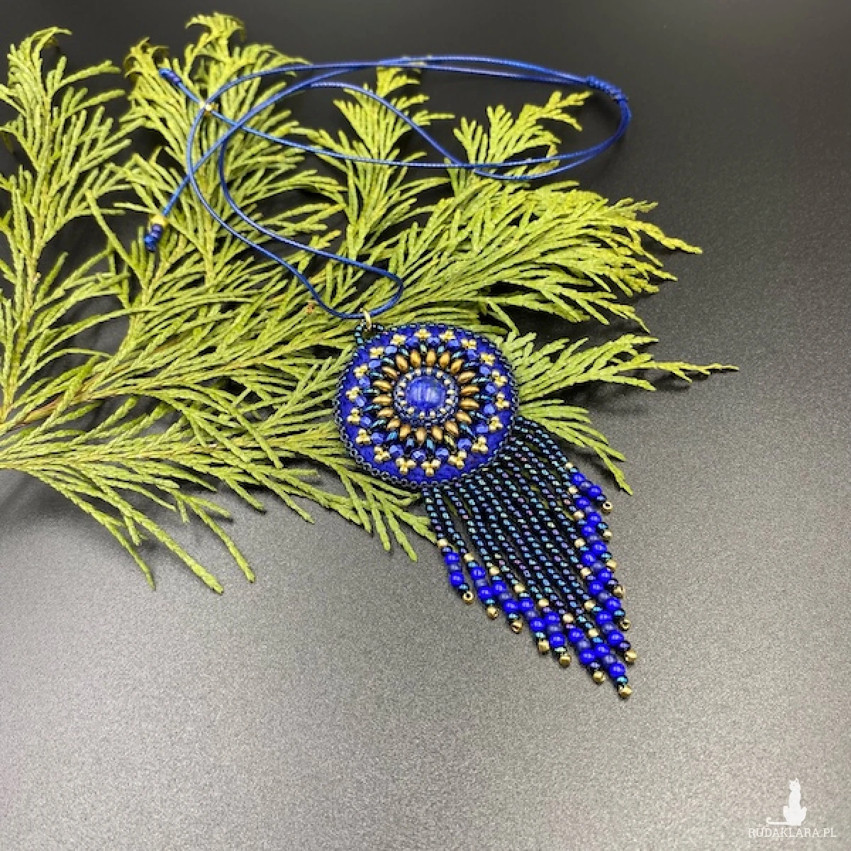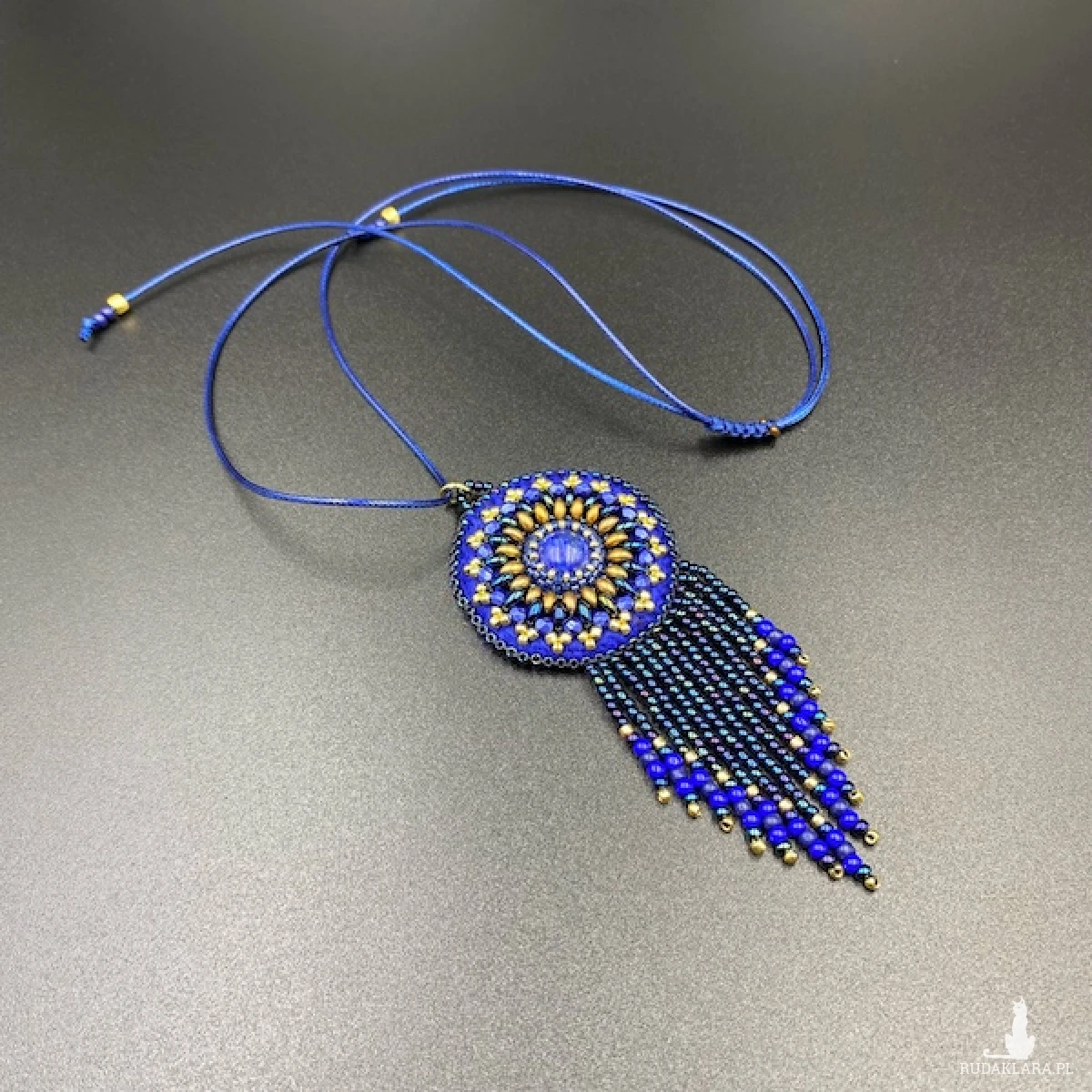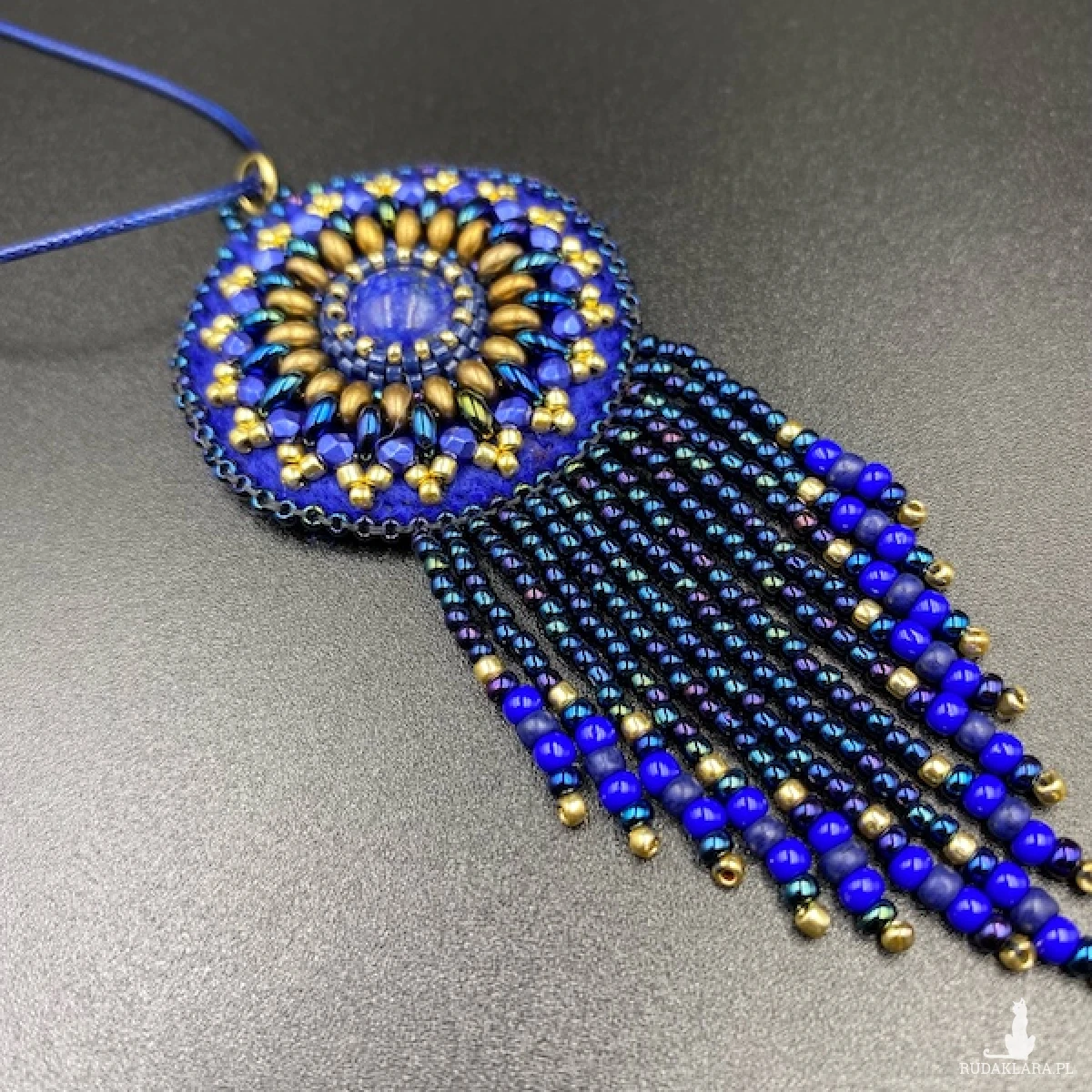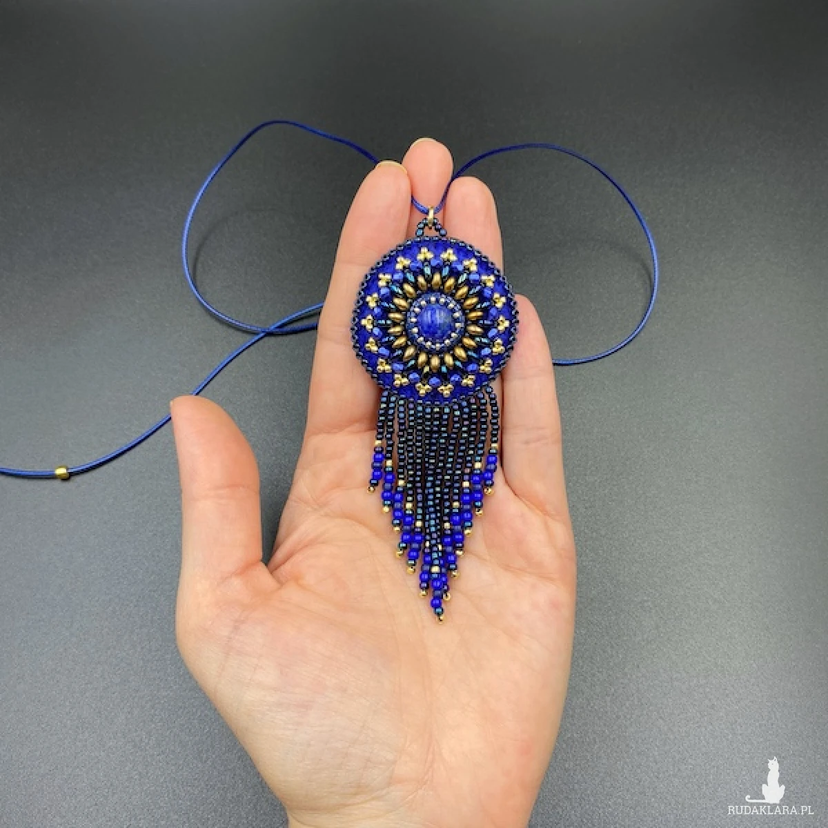 Mini wisiorek został wykonany techniką haftu koralikowego w 100% wyszyty ręcznie i zakończony ozdobnymi frędzelkami. Centrum wisiorka to LAPIS LAZULI 12 cm.
