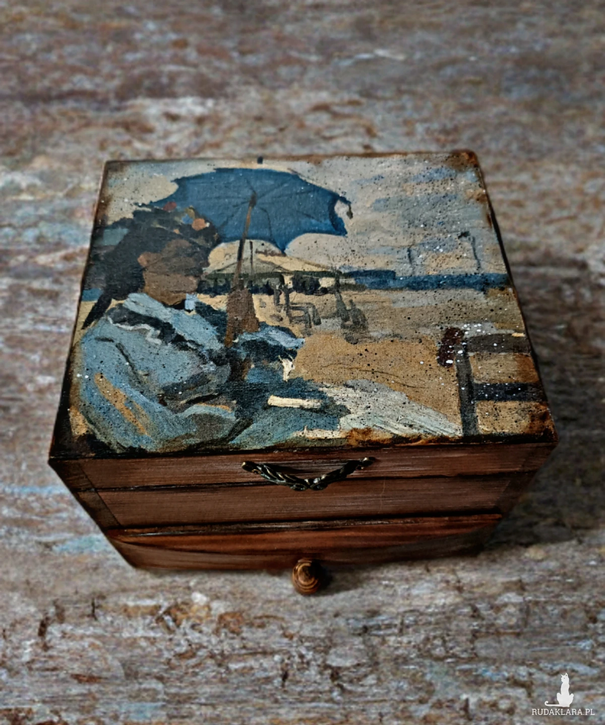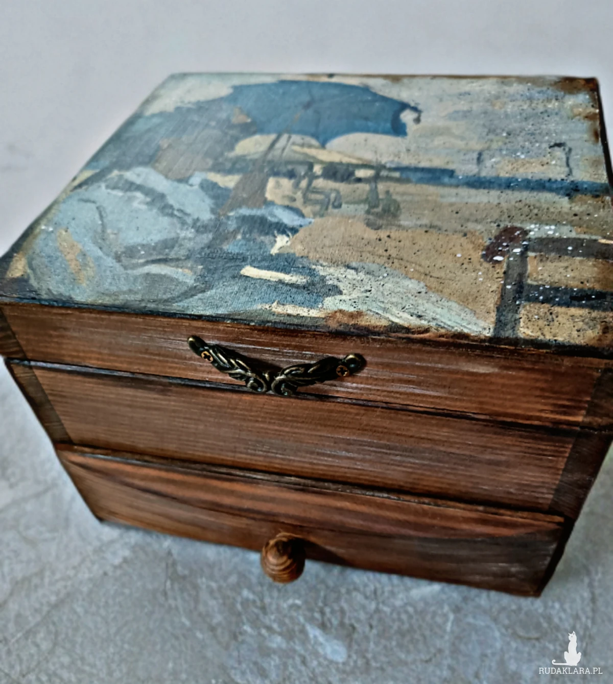 Drewniana skrzyneczka na biżuterię, z przegródkami, dodatkową szufladką i lusterkiem.
