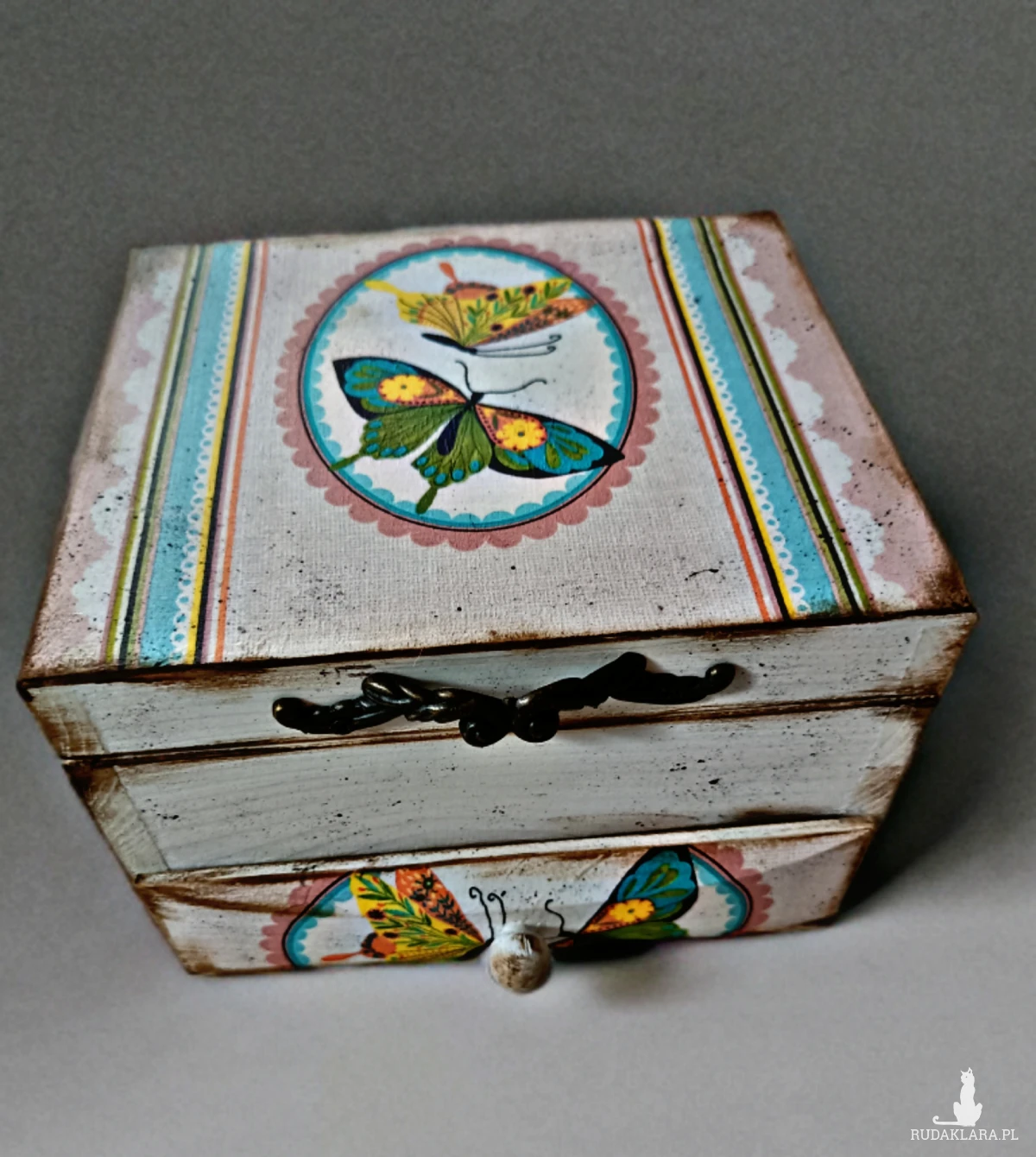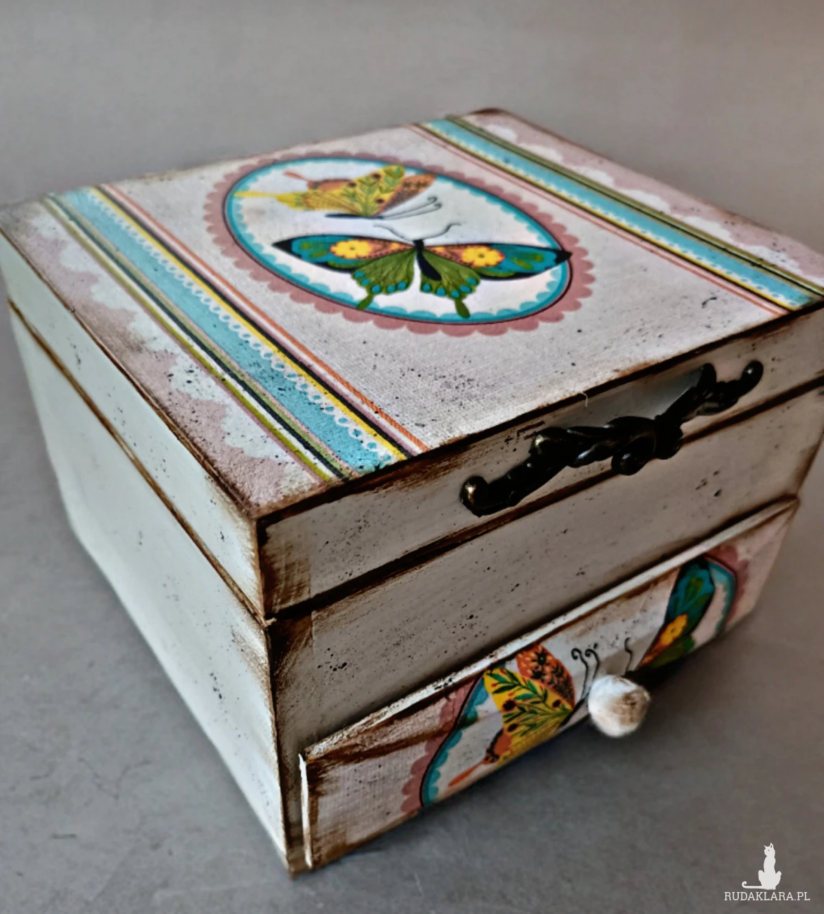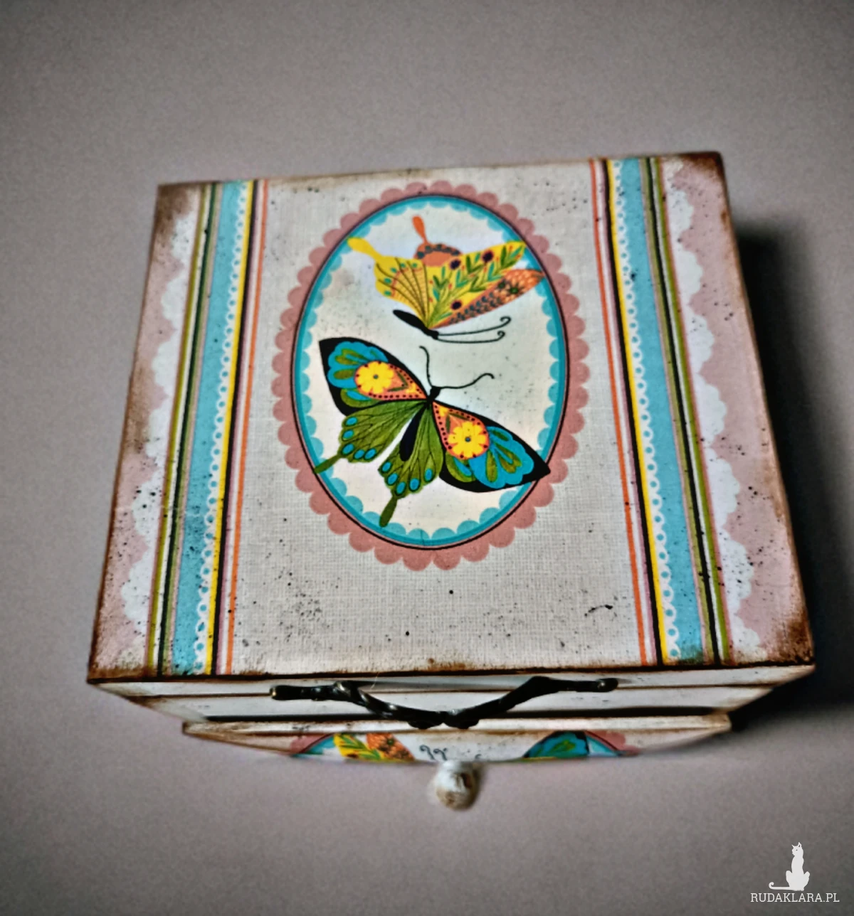 Ozdobiona za pomocą techniki decoupage.