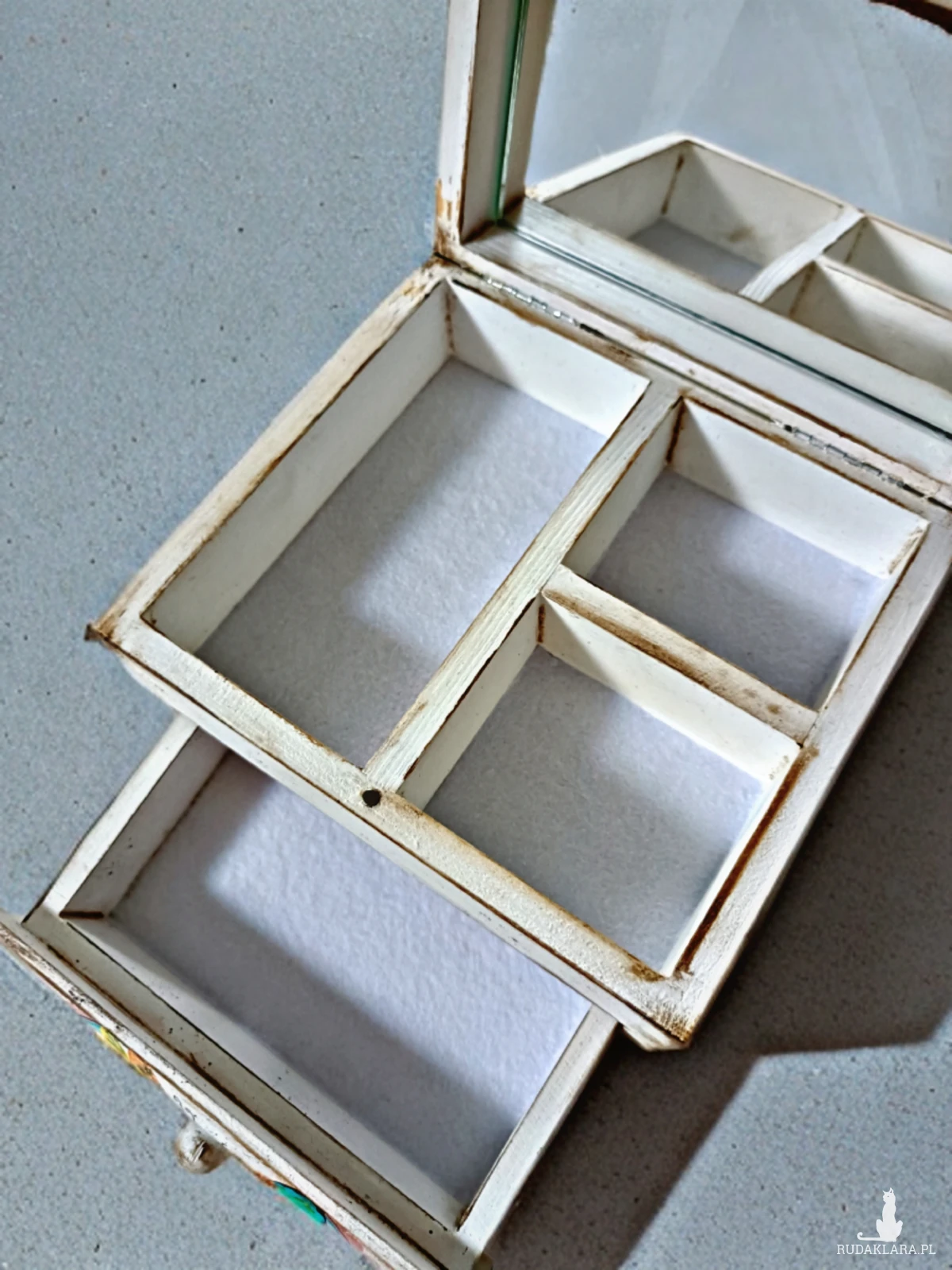 Drewniana skrzyneczka na biżuterię, z przegródkami, dodatkową szufladką i lusterkiem.