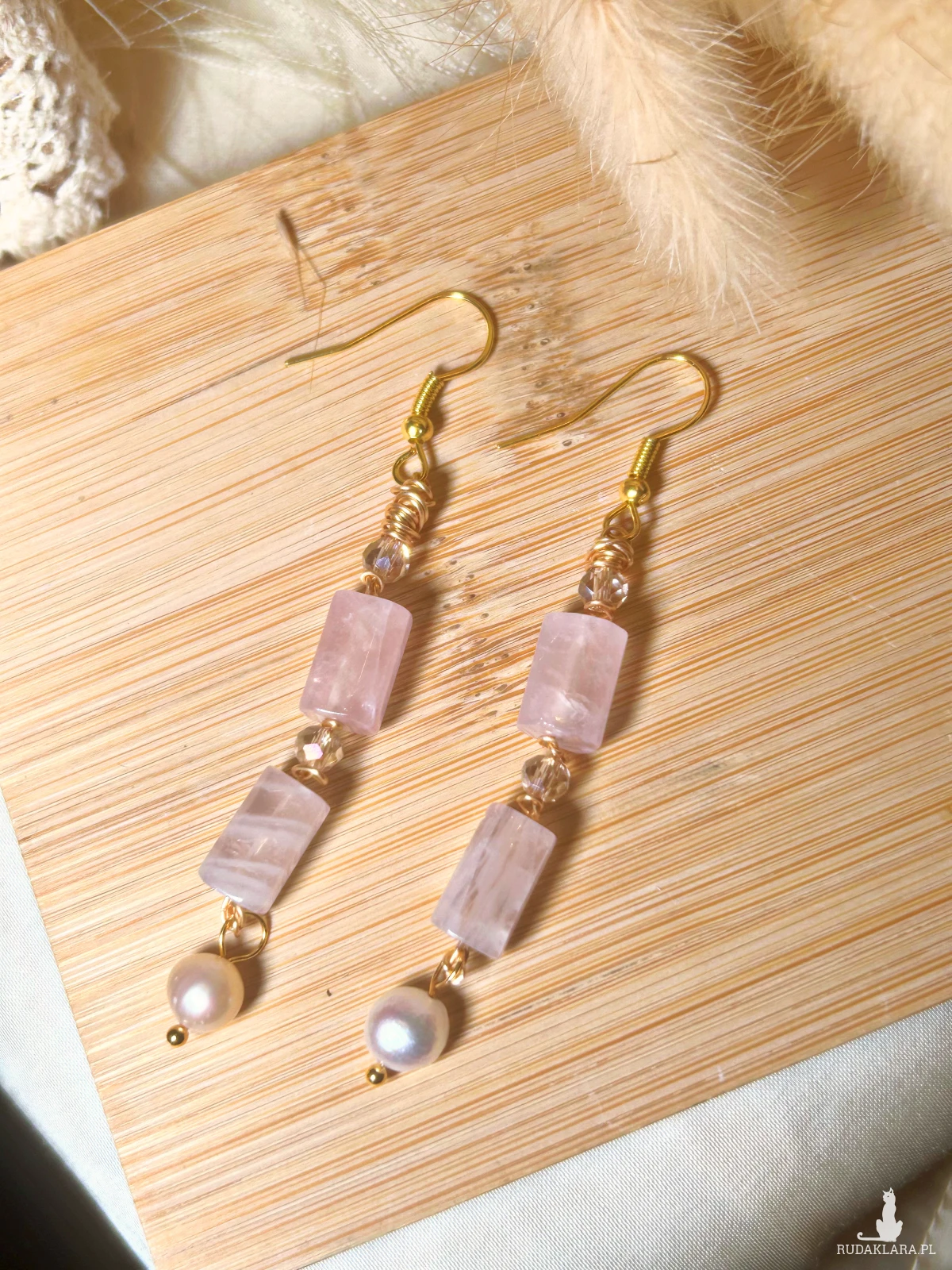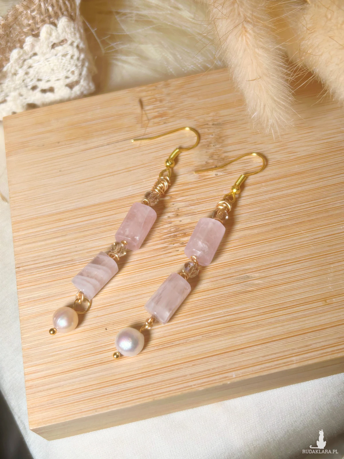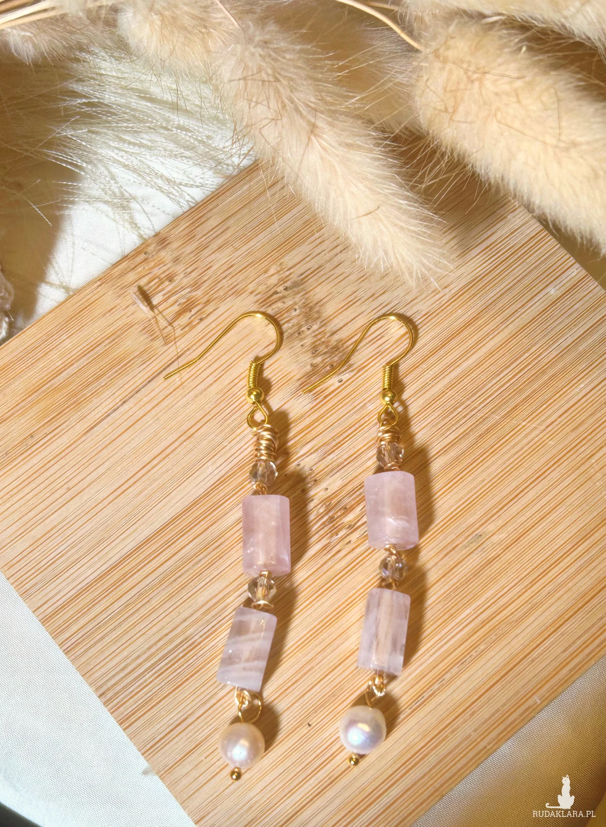 Delikatne i kobiece kolczyki handmade stworzone z naturalnych kamieni i pereł. Połączenie kwarcu różowego w formie subtelnych prostokątnych bryłek z połyskującymi perłami hodowlanymi nadaje im romantycznego i eleganckiego charakteru. Całość uzupełniają drobne szklane koraliki, które dodają blasku i lekkości. Złote elementy podkreślają ciepły odcień kamieni i sprawiają, że kolczyki pięknie komponują się zarówno z codziennymi, jak i wieczorowymi stylizacjami. To wyjątkowa biżuteria dla osób ceniących naturalne materiały i ręczne wykonanie.