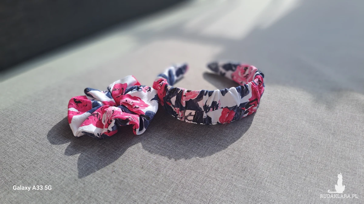Opaska ma szerokość ok.4,5cm. Scrunchie ma średnicę 12cm.