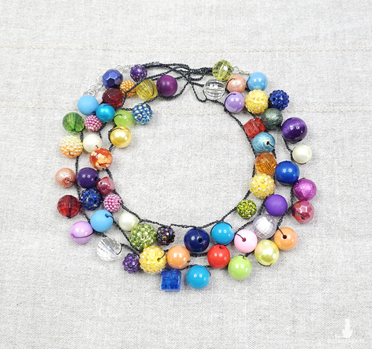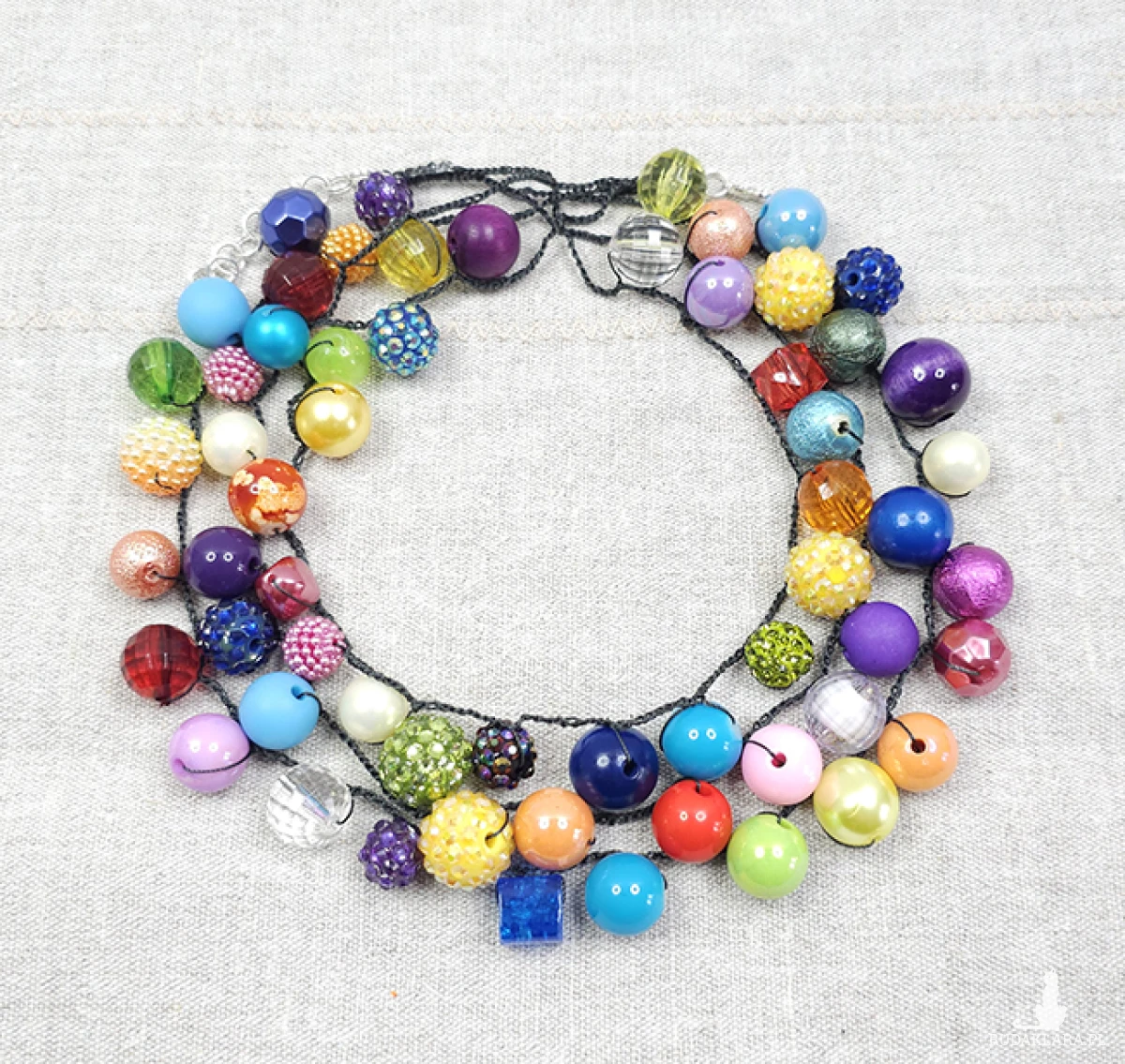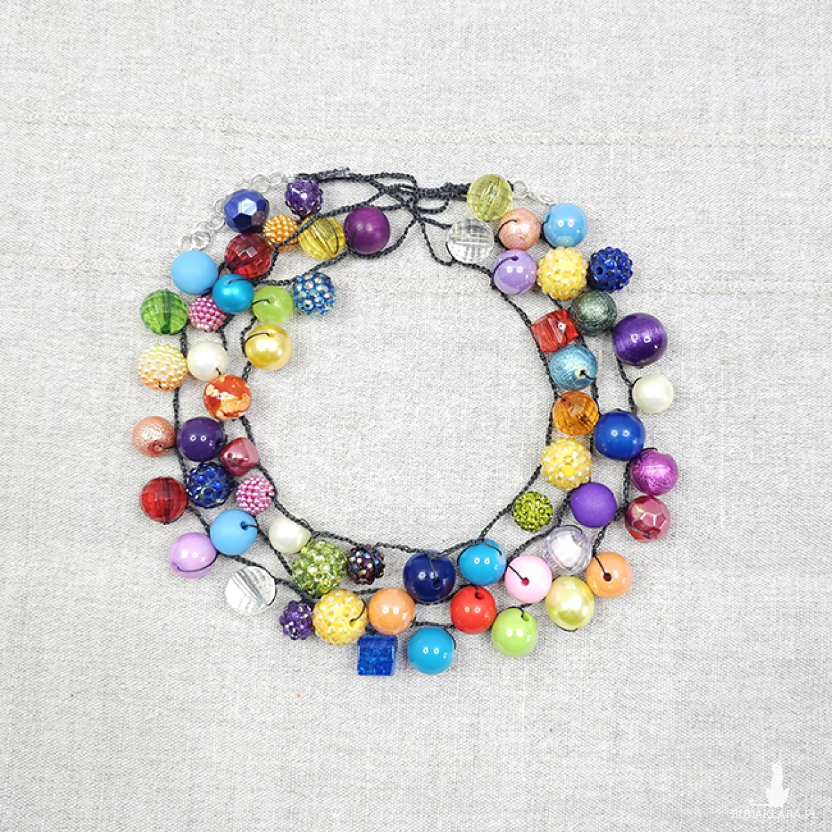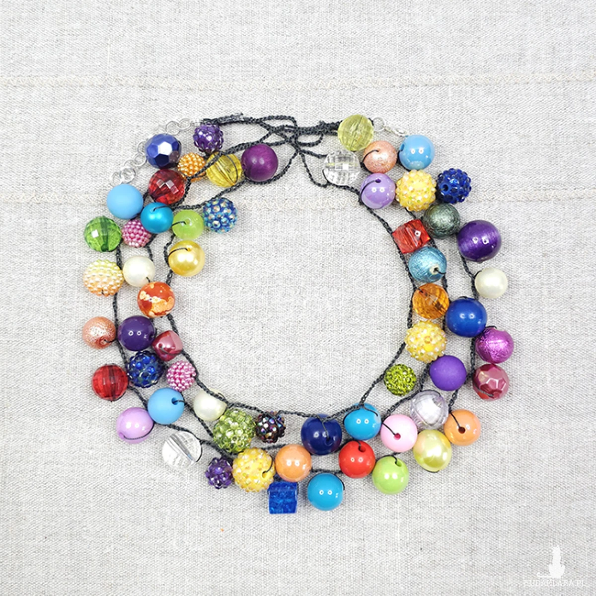 Połączenie szklanych, akrylowych i drewnianych koralików w różnych kształtach i rozmiarach tworzy wyjątkowy, trójwarstwowy design, który rozświetli każdą stylizację.