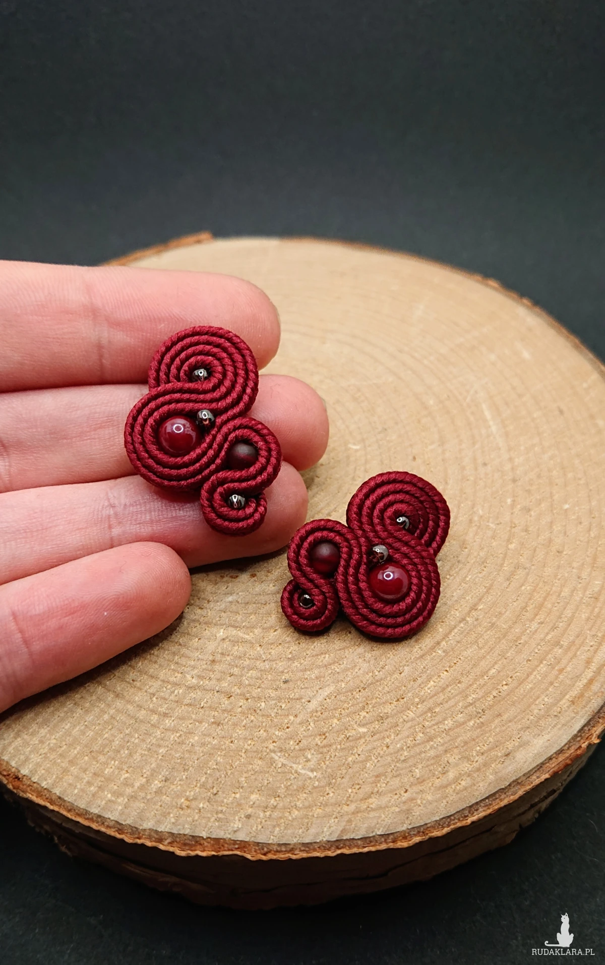 Niewielkie kolczyki sutasz wykonane z szklanych koralików oraz polskich sznurków sutasz. Kolory w kolczykach: bordo. Kolczyki zamocowane na sztyftach ze stali chirurgicznej.