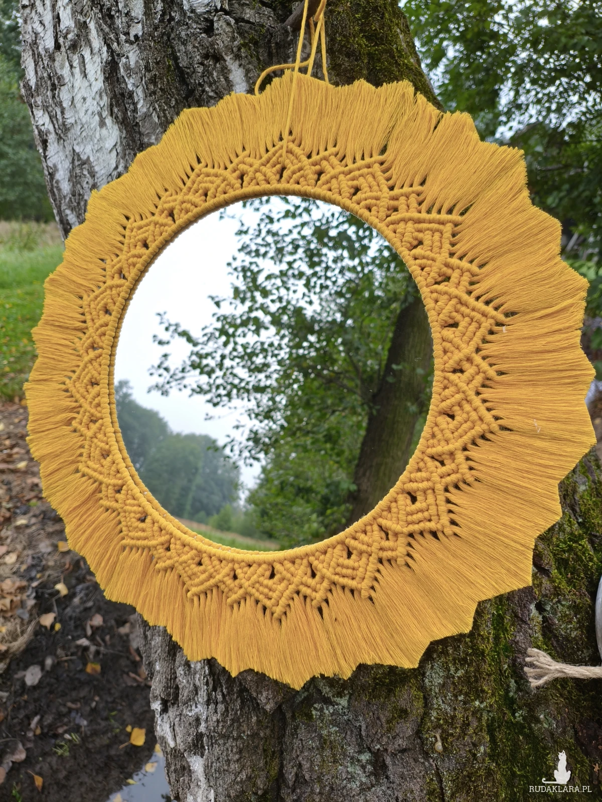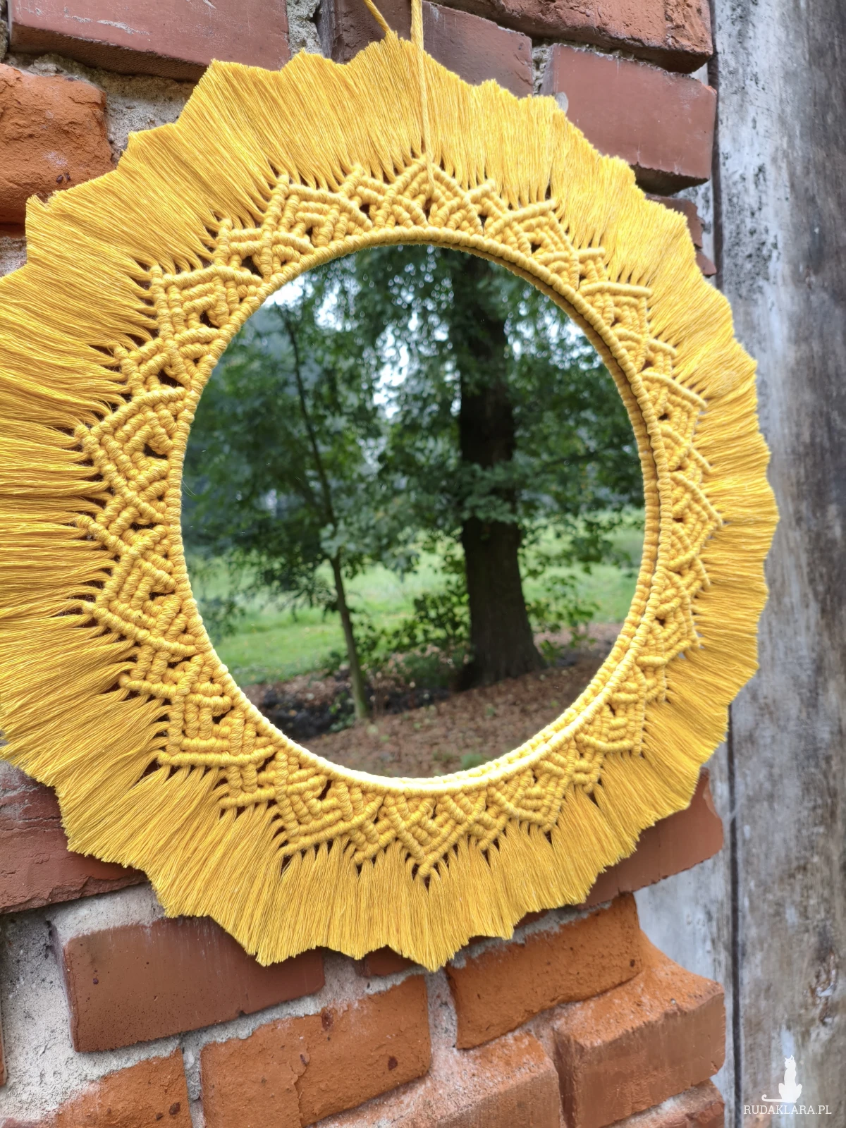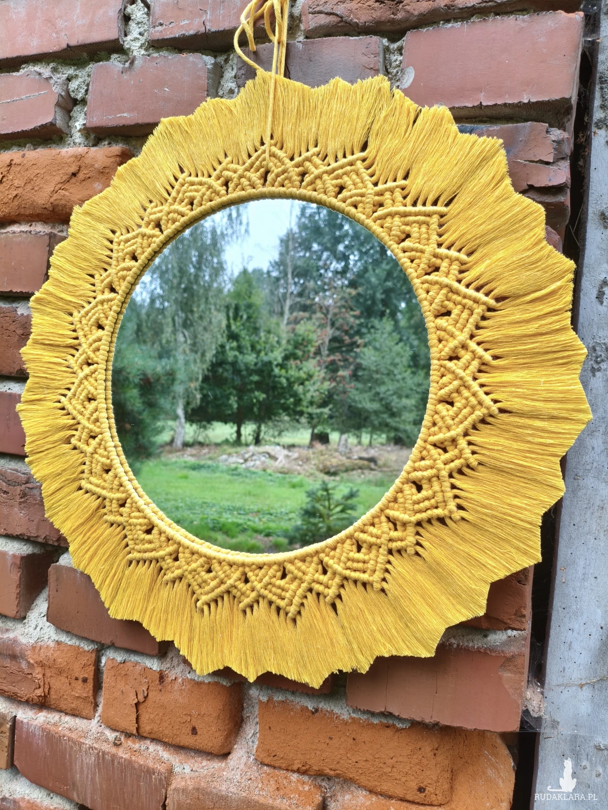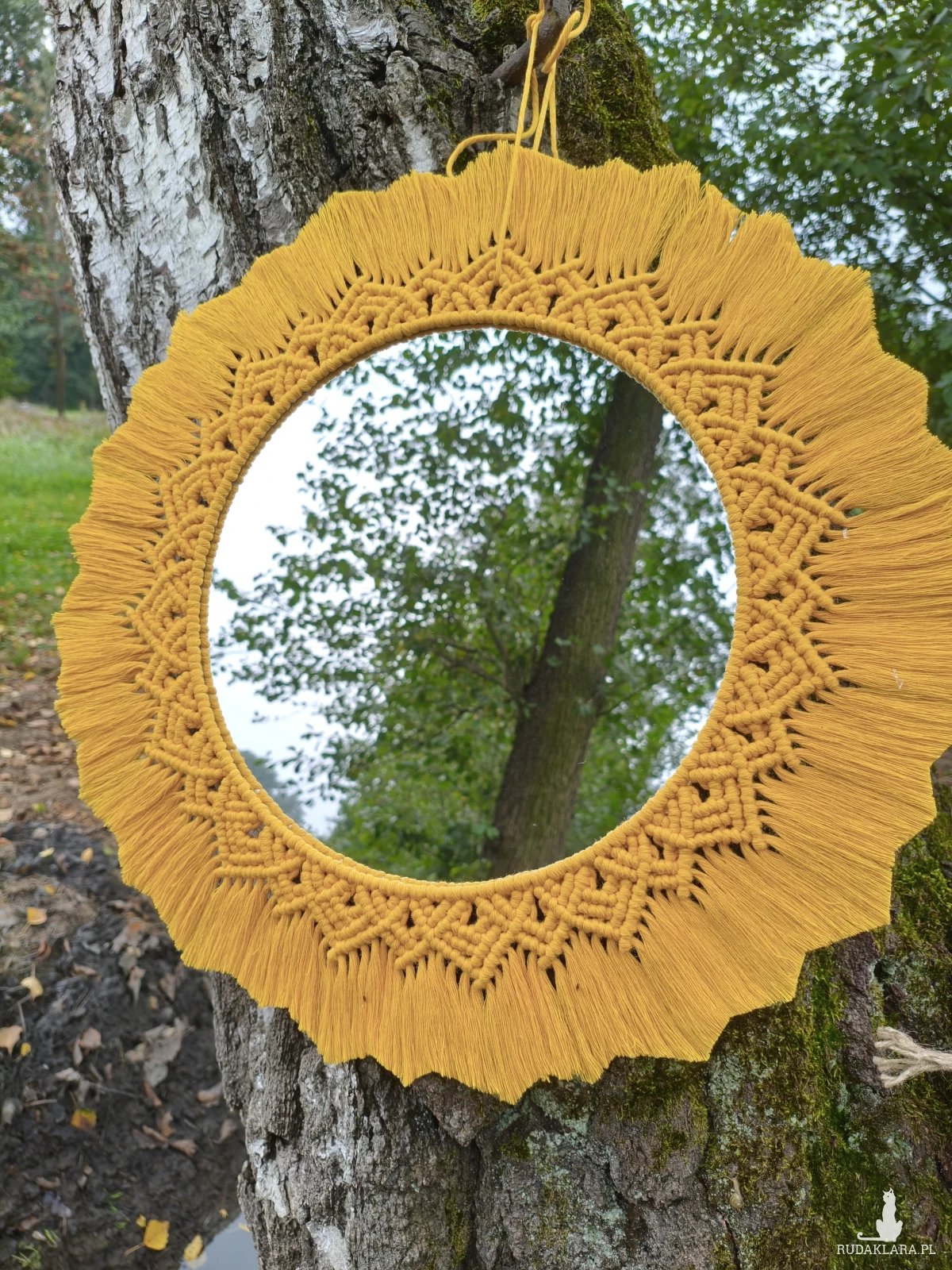 Sprzedam ręcznie wykonane lustro z makramą w stylu Boho, całkowita średnica wynosi 45 cm (średnica lusterka 30cm) Wykonana z sznurka 3 mm w w kolorze żółtym.