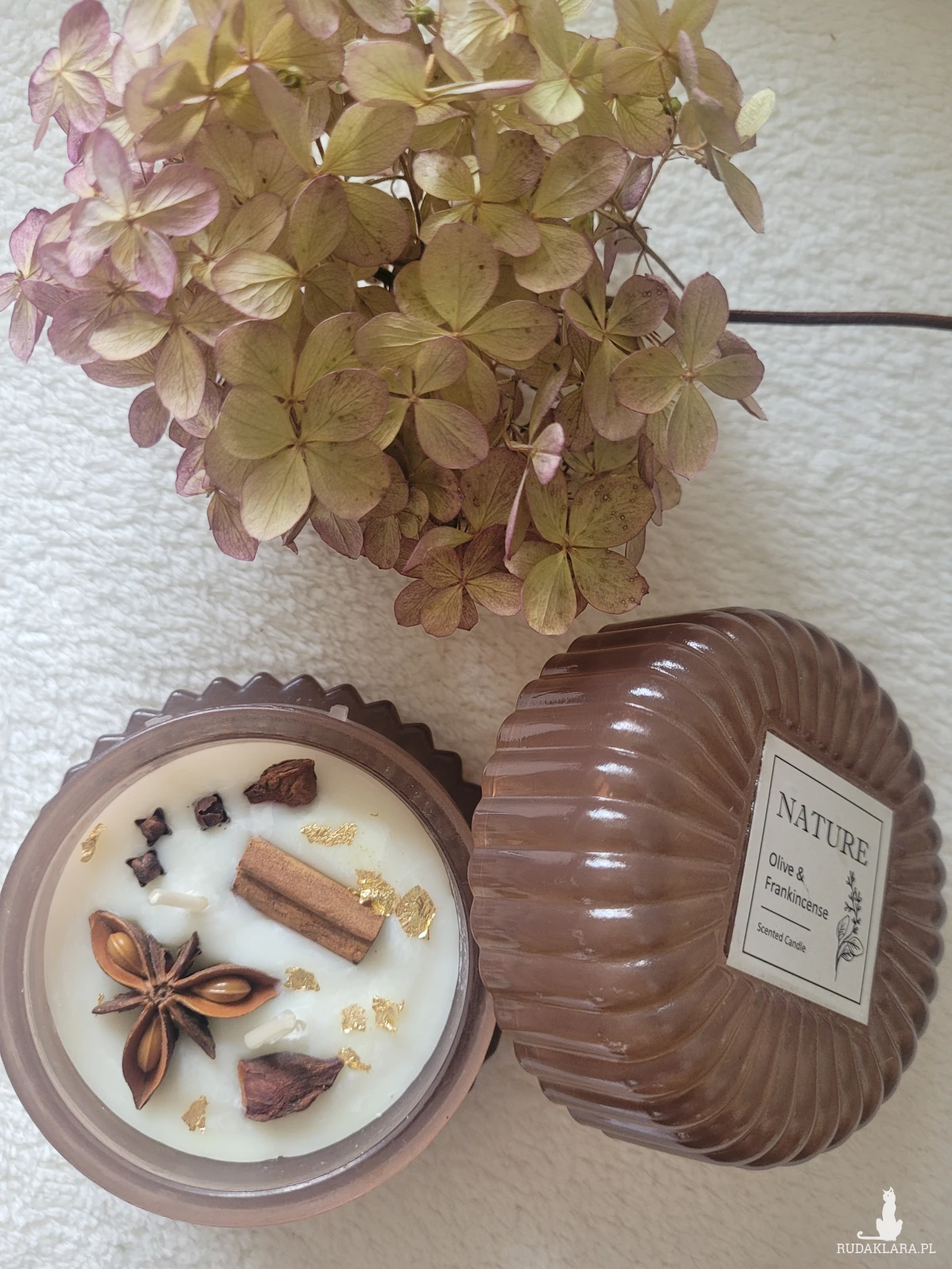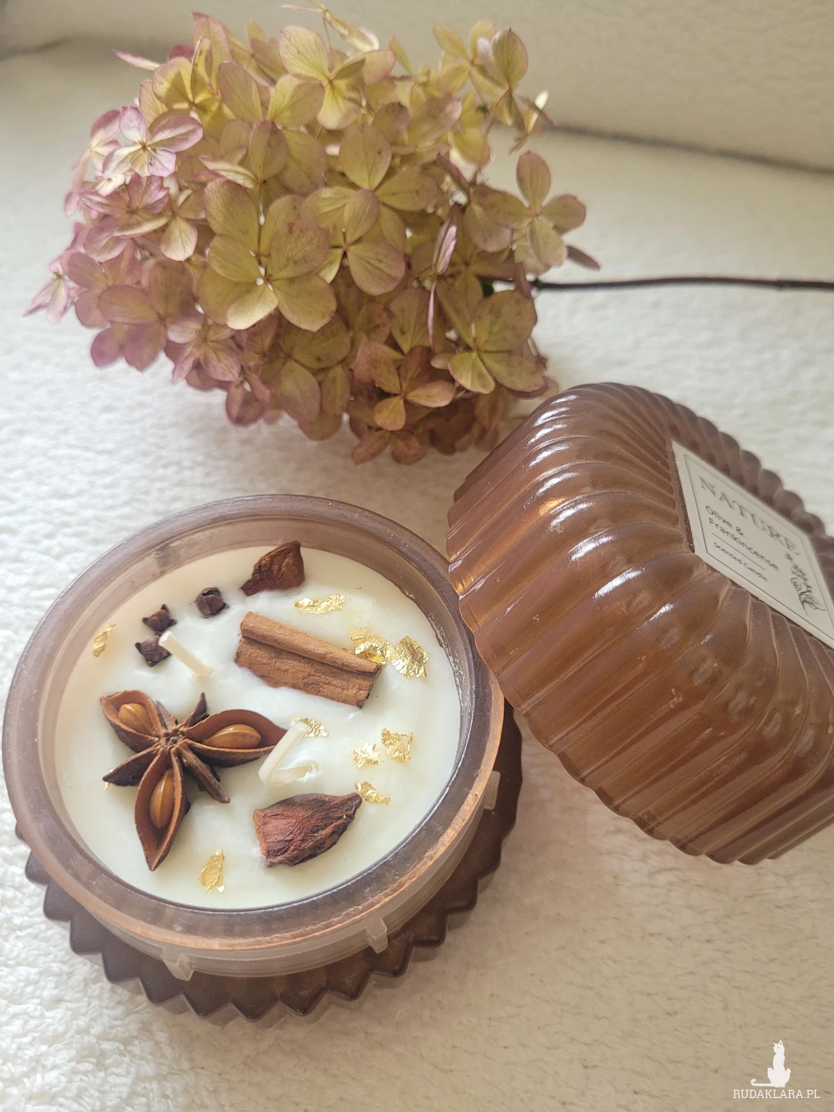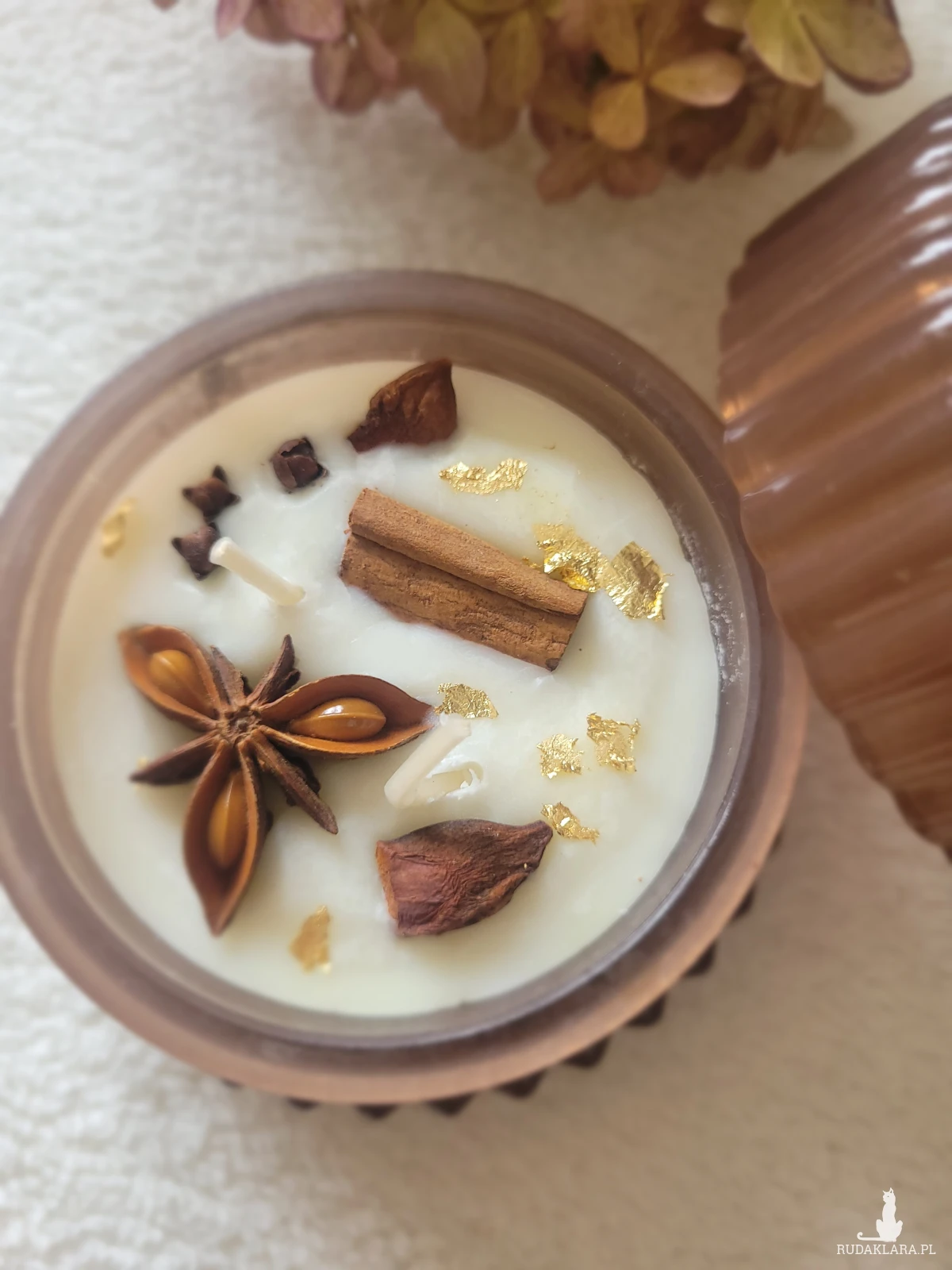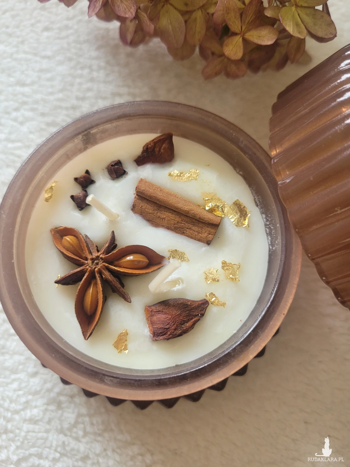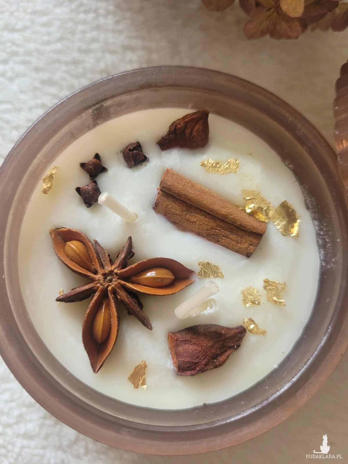 Świeca sojowa handmade z olejkiem cynamonowym I przyprawami korzennymi.