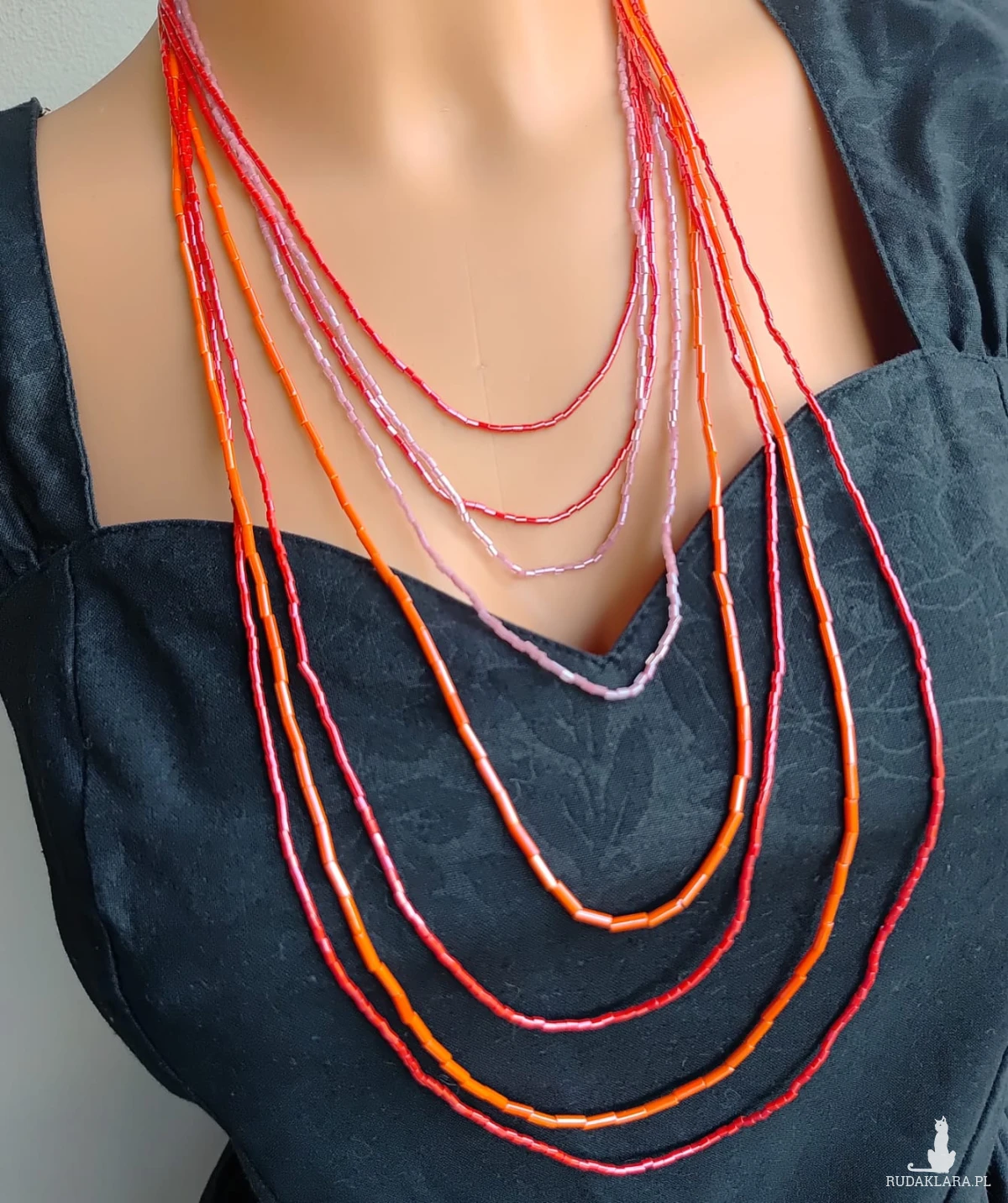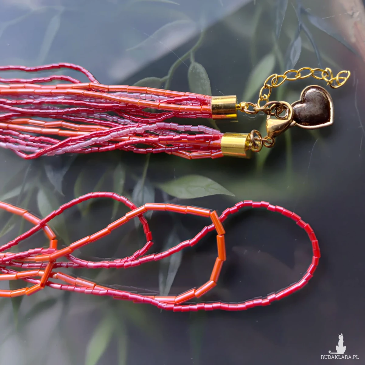 Naszyjnik kaskadowy z cienkich rurek szklanych w żywych kolorach czerwonym, różu i pomarańczy. Bardzo delikatny, lekki. Wykończenie metalowe i zapięcie ze stali nierdzewnej. Objętość 46 cm