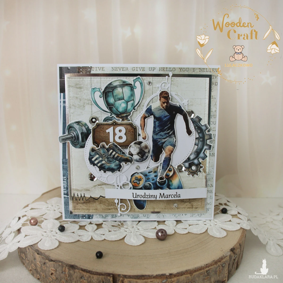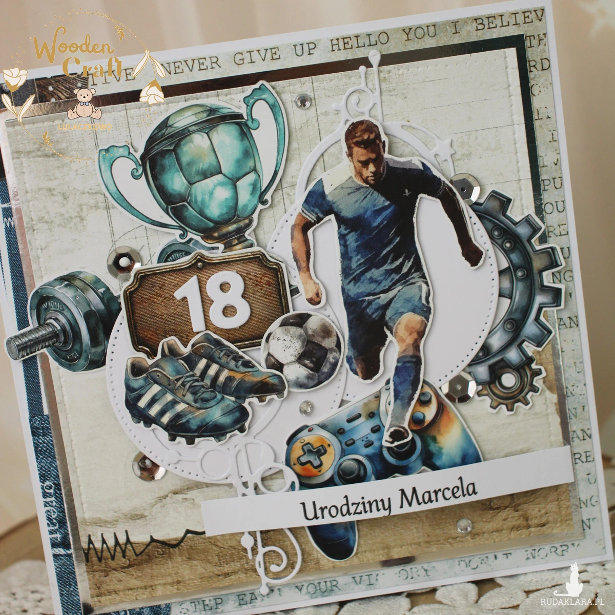 Nietuzinkowa, męska kartka urodzinowa, idealna na 18 urodziny fana piłki nożnej. Utrzymana w odcieniach beżu z dodatkiem błyszczących srebrnych akcentów, zamknięta w białym pudełeczku z okienkiem. Wykonana ręcznie z mixu męskich kolekcji papierów, ozdobiona licznymi grafikami o tematyce piłkarskiej, srebrnymi cekinami, a także napisem "Twój Dzień", imieniem solenizanta oraz cyferką 18.