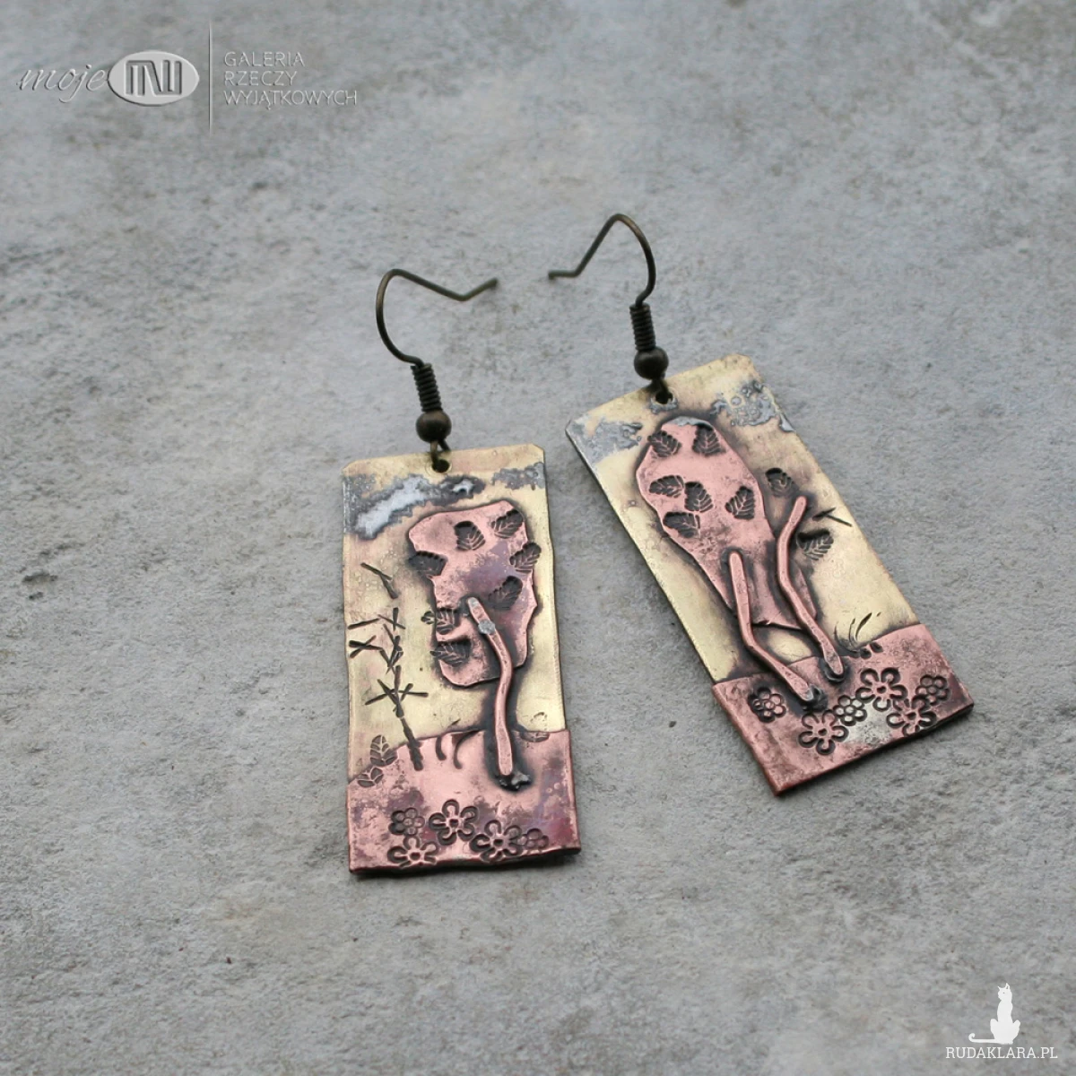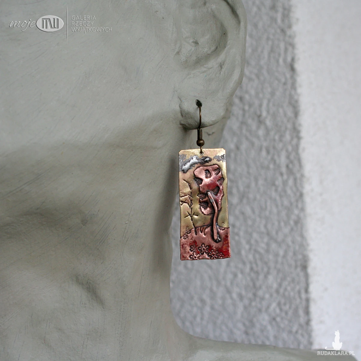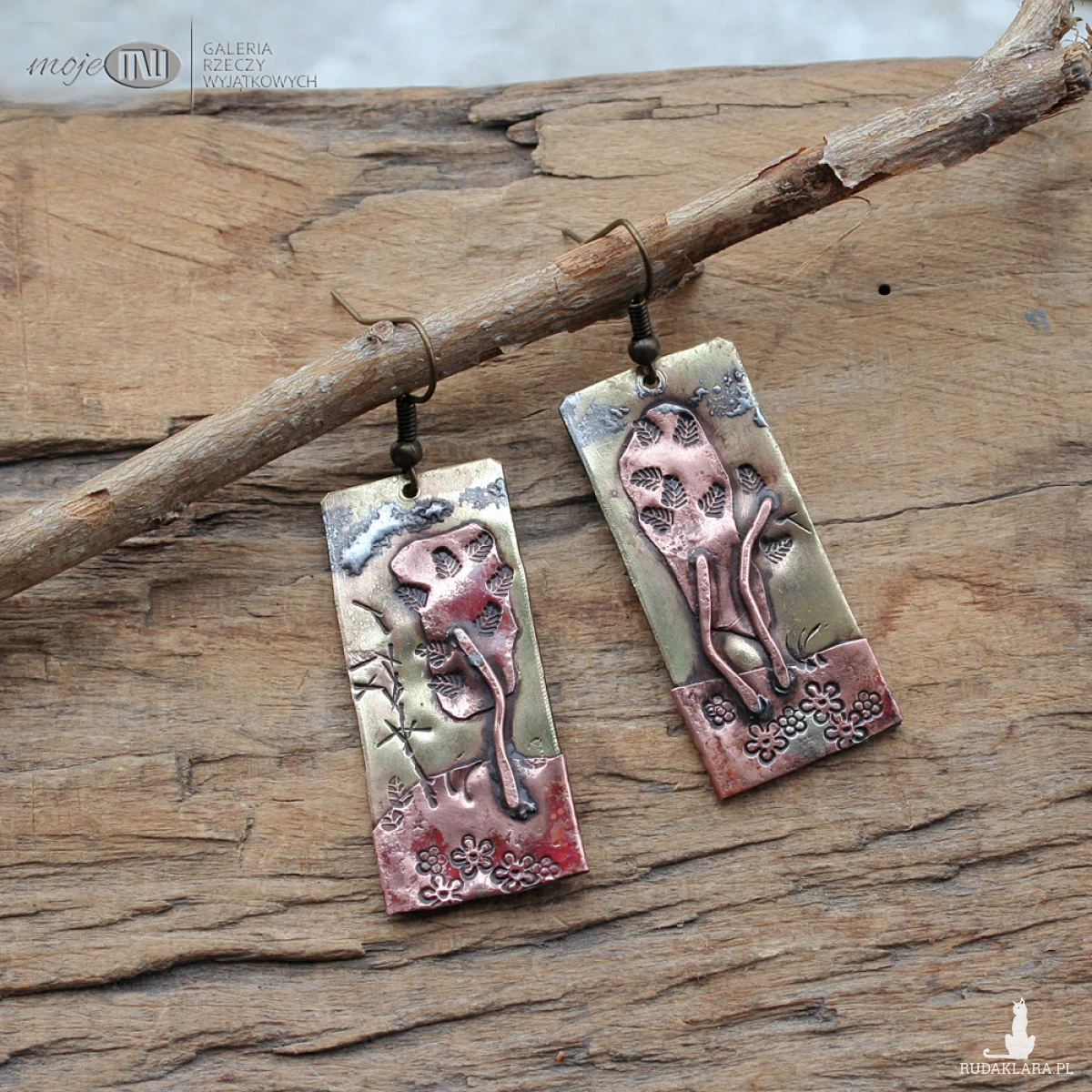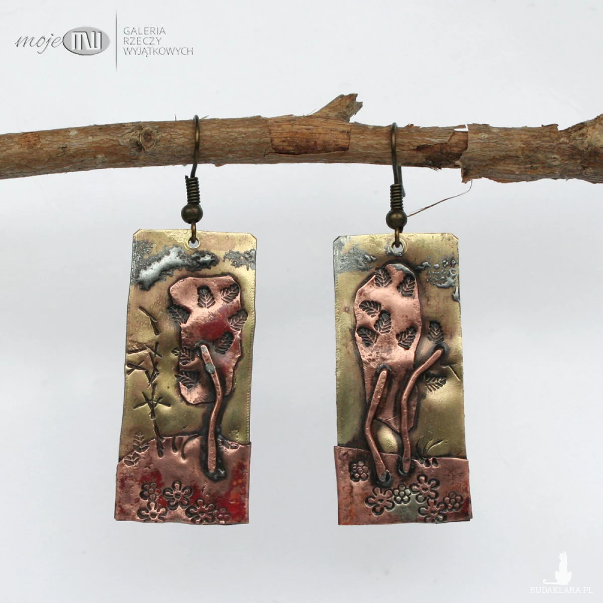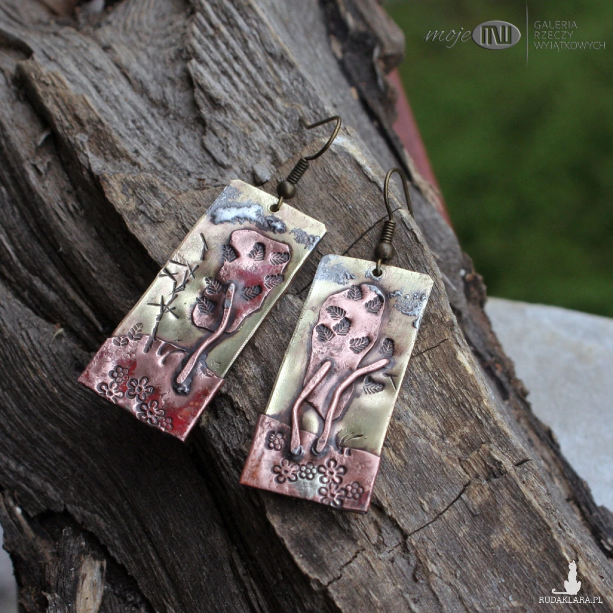 Kolczyki z miedzi i mosiądzu - kompozycja przedstawiająca stylizowany pejzaż. Zrobione są z miedzianej blaszki i drutu, a za pomocą młotkowania oraz stempli nadałam jej ciekawą fakturę. Metal jest patynowany i przecierany dla wydobycia wzorów i faktury. Kolczyki zawieszone są na prostych mosiężnych biglach.
