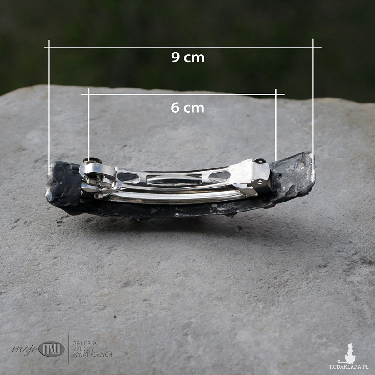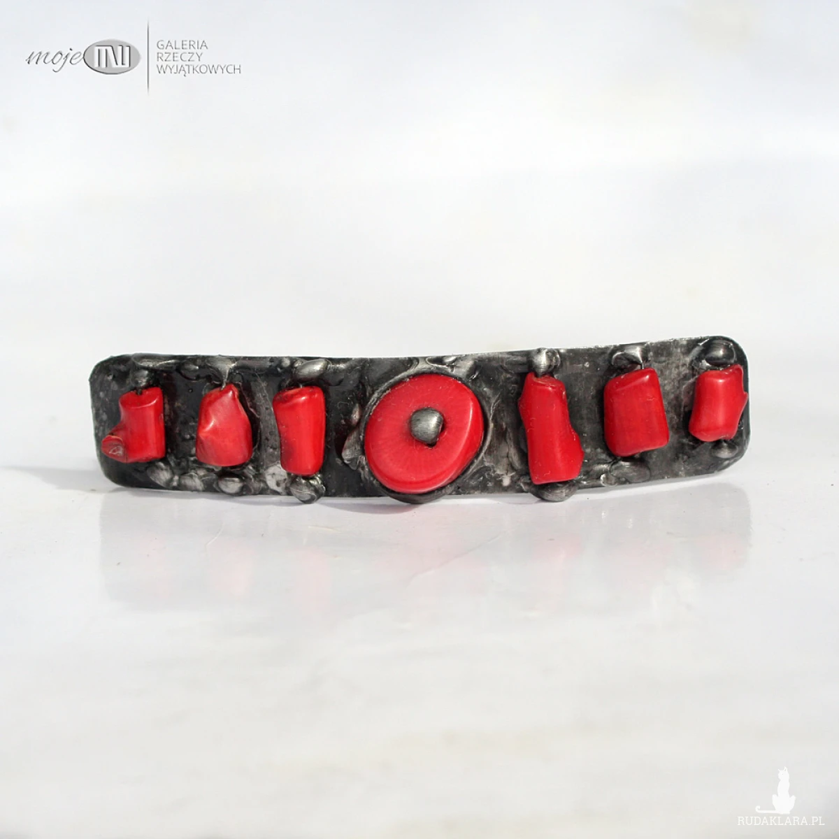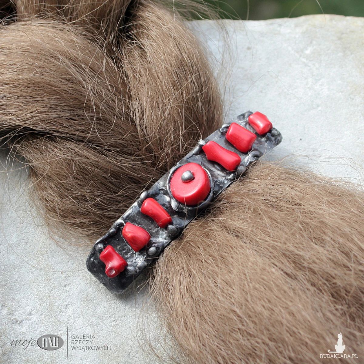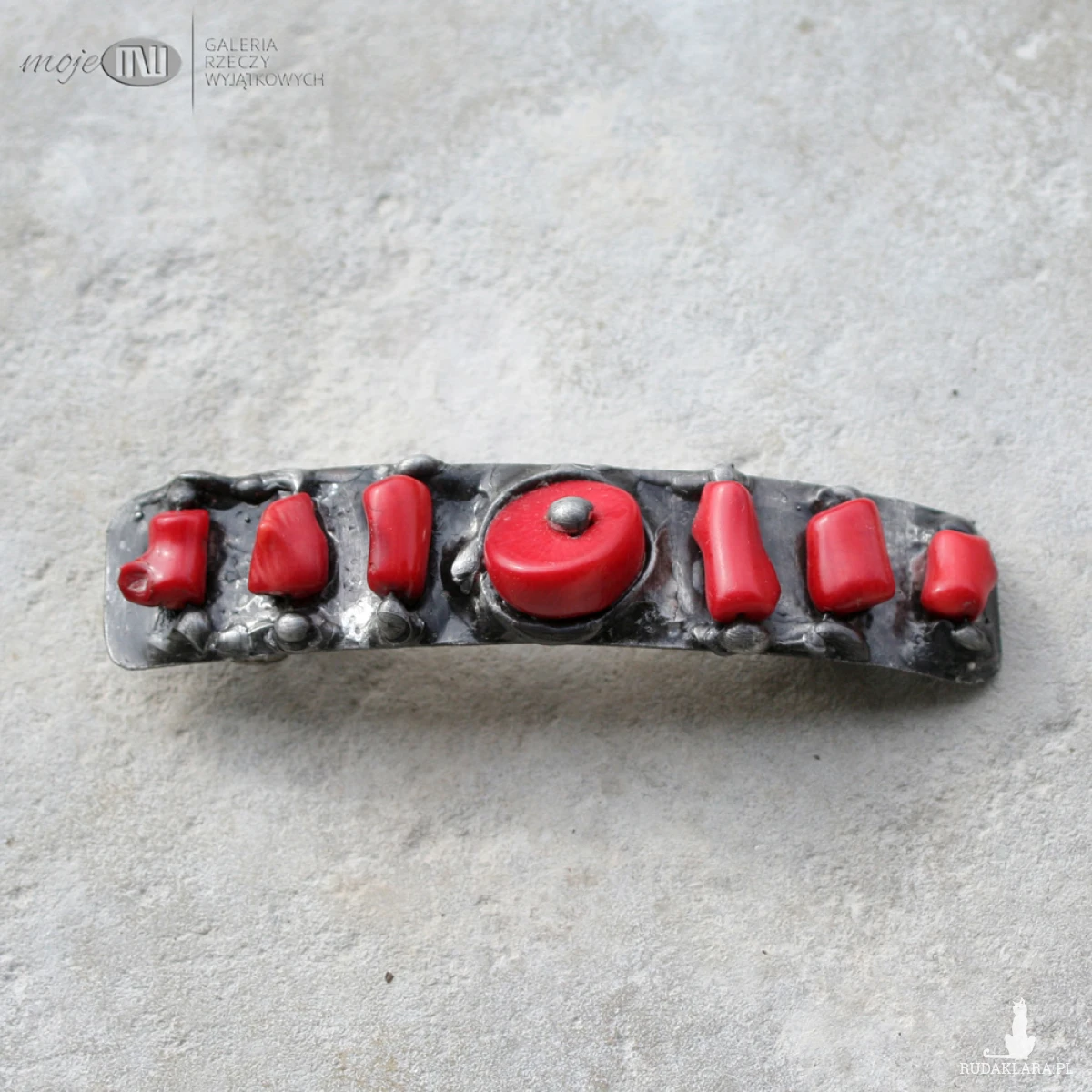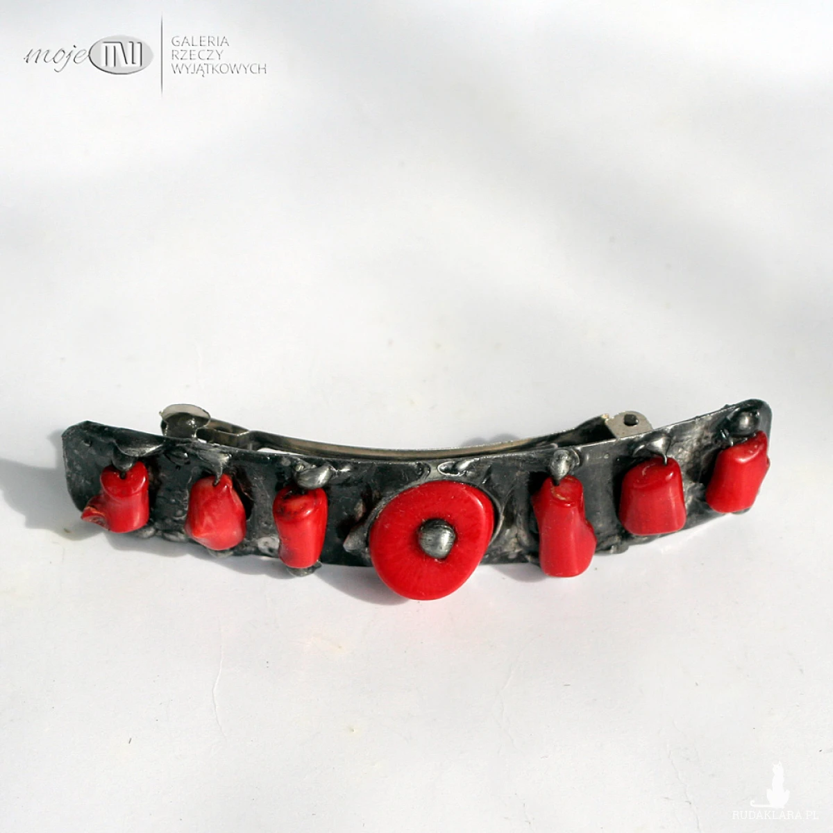 Klamra do włosów z miedzianej blachy i czerwonego korala. Miedź jest pokryta cyną, patynowana na kolor starego srebra i przecierana. Klamra to standardowy metalowy mechanizm.