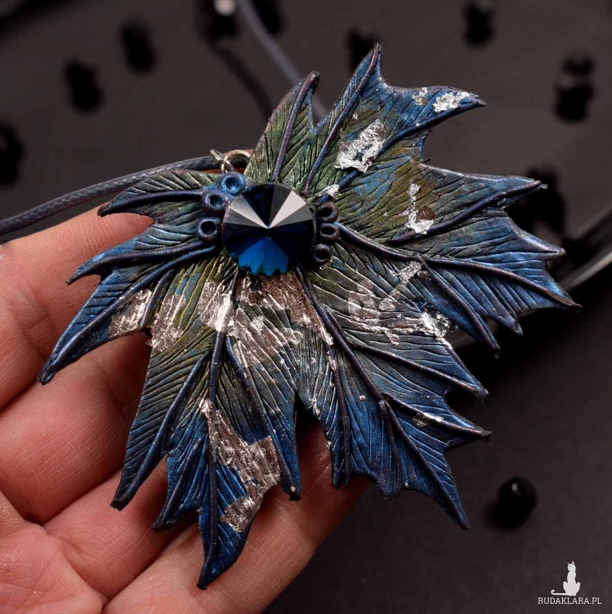 Wisior w formie liścia klonu, utrzymany w odcieniach srebrzystego błękitu i zieleni.