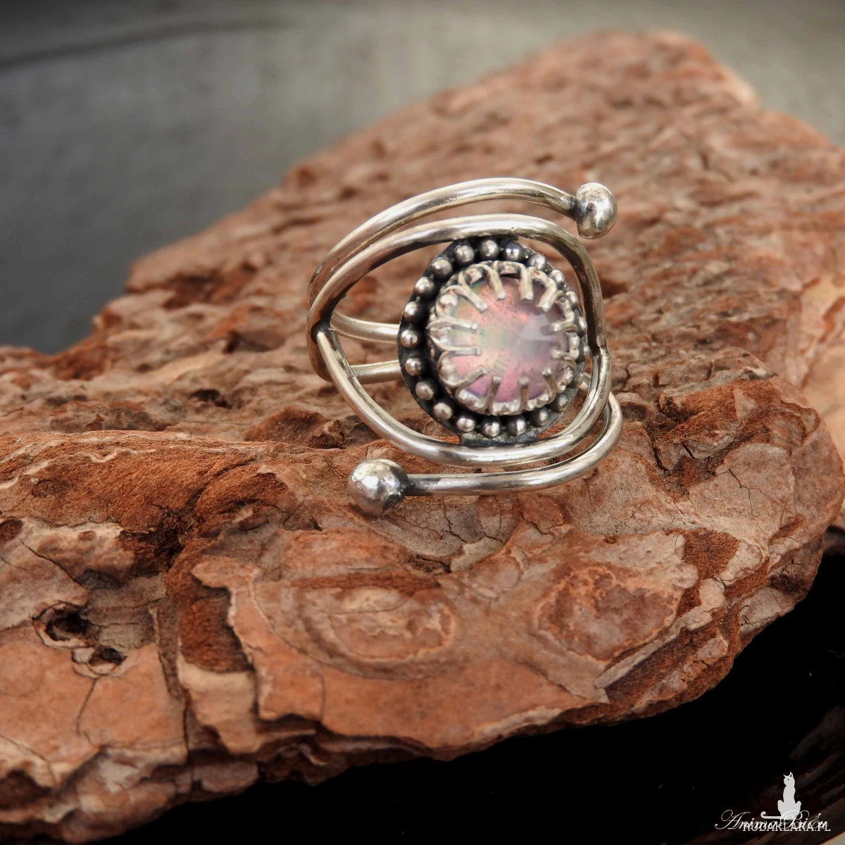 ręcznie pierścionek powstał ze srebra próby 925 i 999. Jego sercem jest