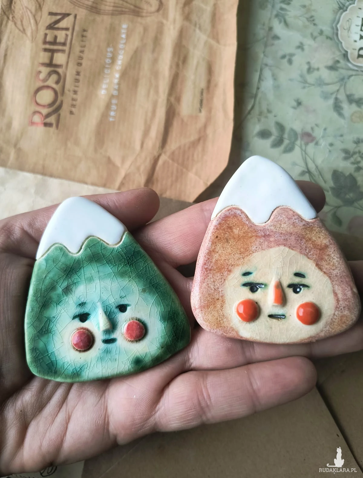 Broszka ceramiczna w postaci góry o wymiarach ok 4,5 cm x 6,5 cm, wykonana z gliny szamotowej wypalona na biskwit, a następnie szkliwiona w temp ok 1260 stopni C. polecam serdecznie.