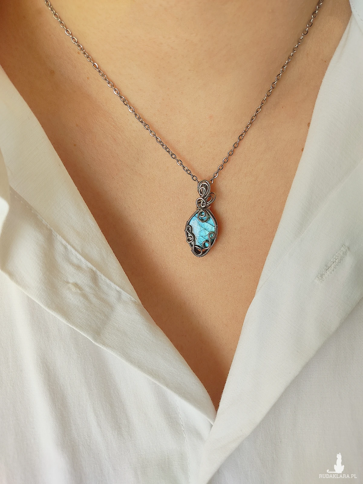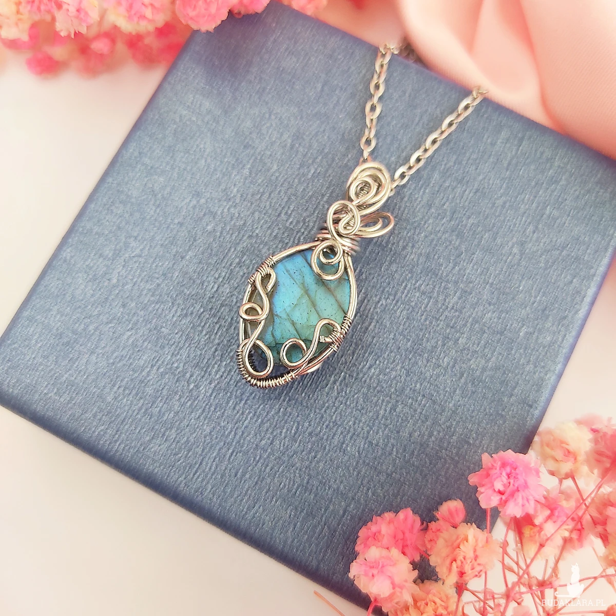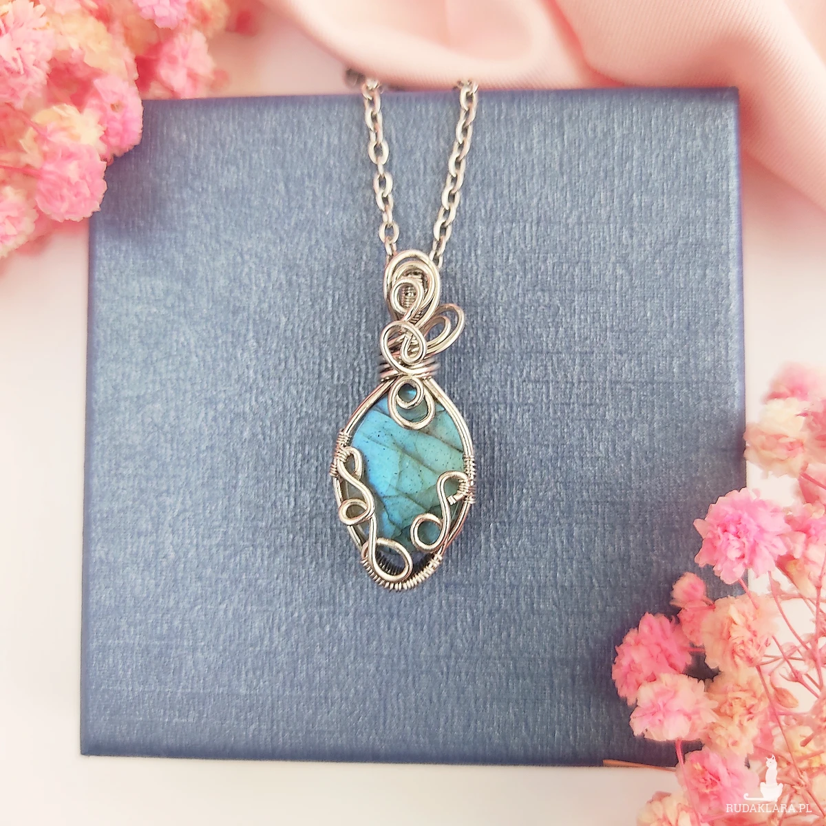 Naszyjnik Labradoryt Niebieski ręcznie robiony. Wykonany techniką wire wrapping z drutów ze stali chirurgicznej.