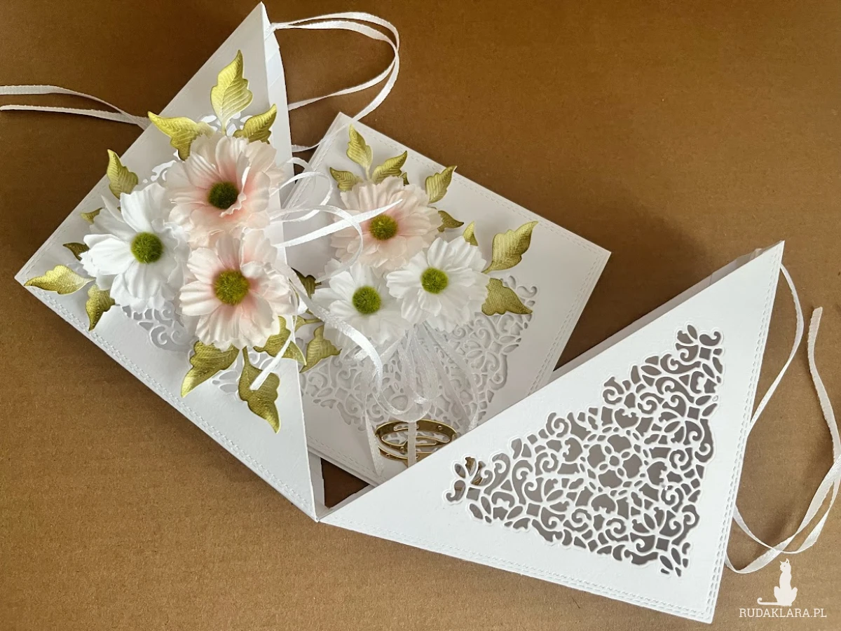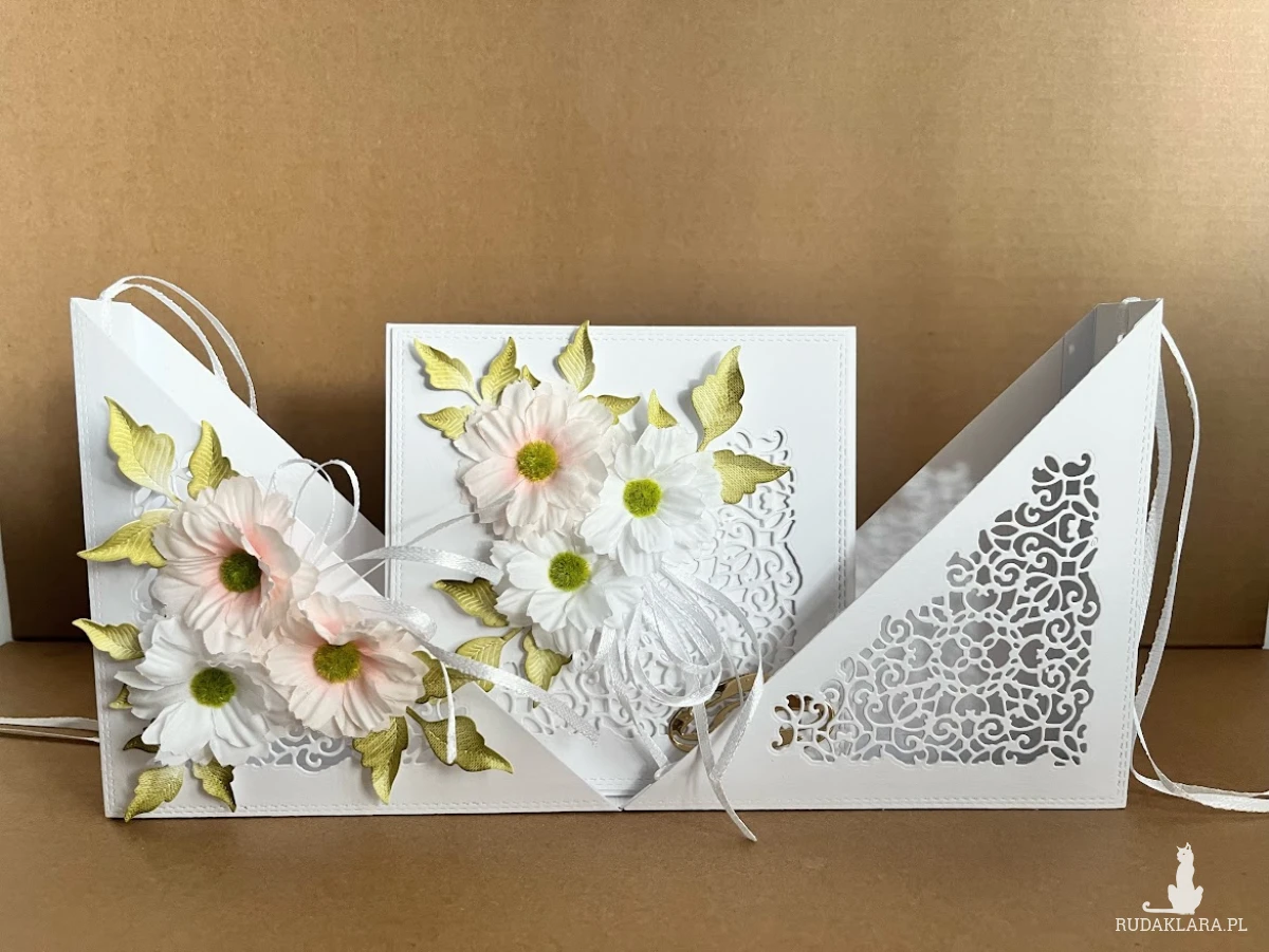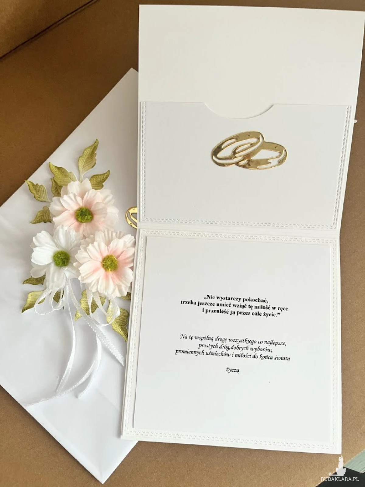 Elegancka, bogato zdobiona kartka w pudełku z okazji ślubu. Utrzymana wbiałej kolorystyce - ozdobiona kwiatami w kolorze delikatnego różu i bieli. Na kartce dodano złote obrączki . Kartka jest w całości wykonana ręcznie z najlepszej jakości materiałów do scrapbookingu tak jak pudełko tz. sandwich box. Wielkość pudełka 15,0x15,0x3. Wielkość kartki 14,0 x 14,0 wewnątrz ,której są gotowe życzenia do własnoręcznego podpisu oraz kieszonka na małe co nieco lub kupon lotto. Zestaw dostępny od ręki. Do zestawu dołączono torebkę w tej samej stylizacji co kartka i pudełko.Wielkość torebki 18x22,5x8cm.Zestaw dostępny od ręki.