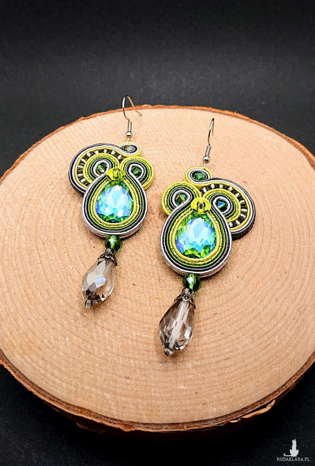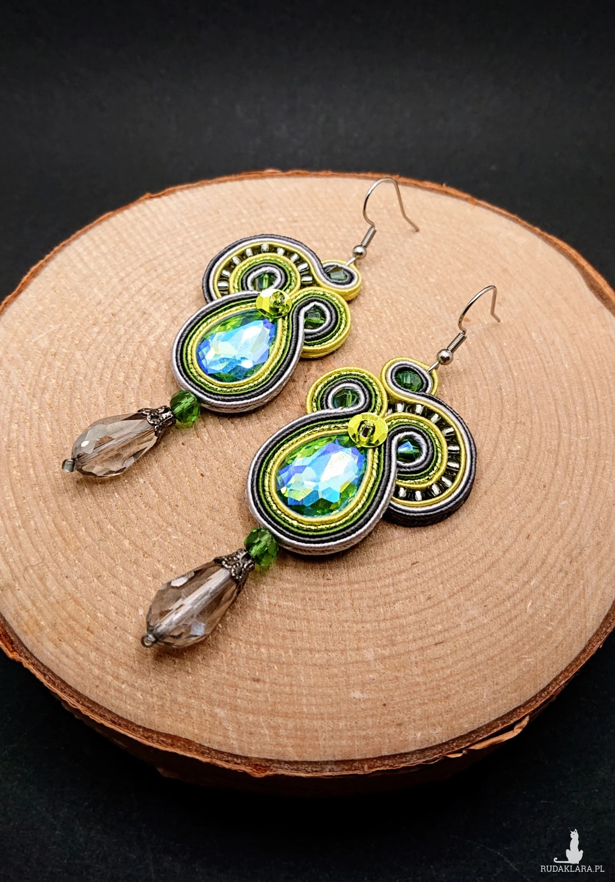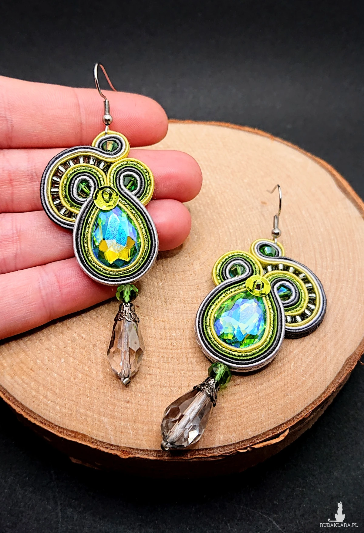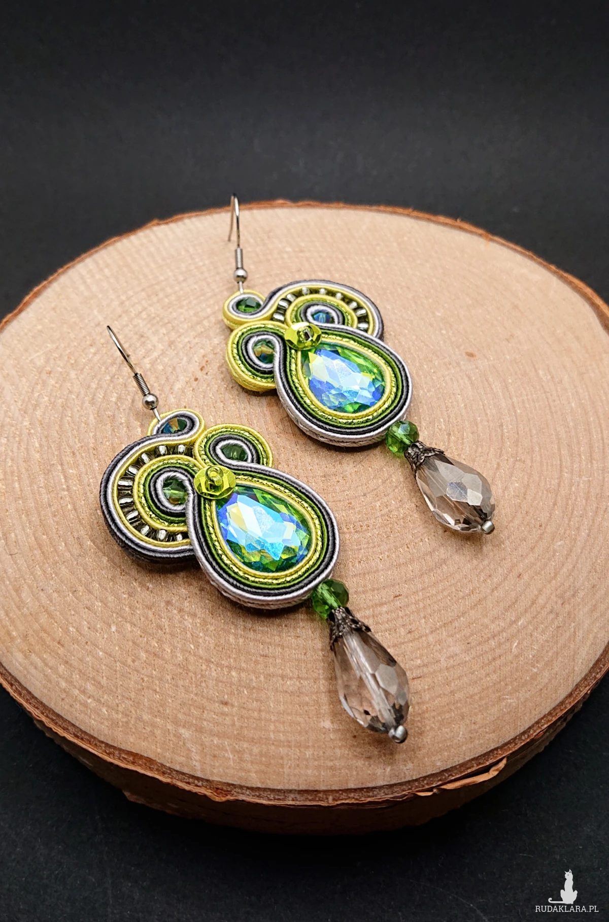 Szklane fasetowane kryształki w kolorze zielonym z niebieskim połyskiem otoczone metalizowanym sznurkiem oraz sznurkami sutasz w odcieniach zieleni i szarości. Dół kolczyków ozdobiony szklanymi kryształowymi kroplami w ozdobnych czapeczkach. Kolczyki zawieszone na metalowych otwartych biglach w kolorze ciemnego srebra.