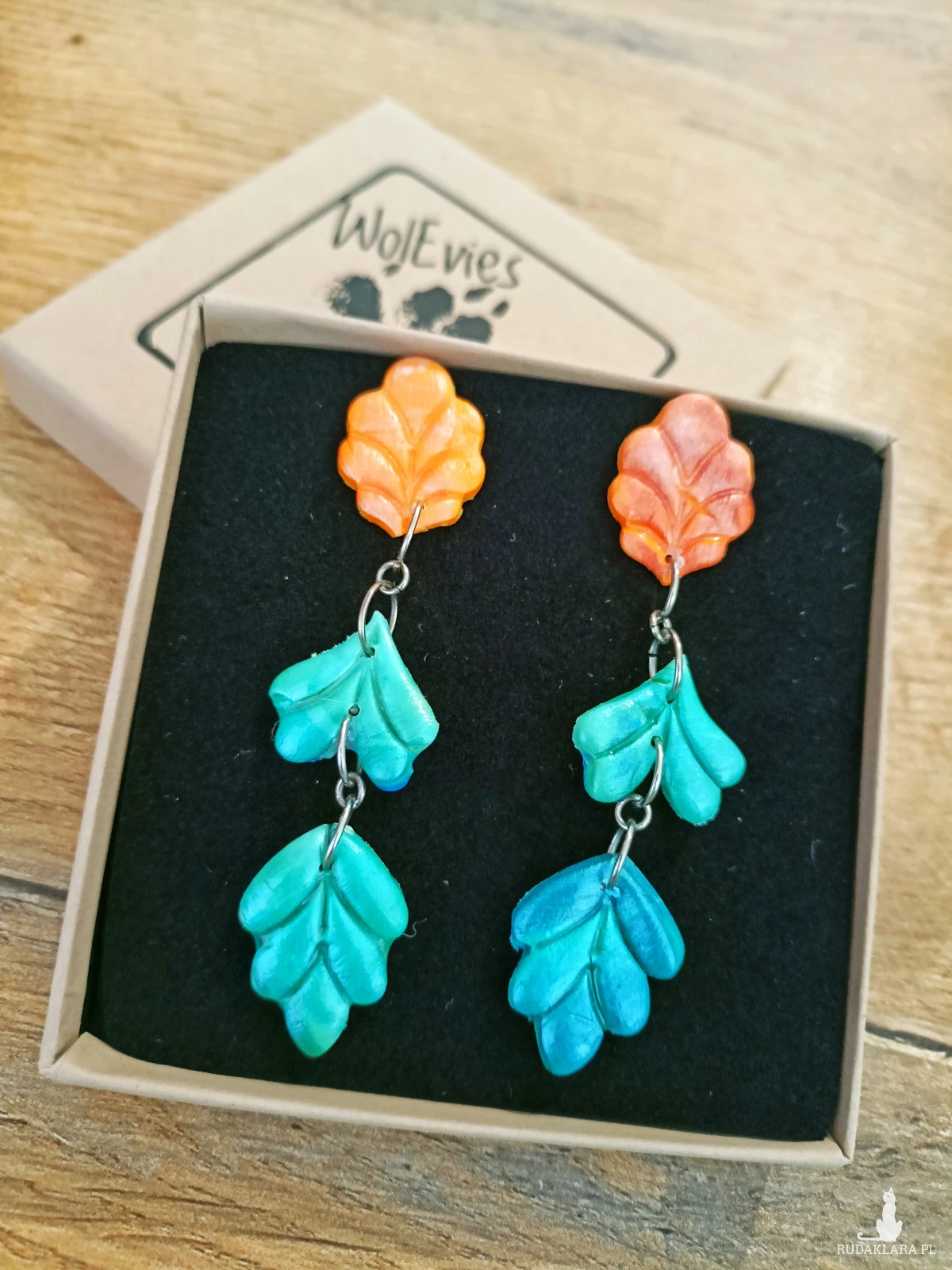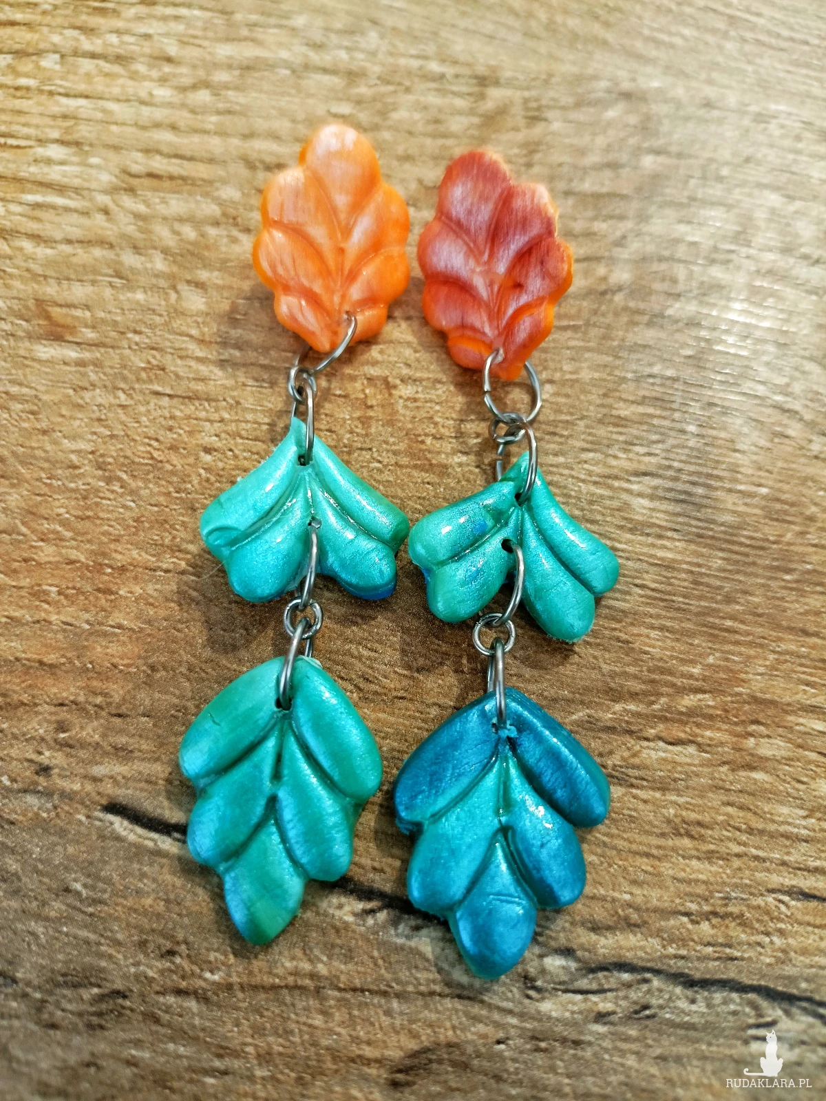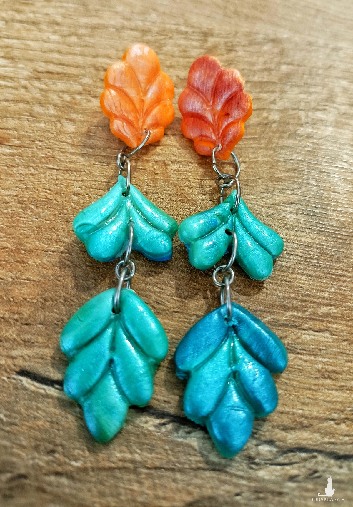 kolczyki jesienne handmade • kolczyki listki handmade • kolczyki z glinki polimerowej • kolczyki perłowe błyszczące • biżuteria handmade jesień • kolczyki pomarańczowo-zielone • kolczyki handmade prezent • kolczyki zabezpieczone żywicą • unikatowa biżuteria handmade • kolczyki w pudełeczku