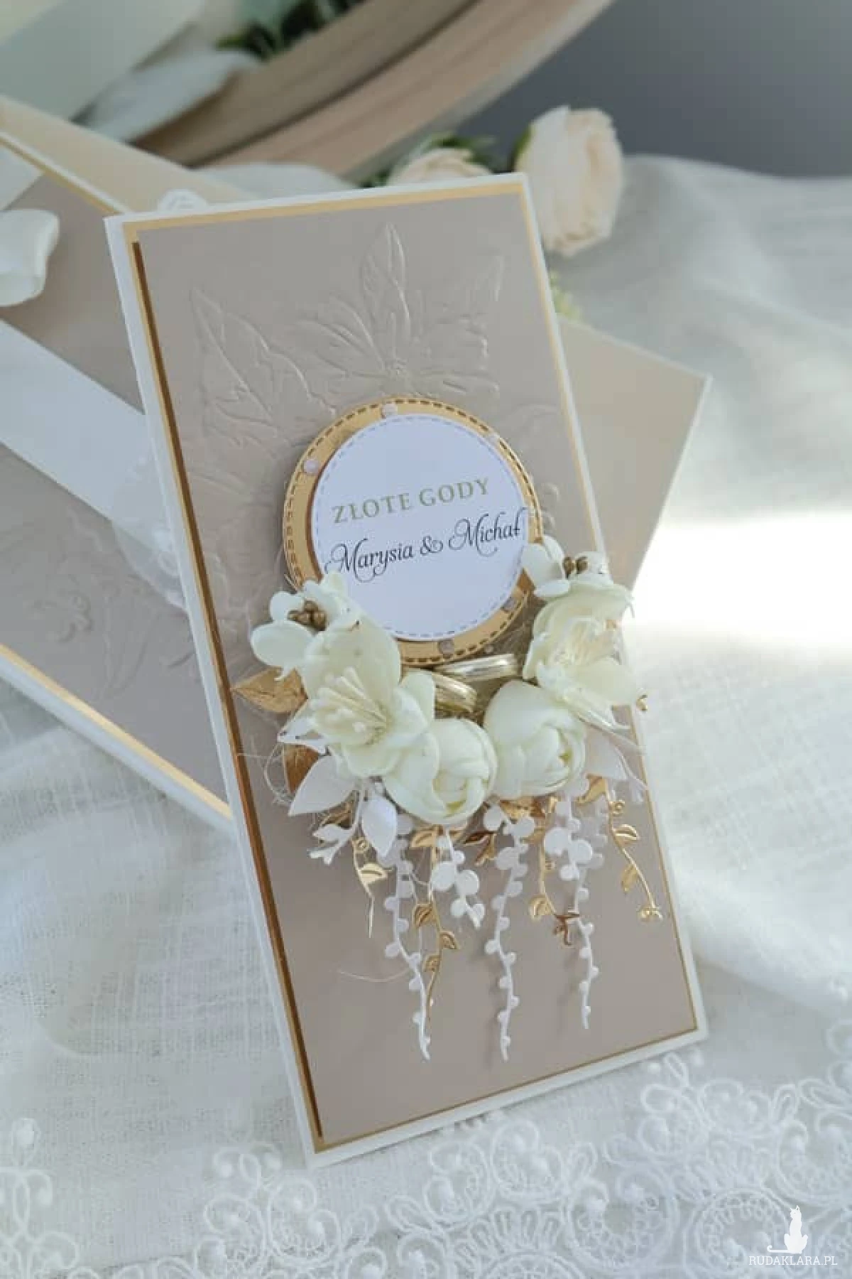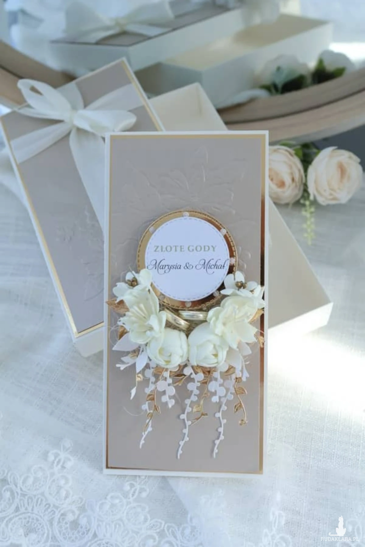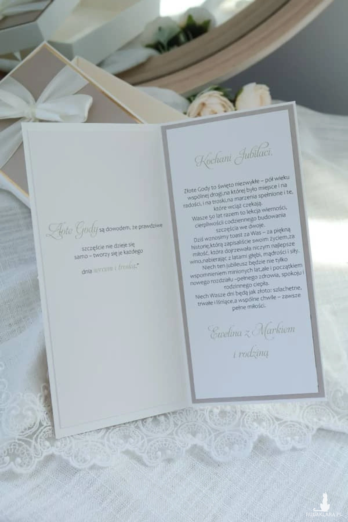 Kartka w eleganckim pudełku to wyjątkowy sposób, by uczcić 50 lat wspólnego życia. Idealna dla rodziców, dziadków, przyjaciół lub bliskiej rodziny.Możesz dodać imiona jubilatów, wpisać własne życzenia lub wybrać gotowy tekst. W środku znajduje się także praktyczna kieszonka na pieniądze lub bon – wszystko gustownie zapakowane i gotowe do wręczenia.To nie jest zwykła kartka – to pamiątka pełna uczuć, która wzruszy i zostanie z nimi na długo.