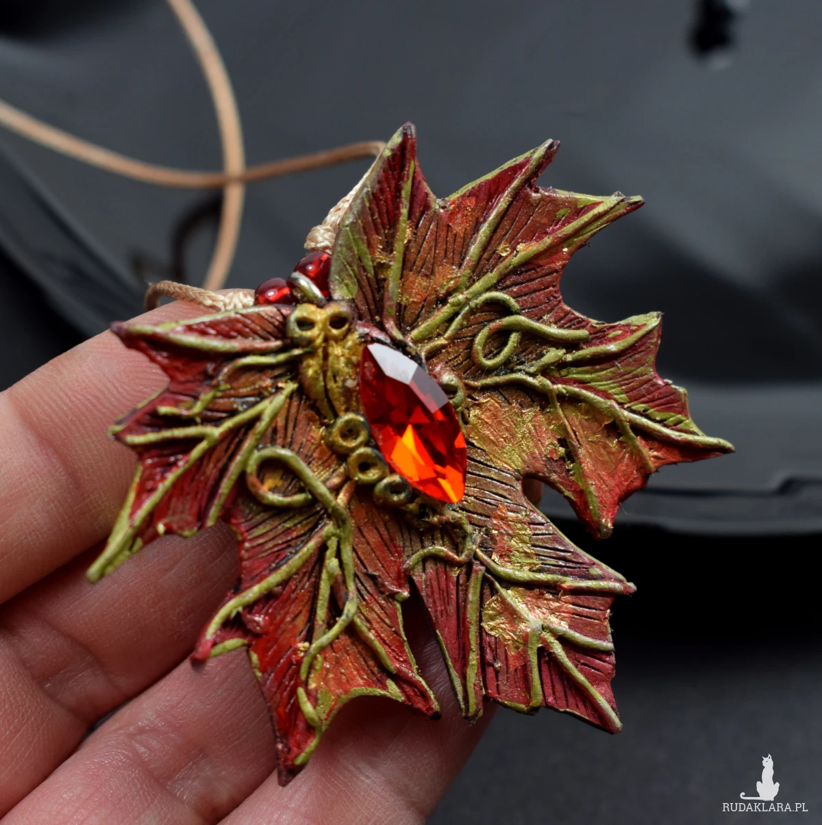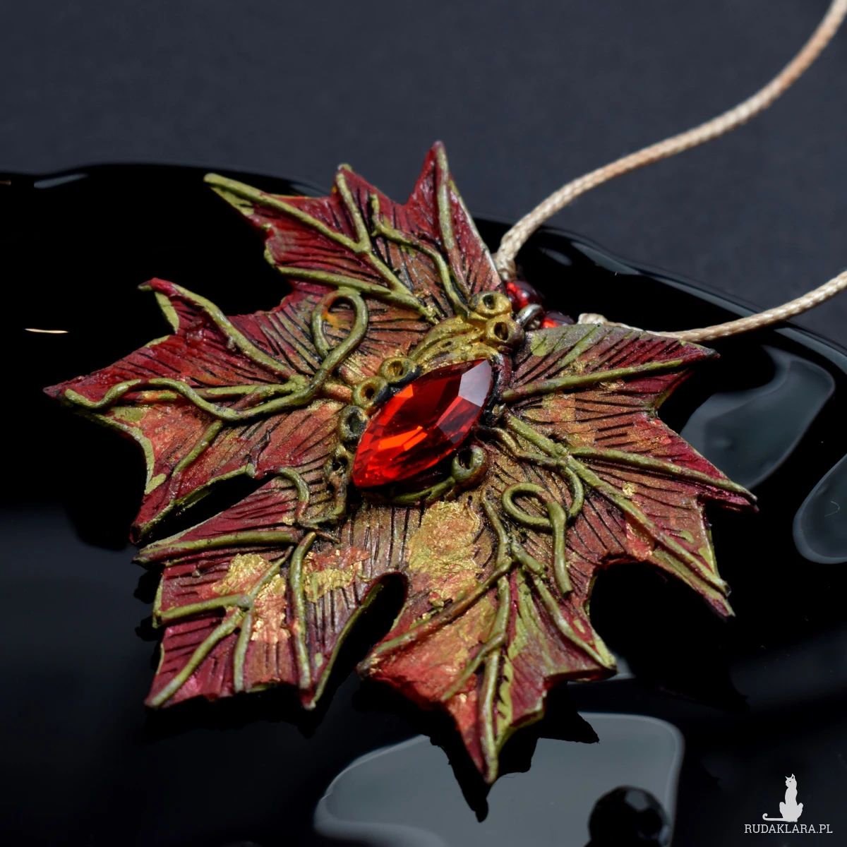 Wyjątkowy wisior w formie liścia klonu, utrzymany w odcieniach czerwieni, bordo i złota.