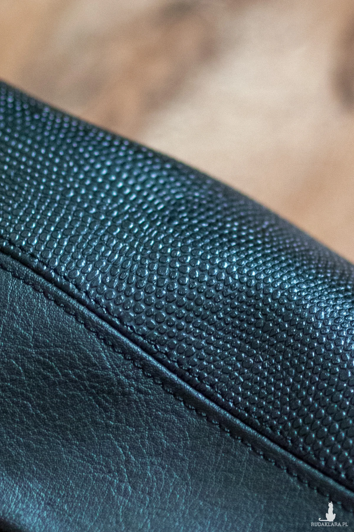 Czarna, bawełniana podszewka, okrągłe dno. Całości dopełnia gruby, bawełniany sznurek w kolorze turkusowym.