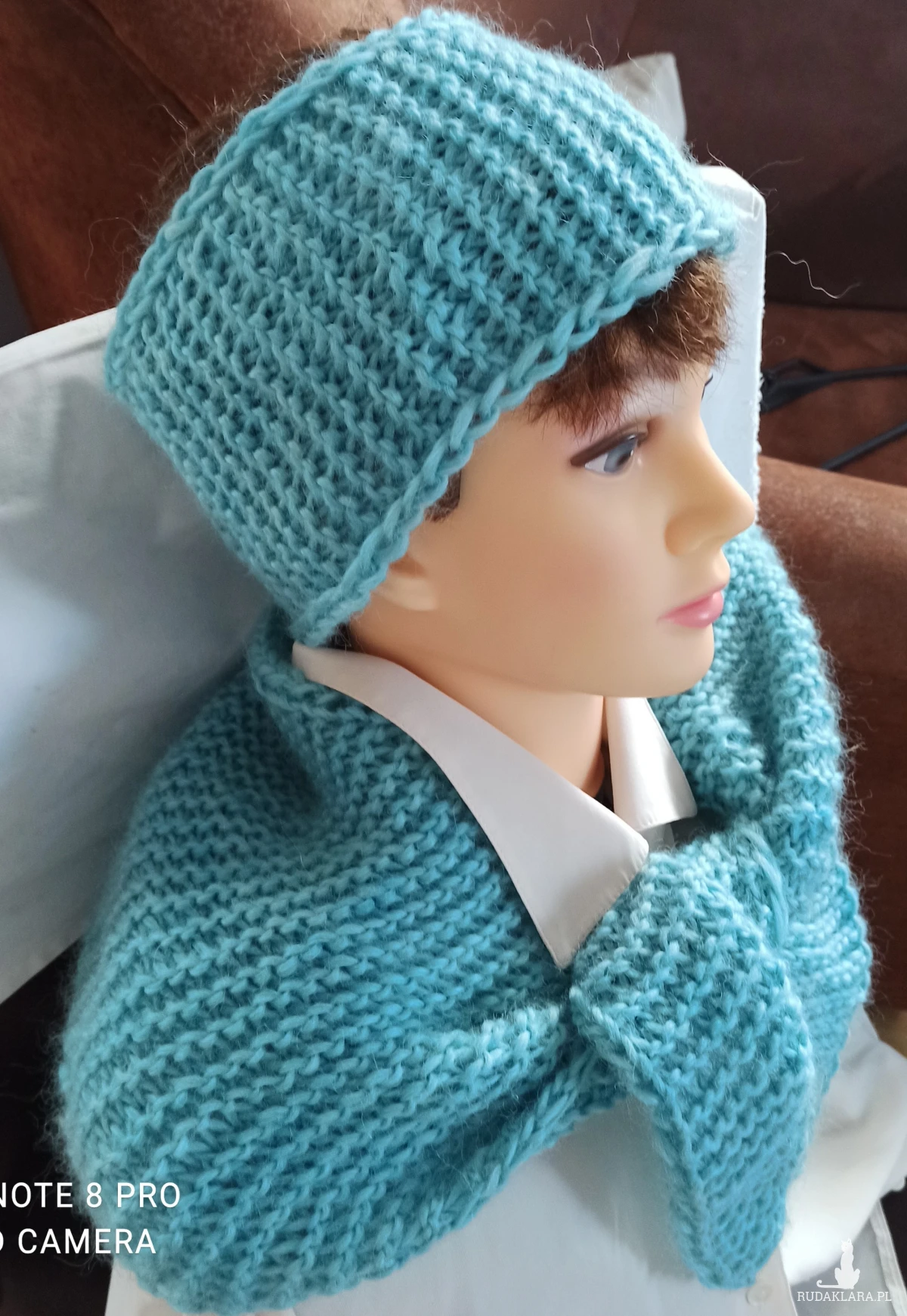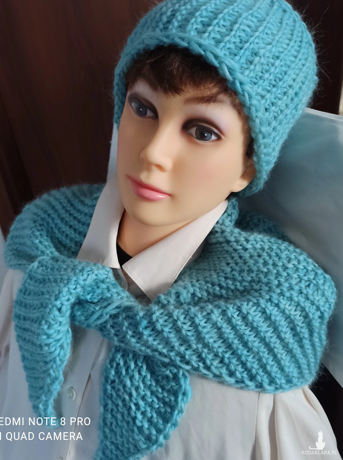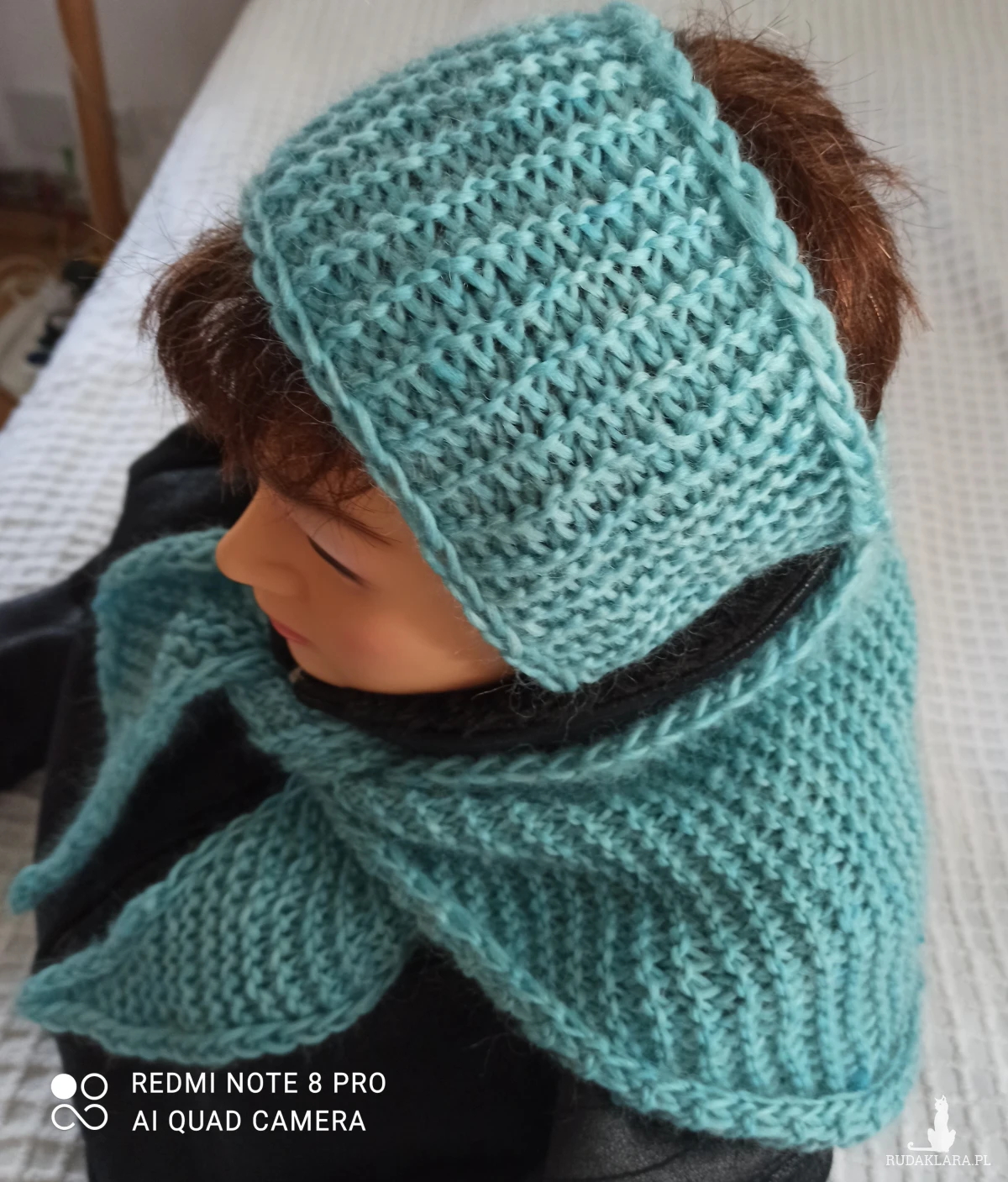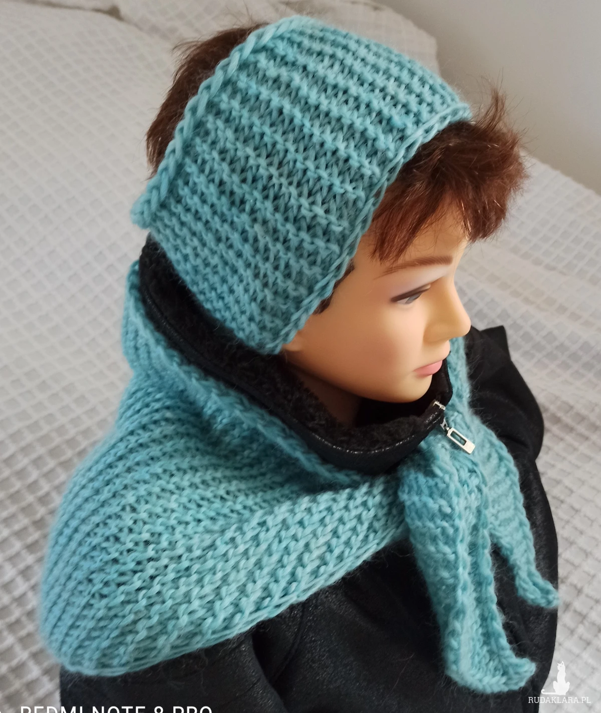 Opaska na głowę/wysokość 12,5 cm, obwód 46 bez rozciągania/ oraz szalik lub chusta w turkusowym kolorze wykonane na drutach z wełny Bel Day . Wyrób bardzo delikatny, mięciutki i bardzo przyjemny w dotyku. Szalik lub chusta wykonany w takim kształcie by można go dwojako używać. Najszerszy pośrodku 27 cm, zwęża się w obu kierunkach. Całkowita długość 116 cm. Nie rozciąga się ale jest podatny na wydłużenie. Przy różnej pogodzie można wykorzystać wyrób jako tradycyjny szalik, chusta na bluzkę lub chusta bezpośrednio na głowę lub na czapkę z daszkiem. Na odzież wierzchnią lub na bluzkę jako ozdoba. Doskonały komplet na chłodniejszą lub nawet zimną pogodę. Kolor bardzo modny. Wykonany na drutach prawymi oczkami. Doradzam wyłącznie pranie ręczne, w temperaturze do 30 stopni. Gorąco polecam, niska cena.