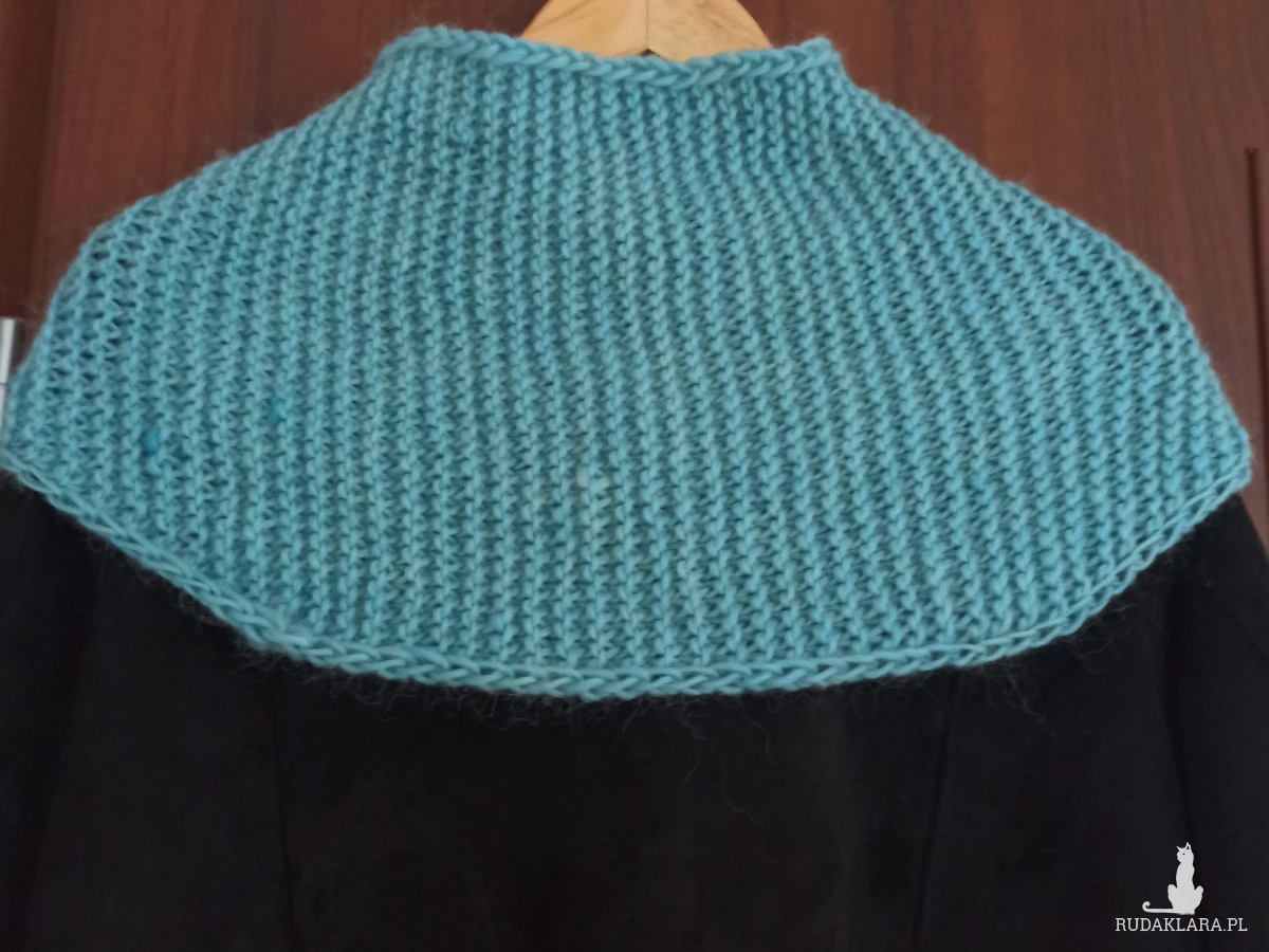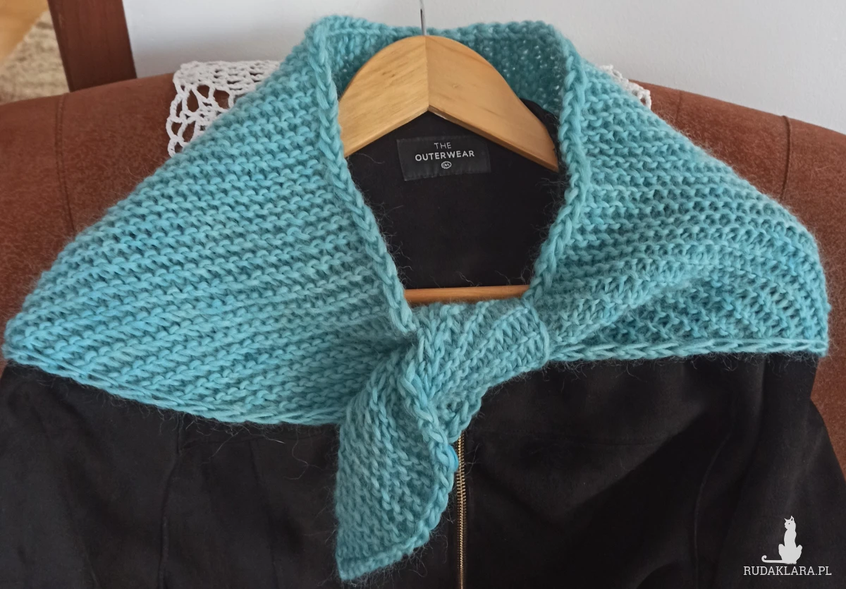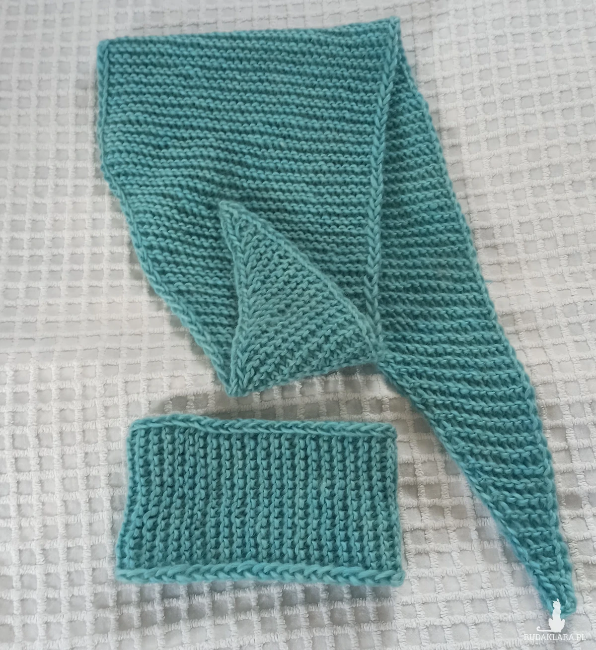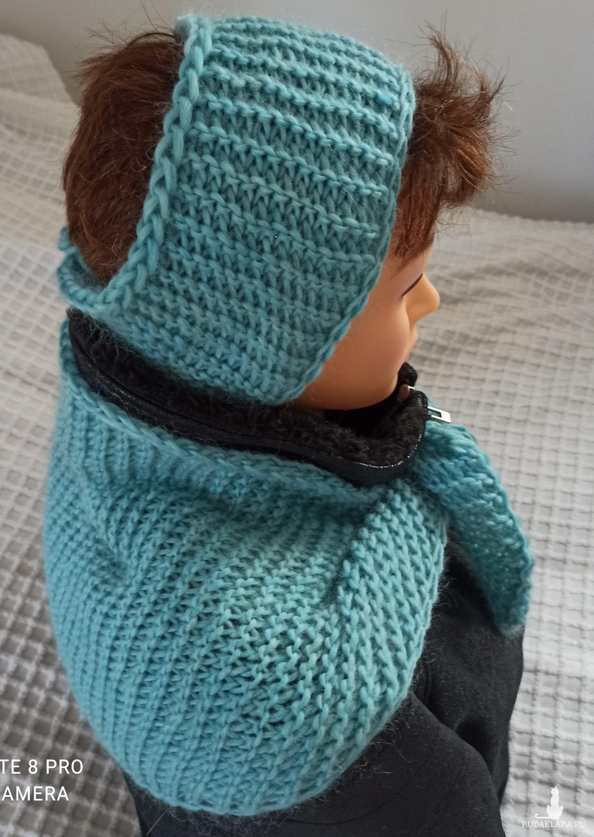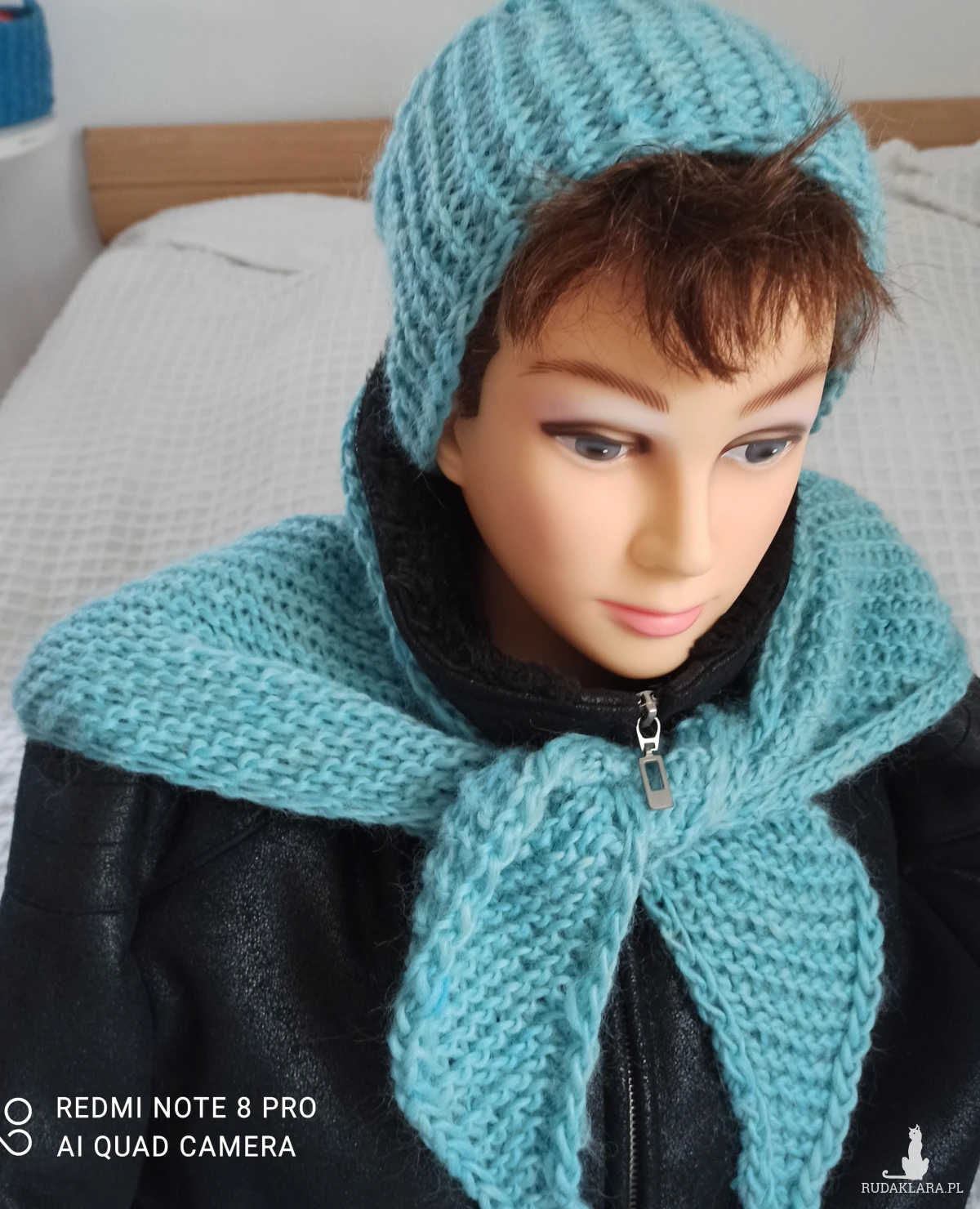 Opaska na głowę/wysokość 12,5 cm, obwód 46 bez rozciągania/ oraz szalik lub chusta w turkusowym kolorze wykonane na drutach z wełny Bel Day . Wyrób bardzo delikatny, mięciutki i bardzo przyjemny w dotyku. Szalik lub chusta wykonany w takim kształcie by można go dwojako używać. Najszerszy pośrodku 27 cm, zwęża się w obu kierunkach. Całkowita długość 116 cm. Nie rozciąga się ale jest podatny na wydłużenie. Przy różnej pogodzie można wykorzystać wyrób jako tradycyjny szalik, chusta na bluzkę lub chusta bezpośrednio na głowę lub na czapkę z daszkiem. Na odzież wierzchnią lub na bluzkę jako ozdoba. Doskonały komplet na chłodniejszą lub nawet zimną pogodę. Kolor bardzo modny. Wykonany na drutach prawymi oczkami. Doradzam wyłącznie pranie ręczne, w temperaturze do 30 stopni. Gorąco polecam, niska cena.