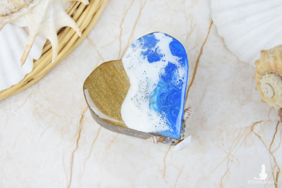 Zanurz się w klimacie nadmorskich wspomnień dzięki tej wyjątkowej szkatułce wykonanej z naturalnego drewna sosnowego. Wewnątrz i na pokrywie znajduje się ręcznie wykonana kompozycja z żywicy epoksydowej, inspirowana morskimi falami – każda sztuka jest unikatowa, jak samo morze.