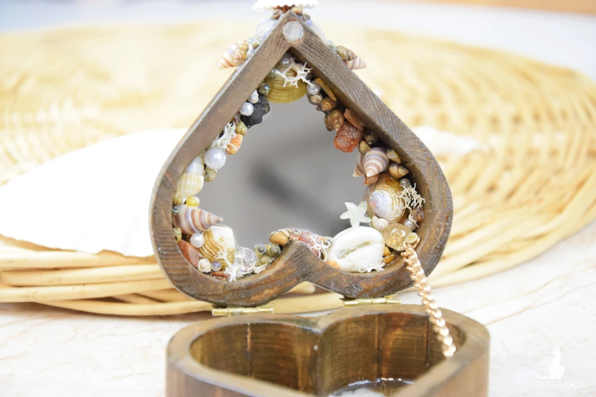 Prawdziwą ozdobą szkatułki jest wbudowane lusterko otoczone autentycznymi, polskimi bursztynami, muszlami i drobnymi elementami przywołującymi klimat nadbałtyckich plaż.