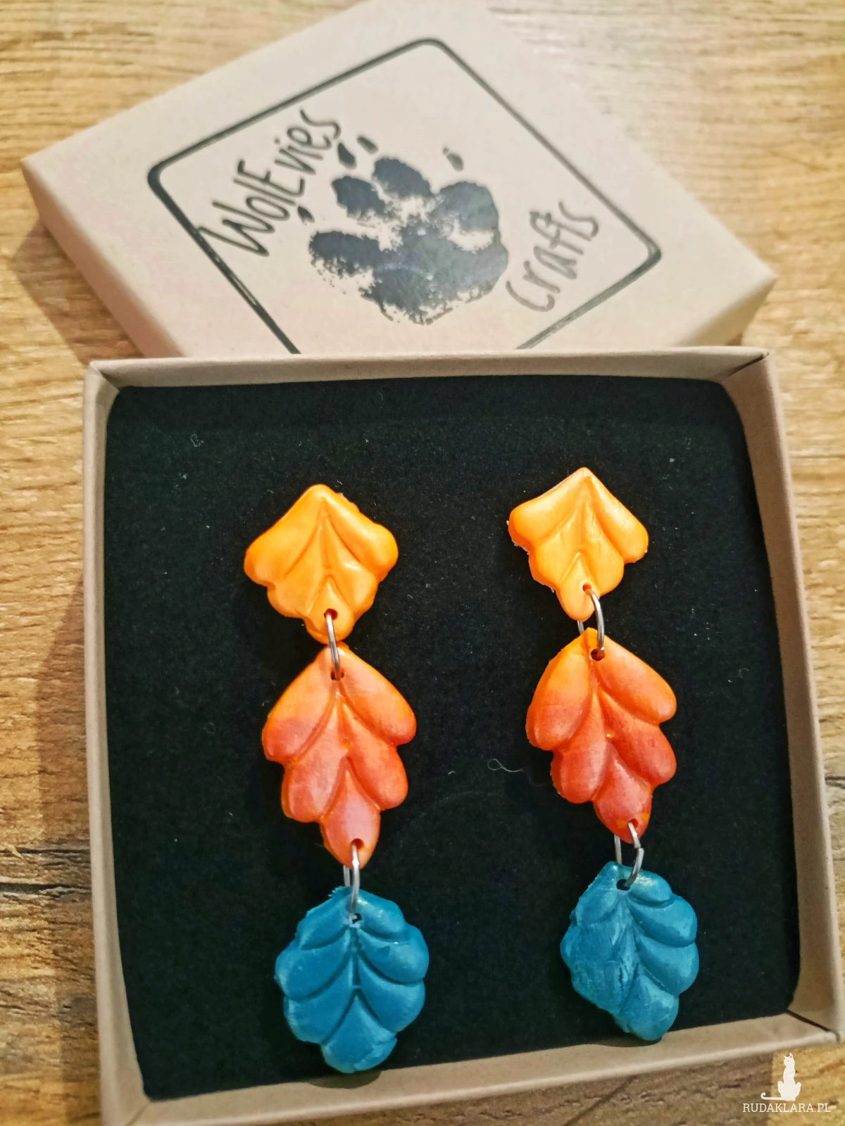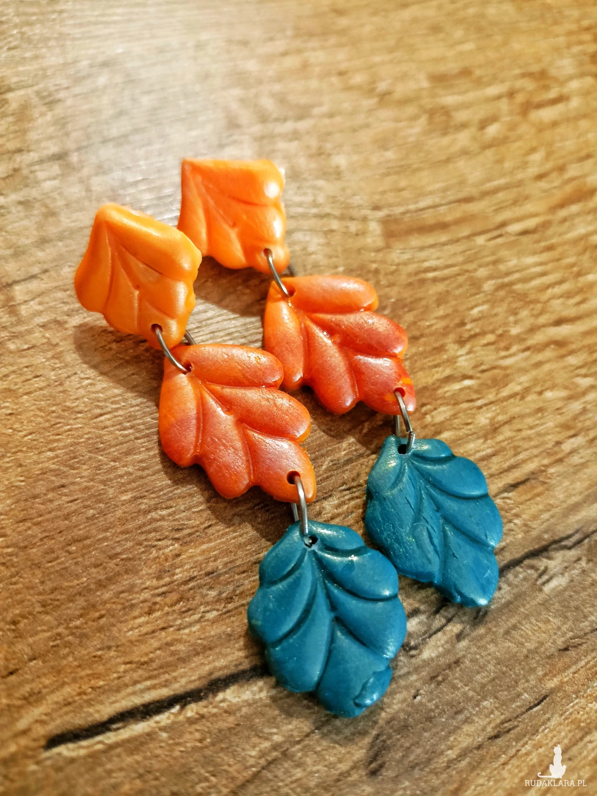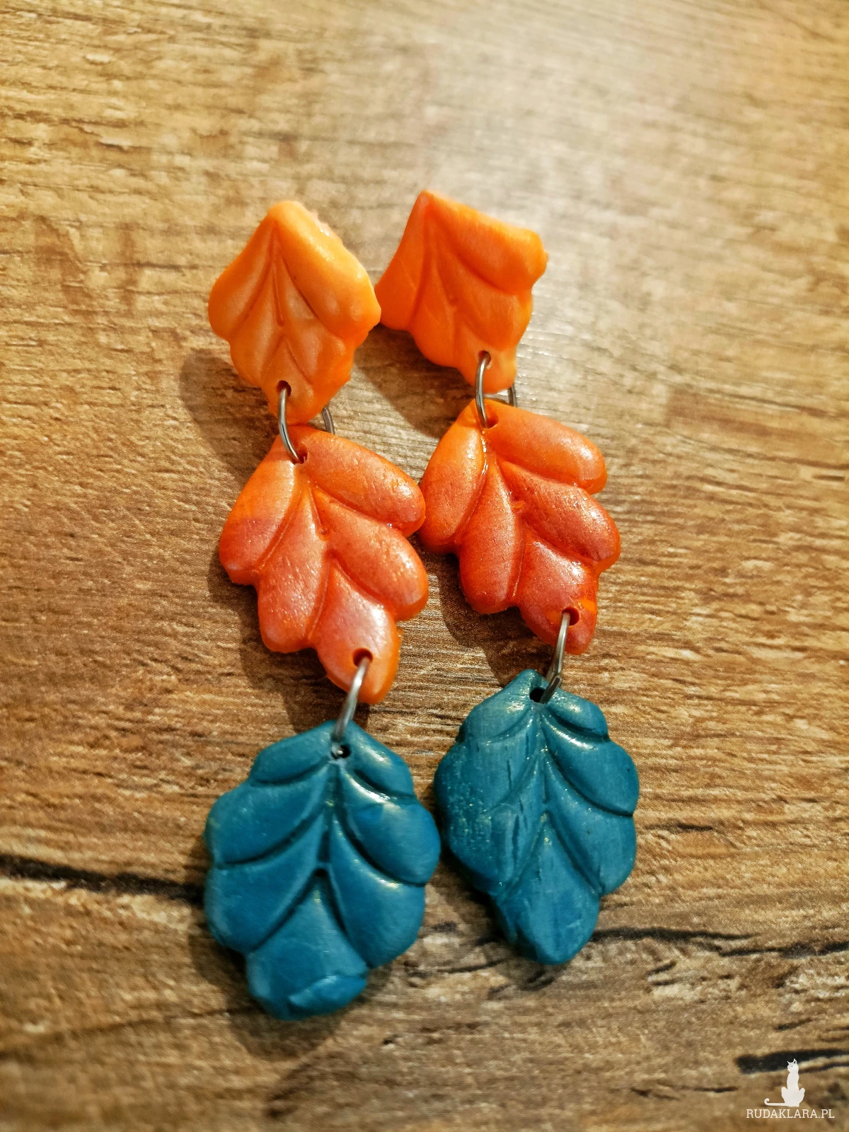 kolczyki jesienne handmade • kolczyki listki handmade • kolczyki z glinki polimerowej • kolczyki perłowe błyszczące • biżuteria handmade jesień • kolczyki pomarańczowo-zielone • kolczyki handmade prezent • kolczyki zabezpieczone żywicą • unikatowa biżuteria handmade • kolczyki handmade pudełeczko