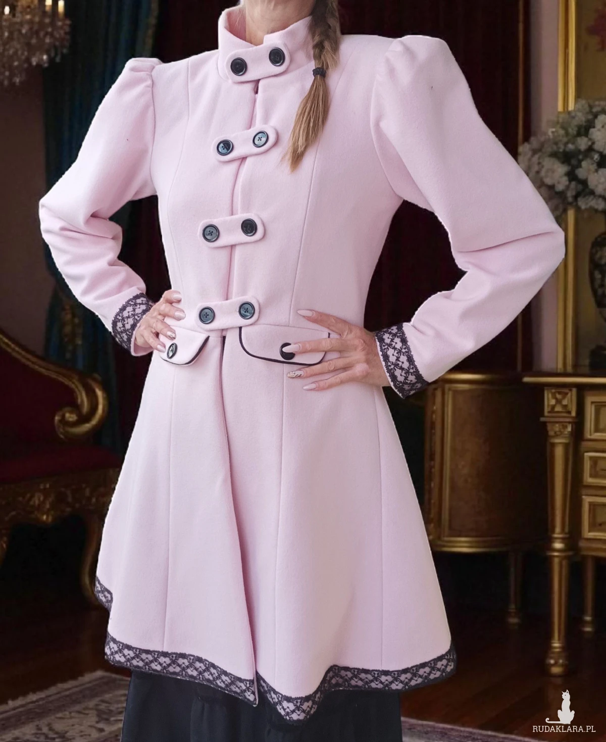 Do sprzedaży płaszcz retro szyty z flauszu ozdobiony czarna koronka i czarna aksamitką regulowany z tyłu podszyty bawełniana podszewką z pelerynka która jest osobna częścią a do pelerynki dopinana mufka do ogrzania rąk.