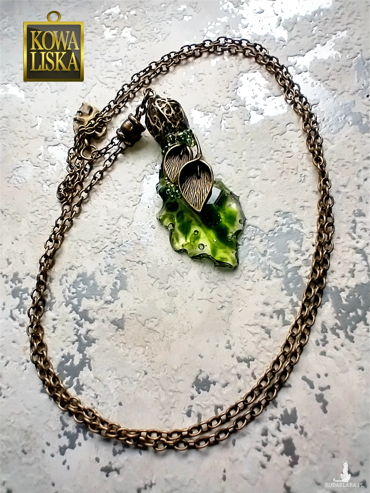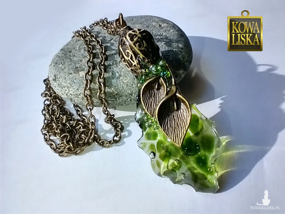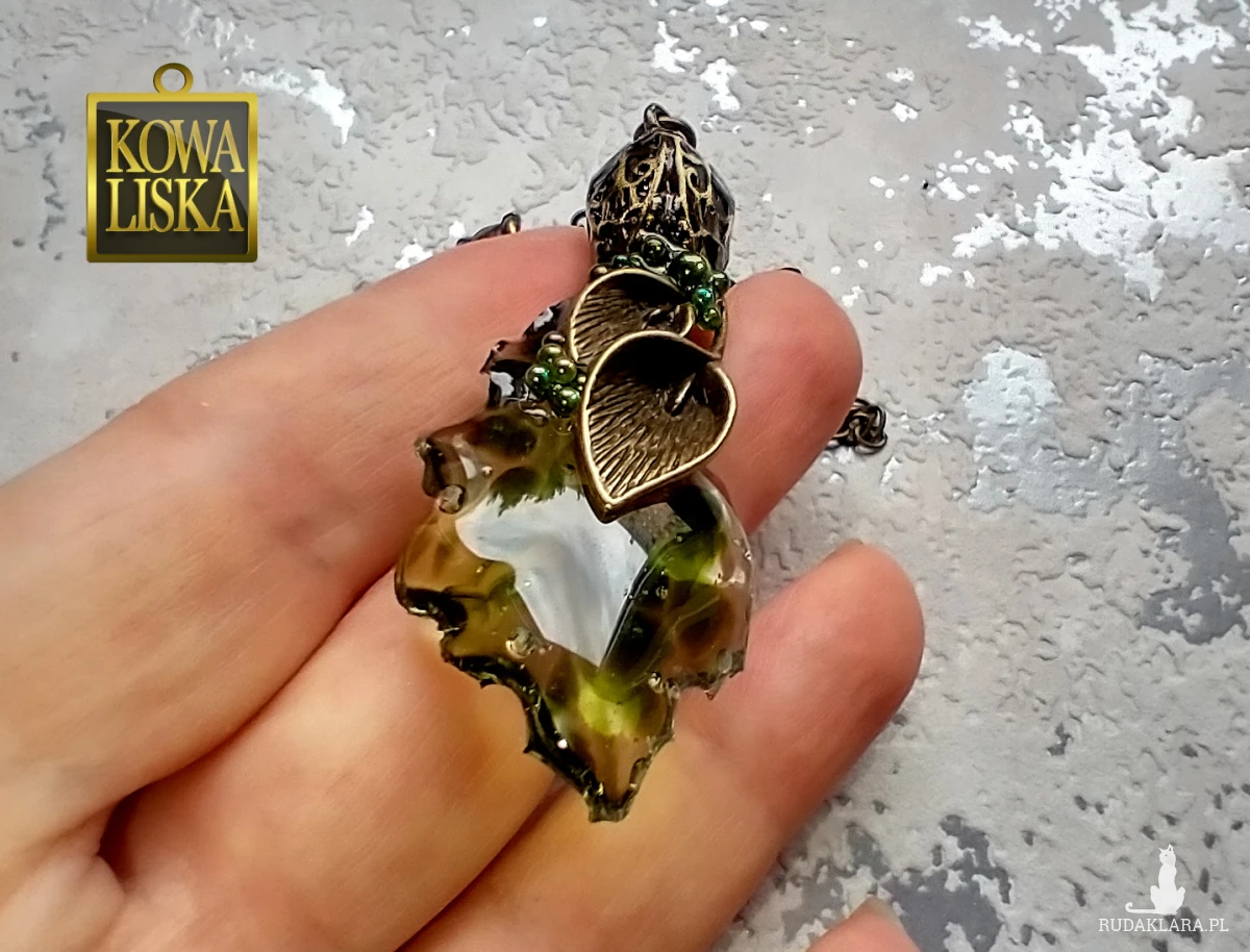 Ciekawy, żywiczny element wisiora w pięknym, oliwkowym odcieniu, przywodzi na myśl świat wydobyty z dna stawu: szklisty osad, drobne kuleczki-bąbelki, ciemniejsze żyłowania. Przezroczysta całość "wylewa" się spod roślinnych elementów, połączonych i zebranych "dzwonkiem" w kolorze antycznego brązu.