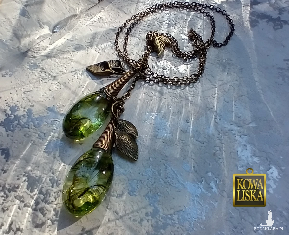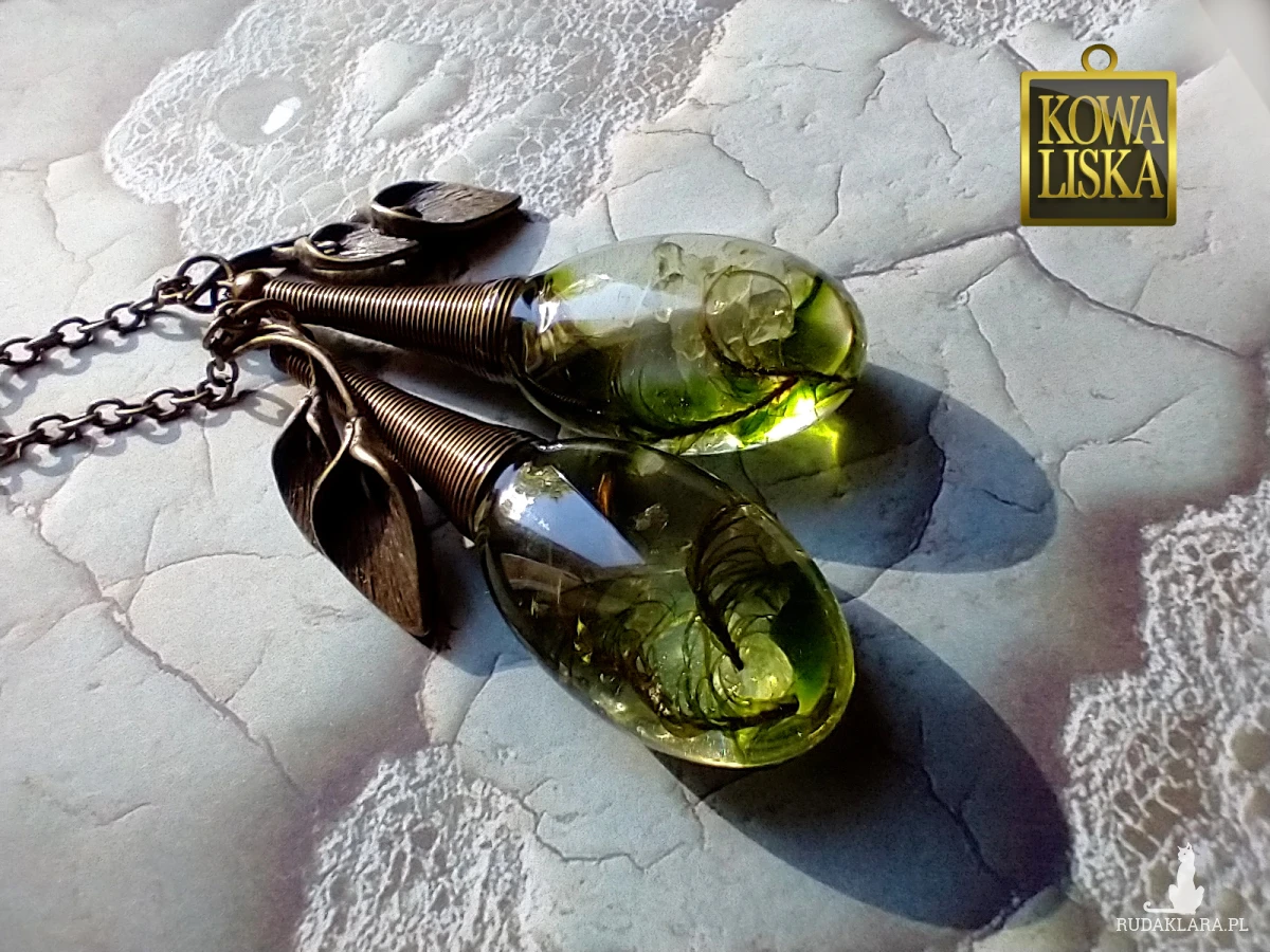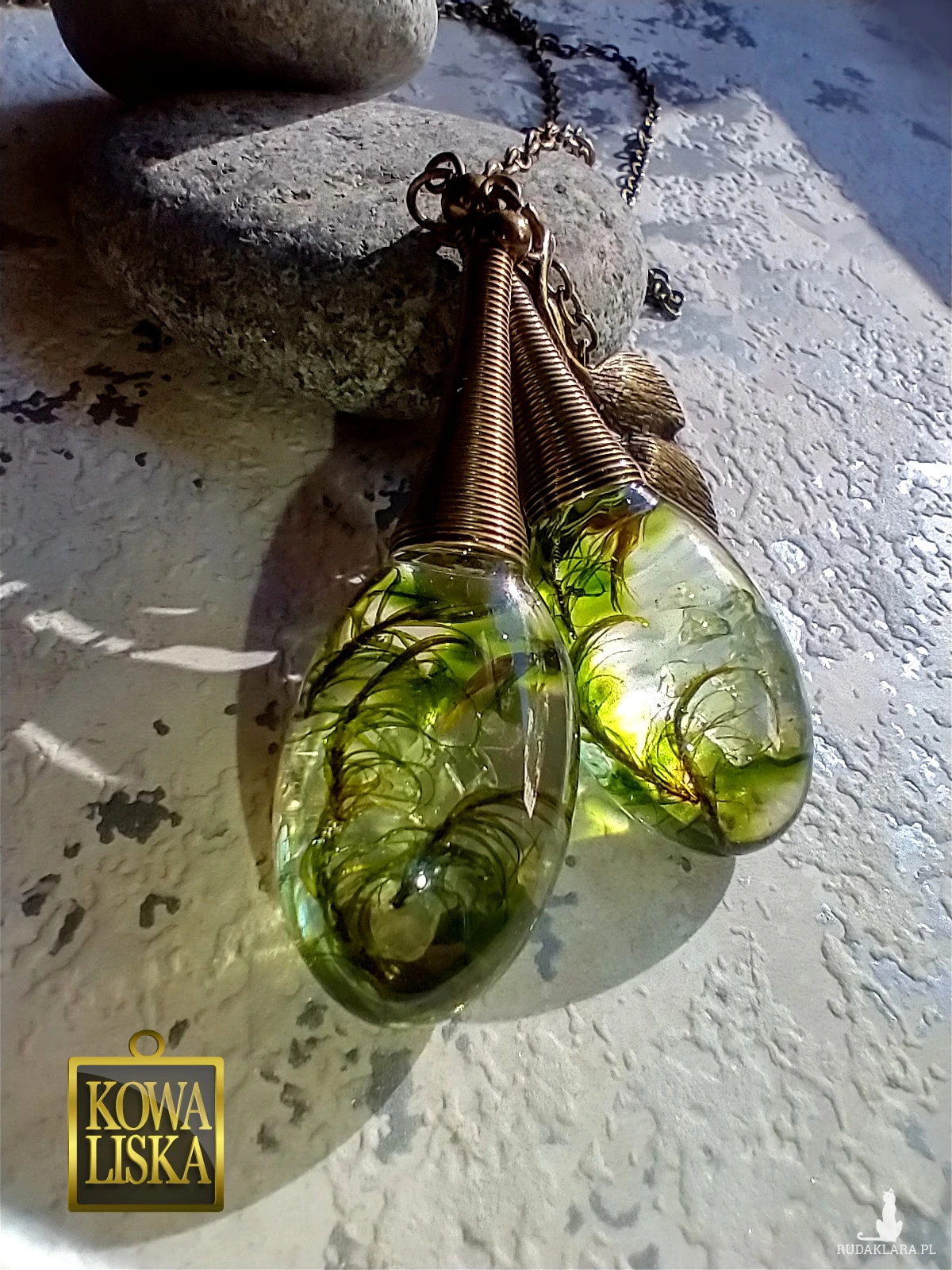 Dwie duże, wypukłe żywiczne krople oprawione w metalowe elementy w kolorze antycznego brązu, podwieszone asymetrycznie na masywnym, metalowym łańcuchu.