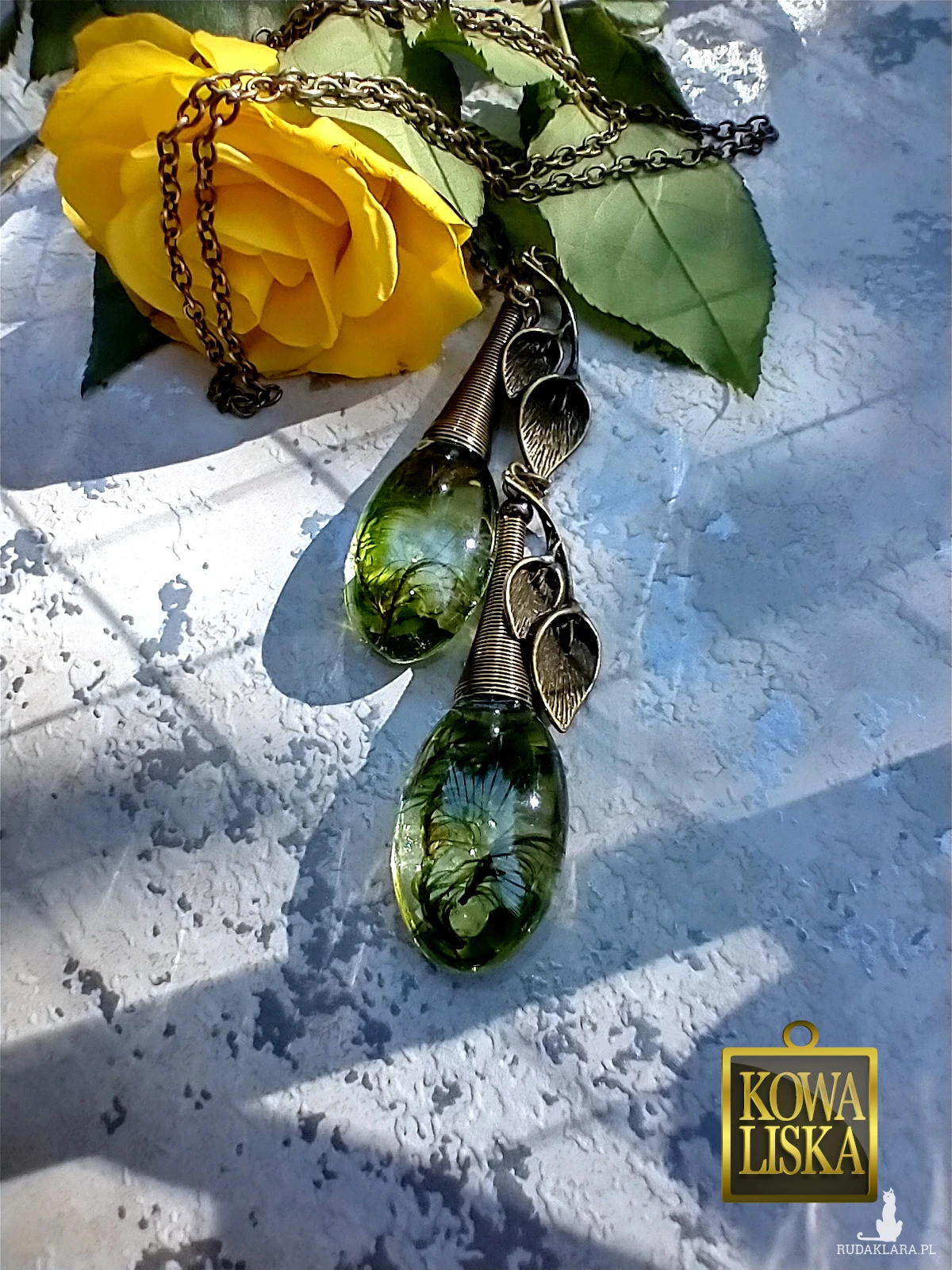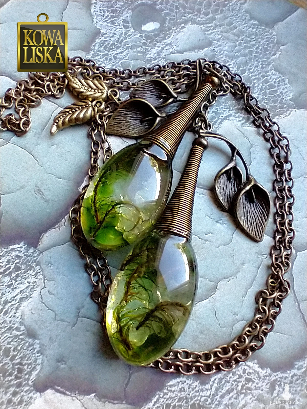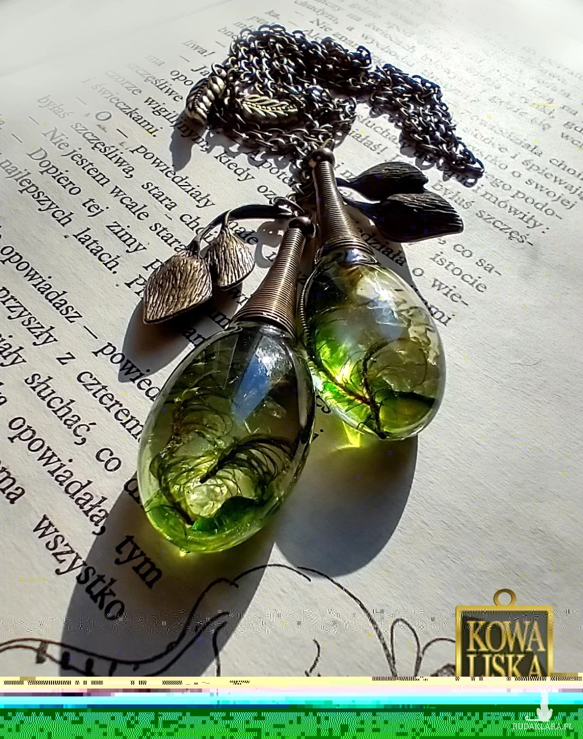 Dwie duże, wypukłe żywiczne krople oprawione w metalowe elementy w kolorze antycznego brązu, podwieszone asymetrycznie na masywnym, metalowym łańcuchu.