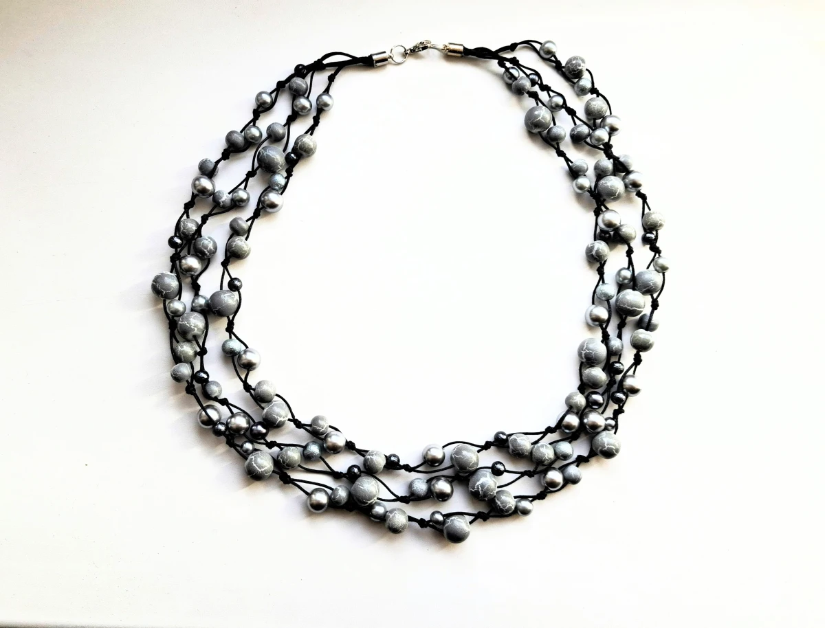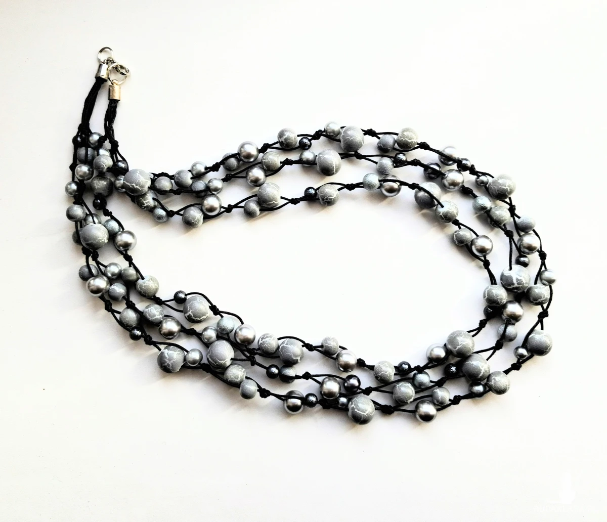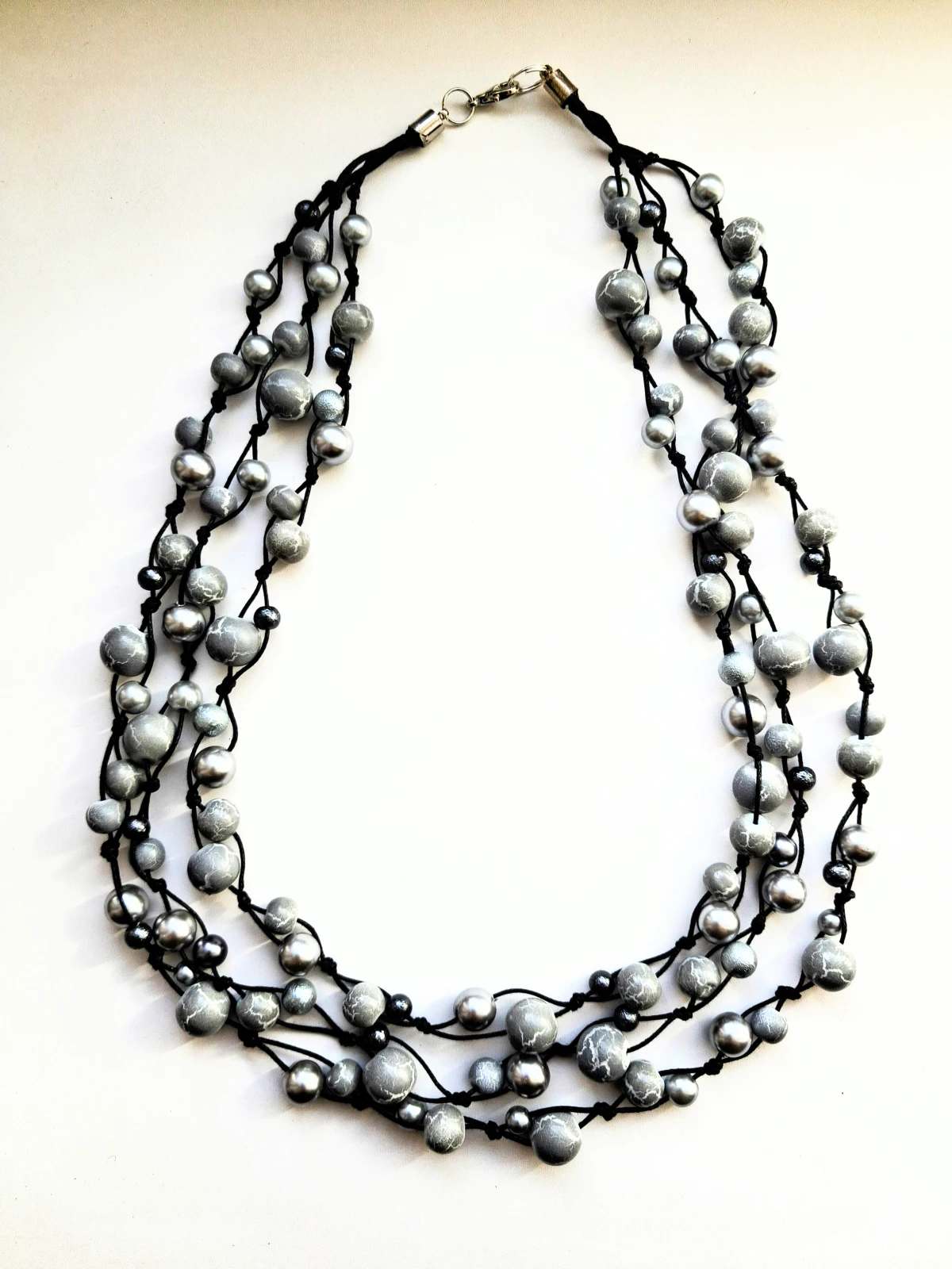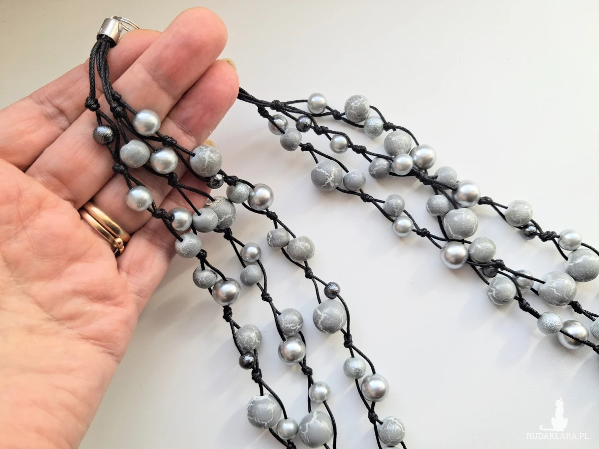 Niezwykły naszyjnik wykonany ręcznie w jednym egzemplarzu z pereł, koralików szklanych i 6 sznurków z bawełny woskowanej.