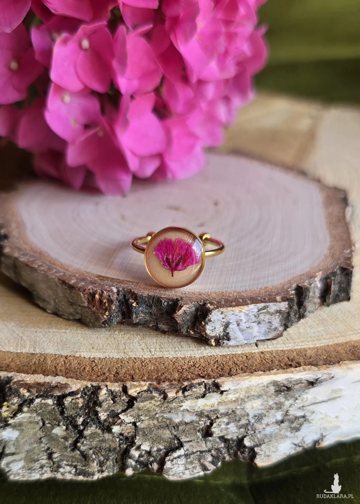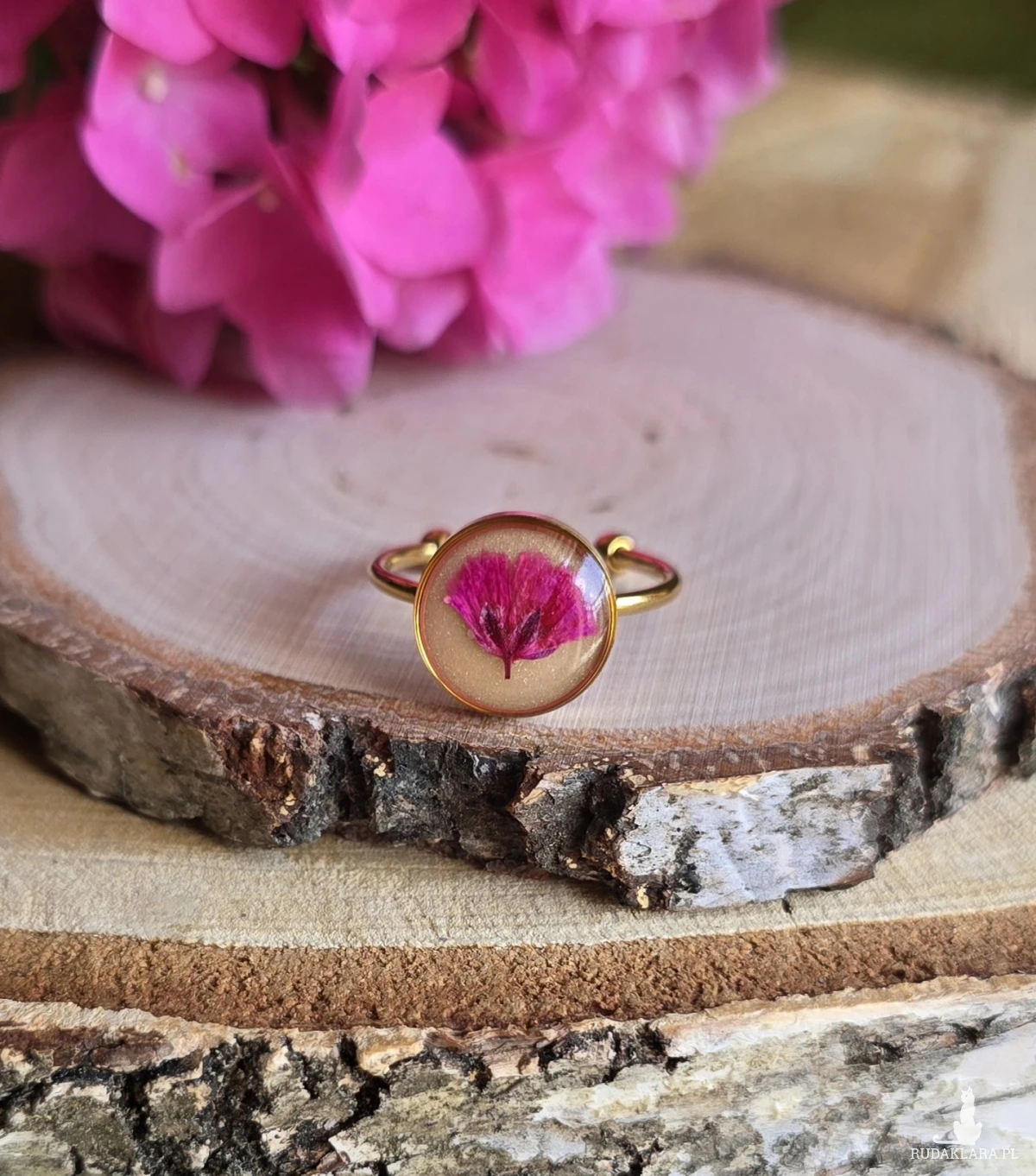 Oferuję Państwu unikalną biżuterię. Pierścionek jest wykonany z suszonych kwiatów i żywicy epoksydowej. Biżuteria jest wspaniałym i oryginalnym prezentem na lata.