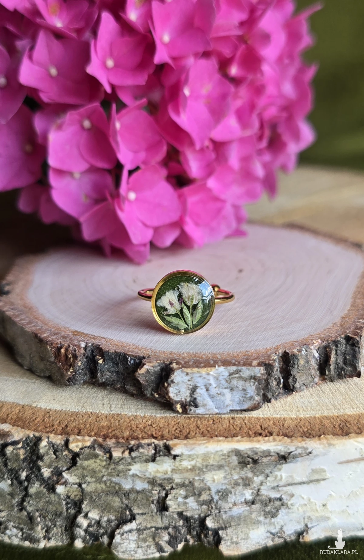 Oferuję Państwu unikalną biżuterię. Pierścionek jest wykonany z suszonych kwiatów i żywicy epoksydowej. Biżuteria jest wspaniałym i oryginalnym prezentem na lata.