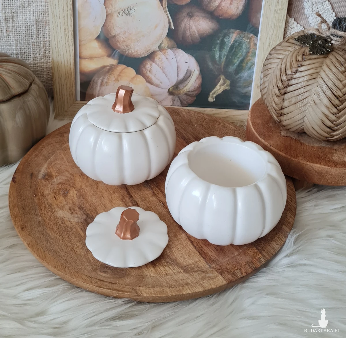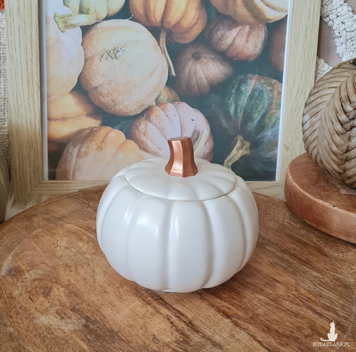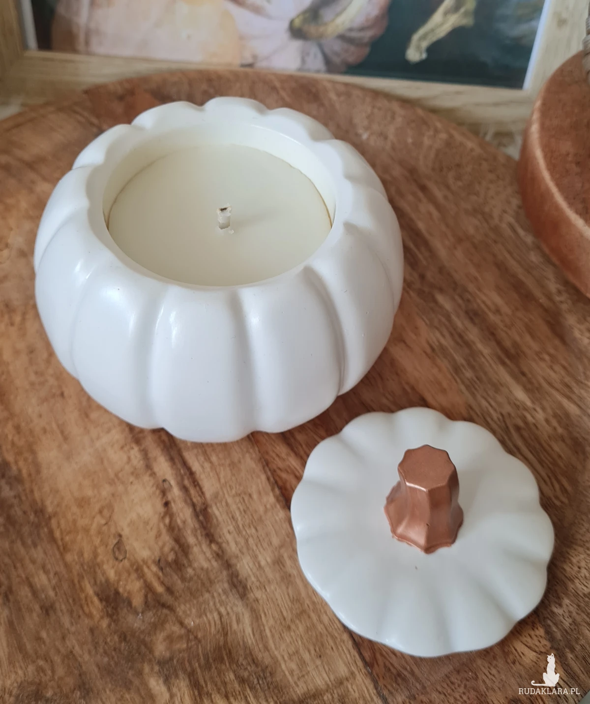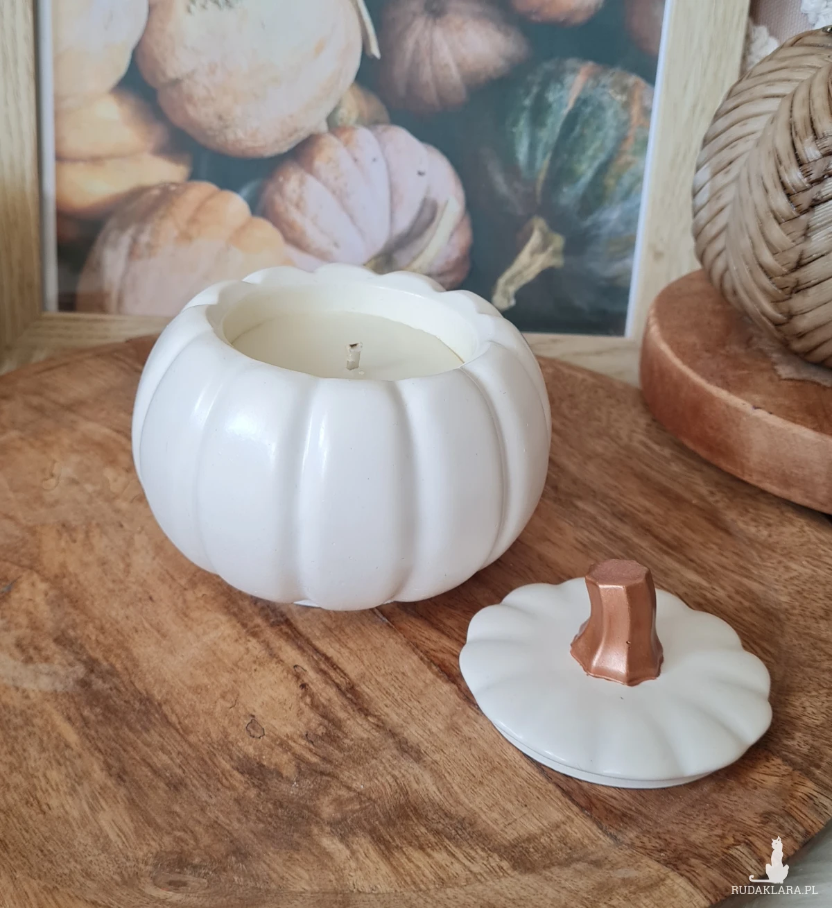 Świeczka dynia wykonana ręcznie z gipsu polimerowego, idealna ozdoba jesienna. Jest zabezpieczona specjalnym lakierem dzięki, któremu jest odporna na wodę lub wosk. W środku wypełniona jest woskiem sojowym o pięknym zapachu grzanego wina