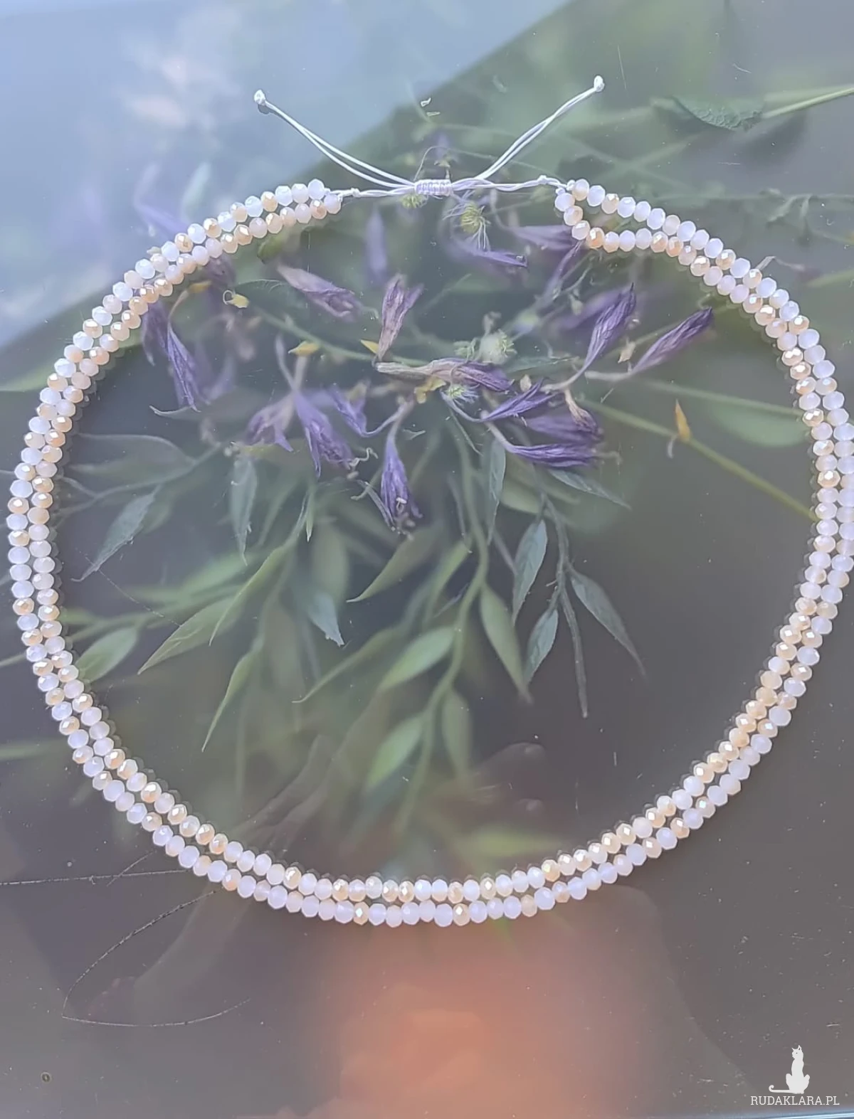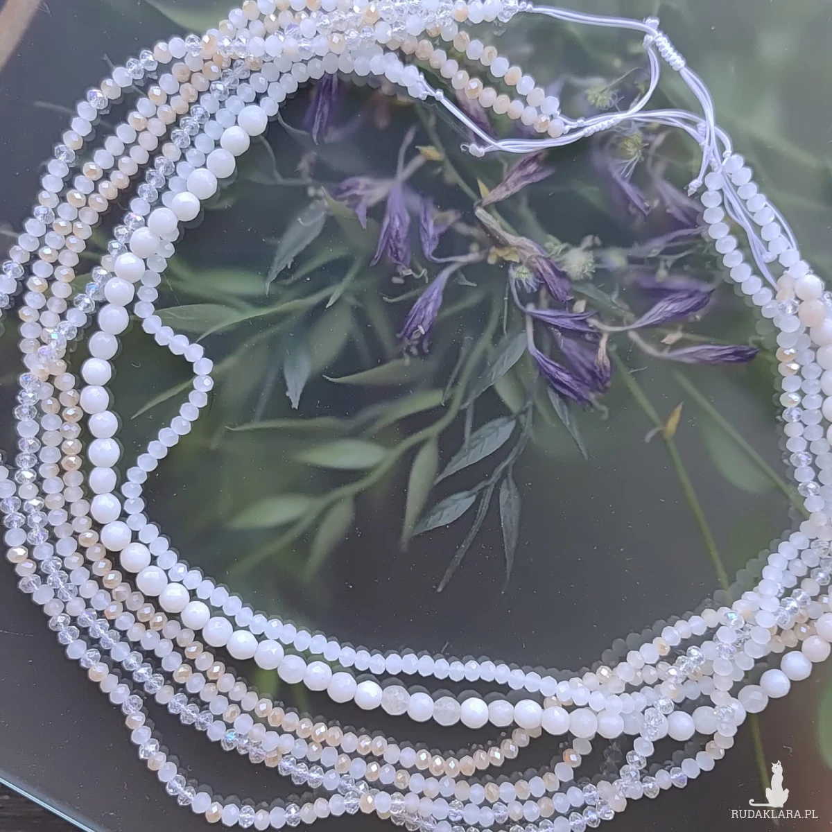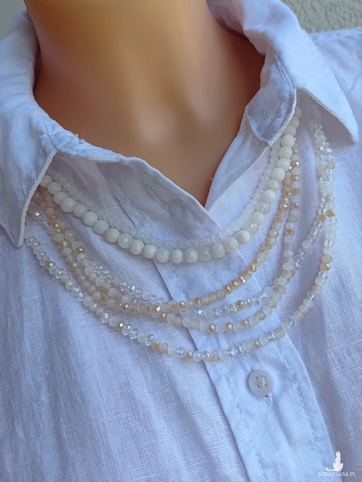 Naszyjnik kaskadowy z kamieni i szklanych koralików. Jadeit kulka 7 mm, koraliki szklane fasetowane beżowe, eqrue i białe transparentne kryształki. Sznurek syntetyczny. Dwa x2  sznurki. Każdy z naszyjników można nosić oddzielnie. Można również nosić jako bransoletkę. Zapięcie wyplecione ze sznurka ściegiem makramowym co pozwala na regulację. Maksymalny obwód 52 cm, należy zmierzyć obwód głowy.