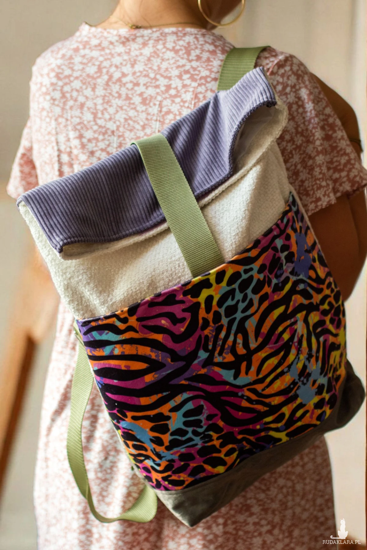Duży, damski plecak miejski składany i zapinany na rzep wykonany z kilku rodzajów tkanin.