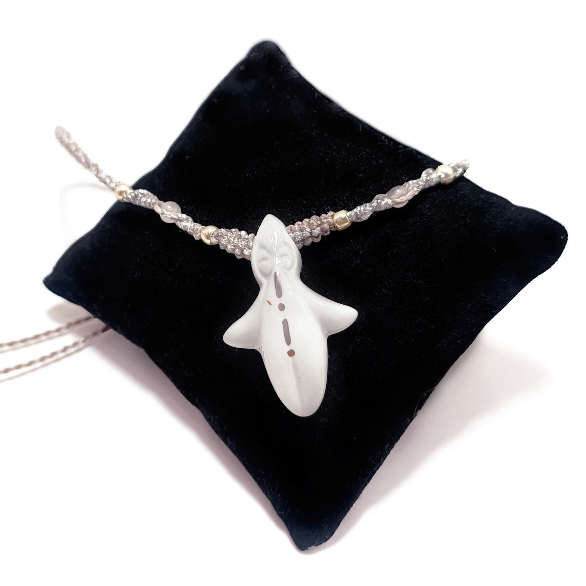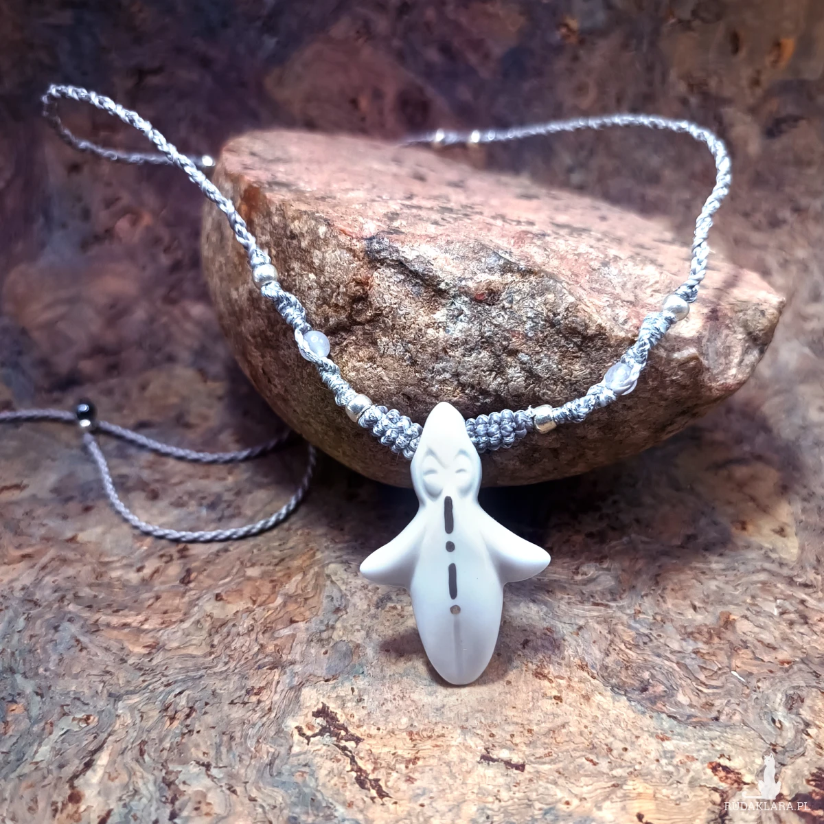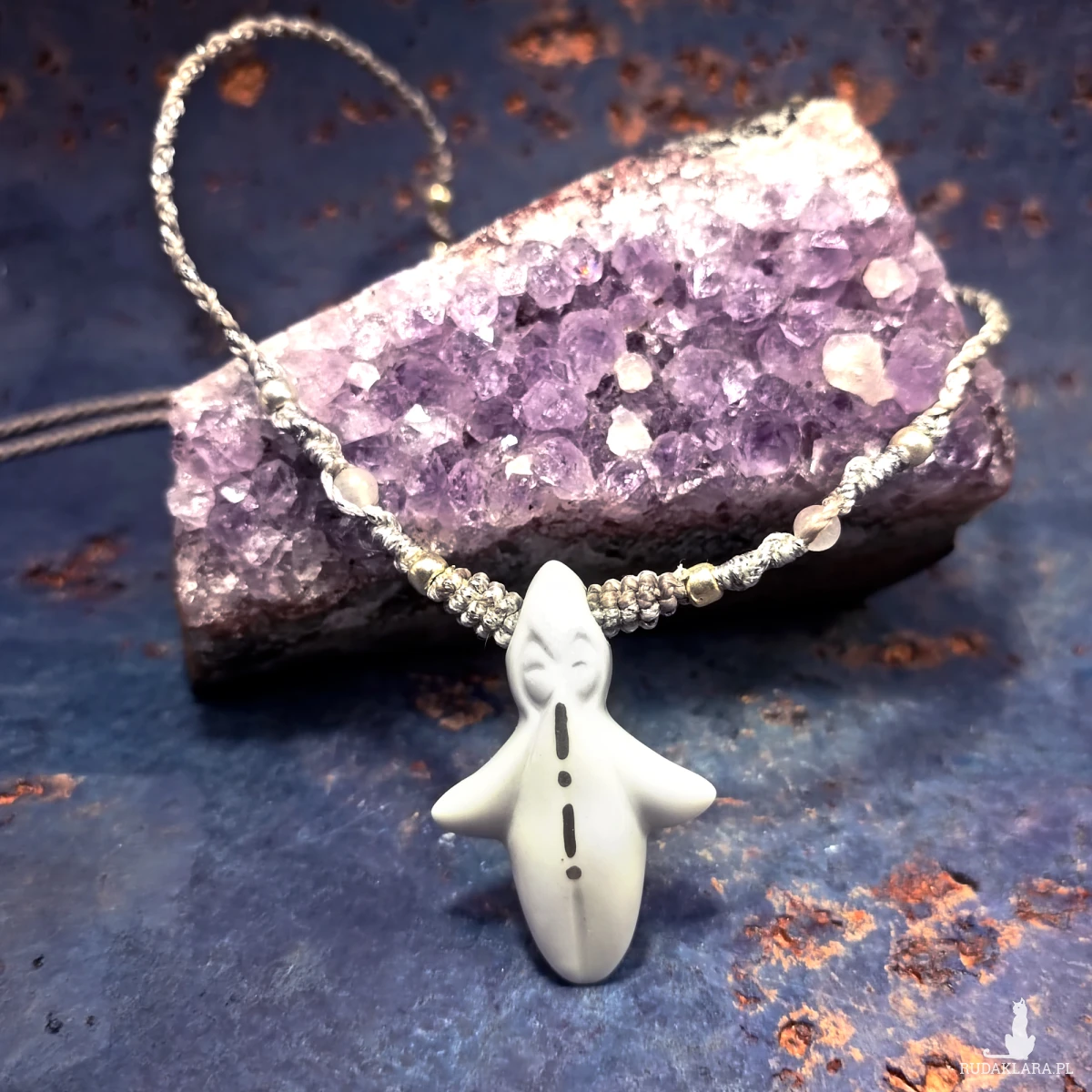 Talizman wykonany jest z porcelany, pokryty błyszczącym szkliwem i platyną. Oprawiony jest techniką mikromakramy, wykonaną ze sznurka o doskonałej jakości z dodatkiem agatów, jadeitu i szklanych koralików w kolorze złotym. Sam wisiorek ma 4 cm wysokości.