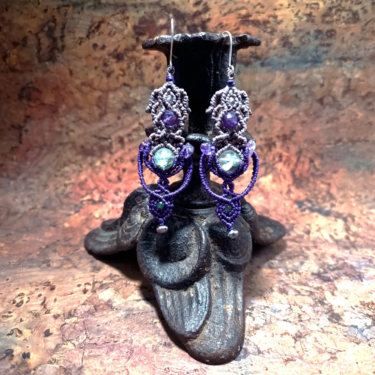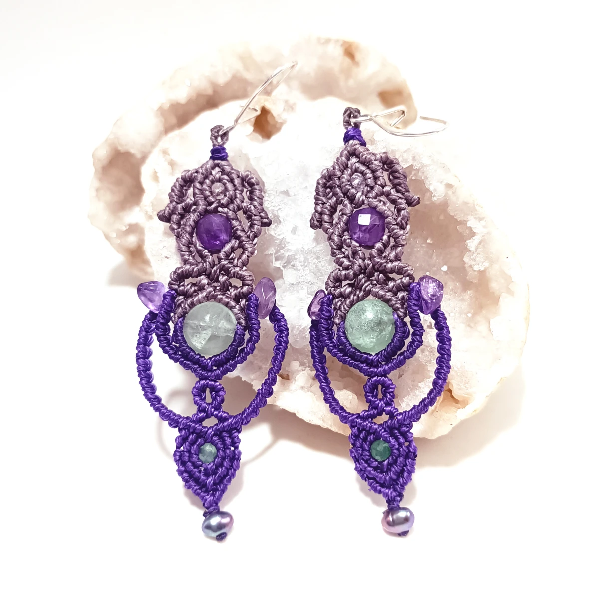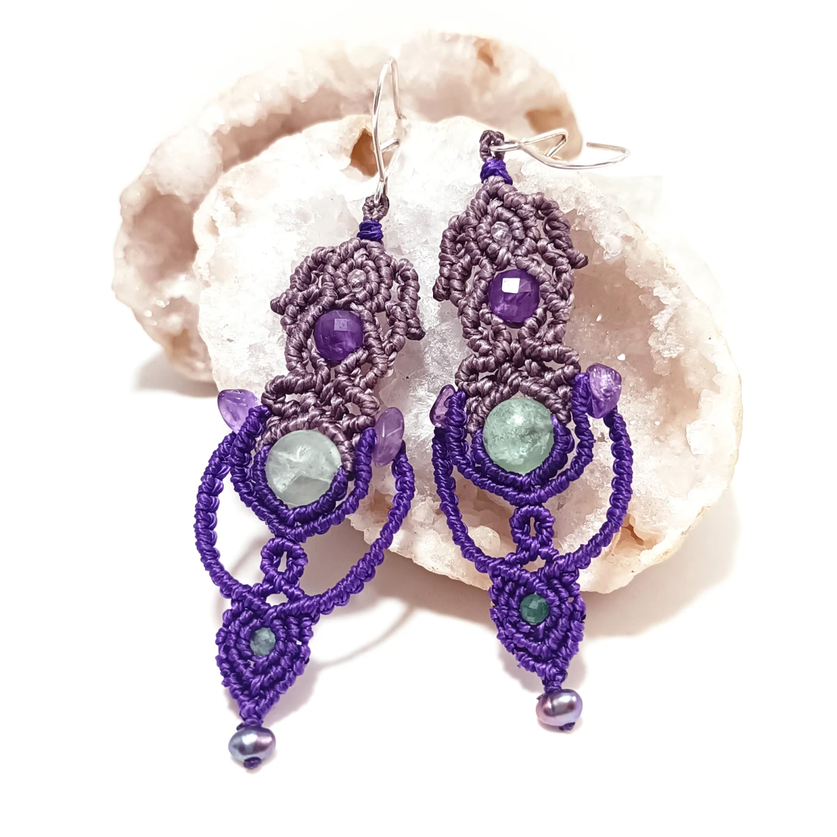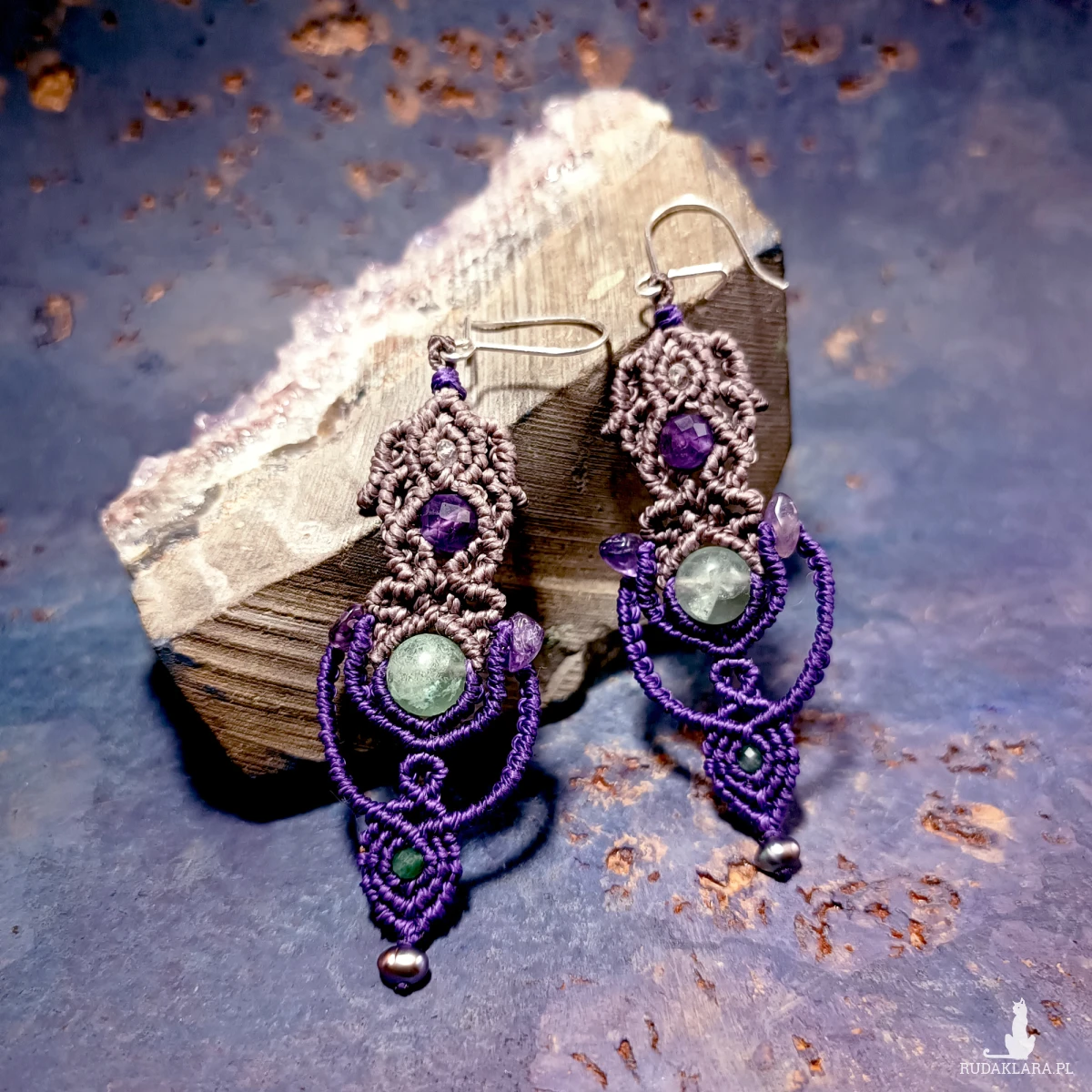 Użyte kamienie to: fluoryt, ametyst, szmaragd, perła.
