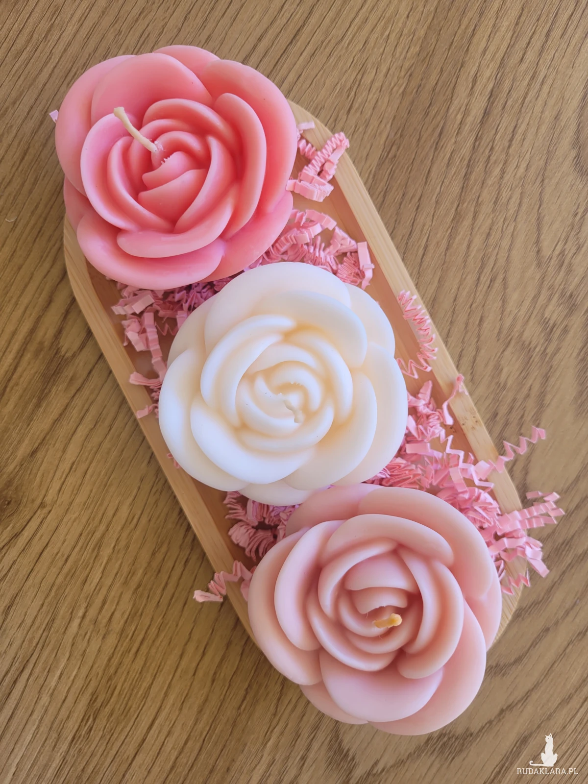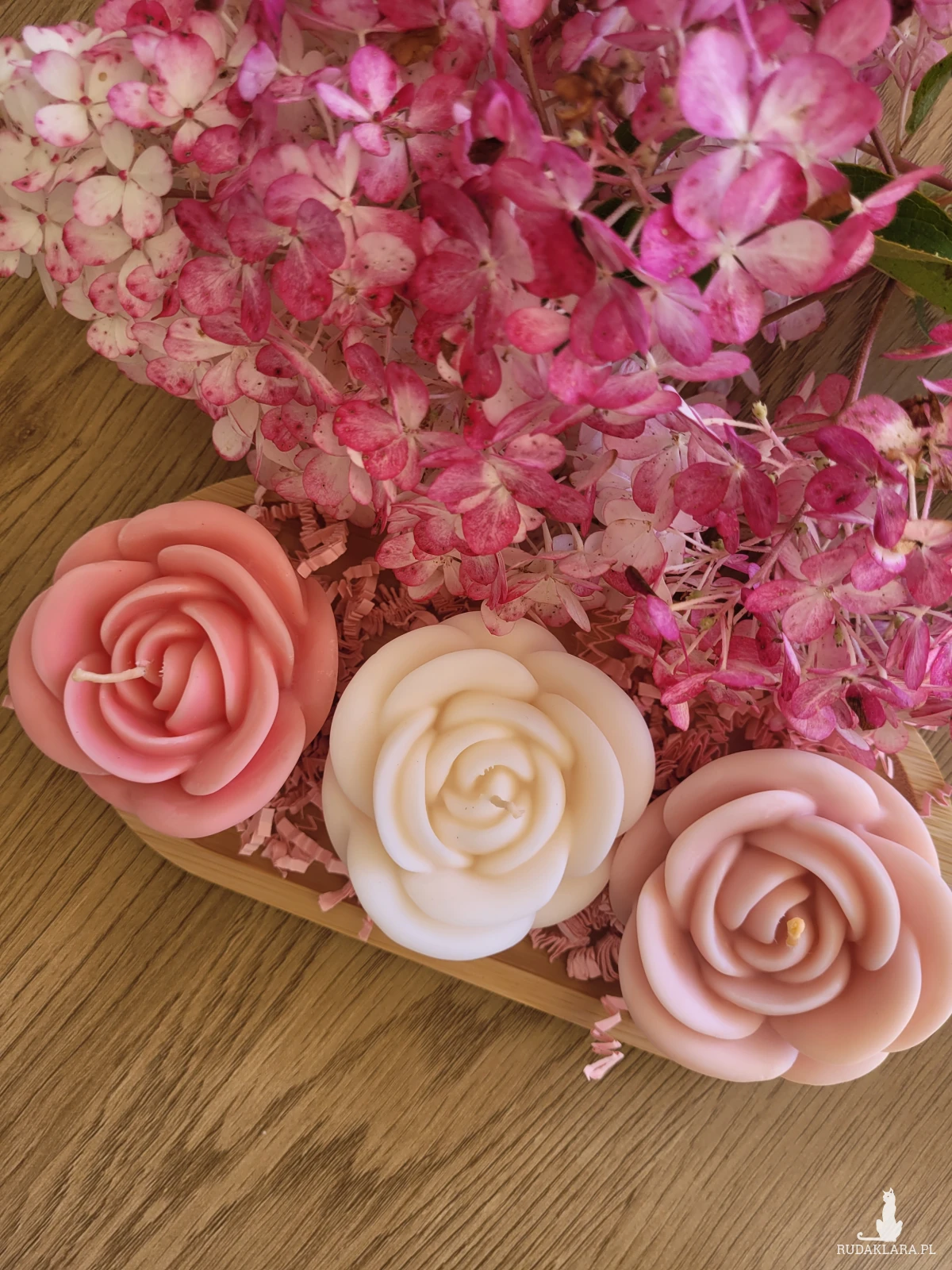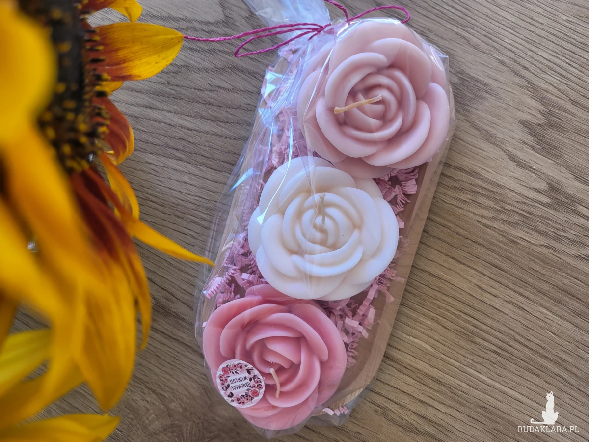 Zestaw upominkowy świec sojowych na drewnianej tacy.